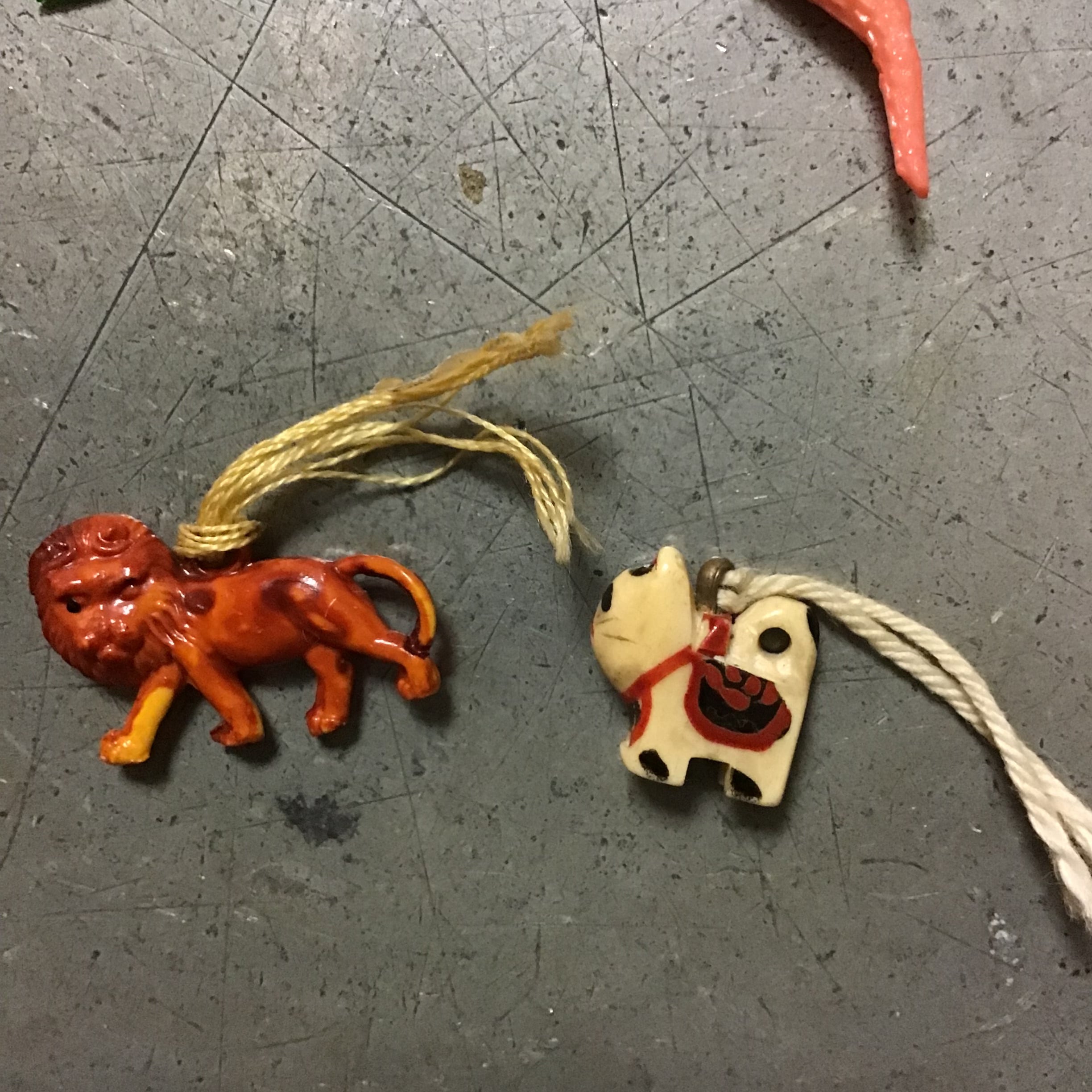 1950年代頃のガムボールのおまけチャーム、ライオンです。当時の紐がそのまま付いており、ブローチやネックレスにしたり、襟の先やお気に入りのポーチに縫い付けても可愛いです♡ボールチェーンをお付けしますので必要に応じてお使いください◎