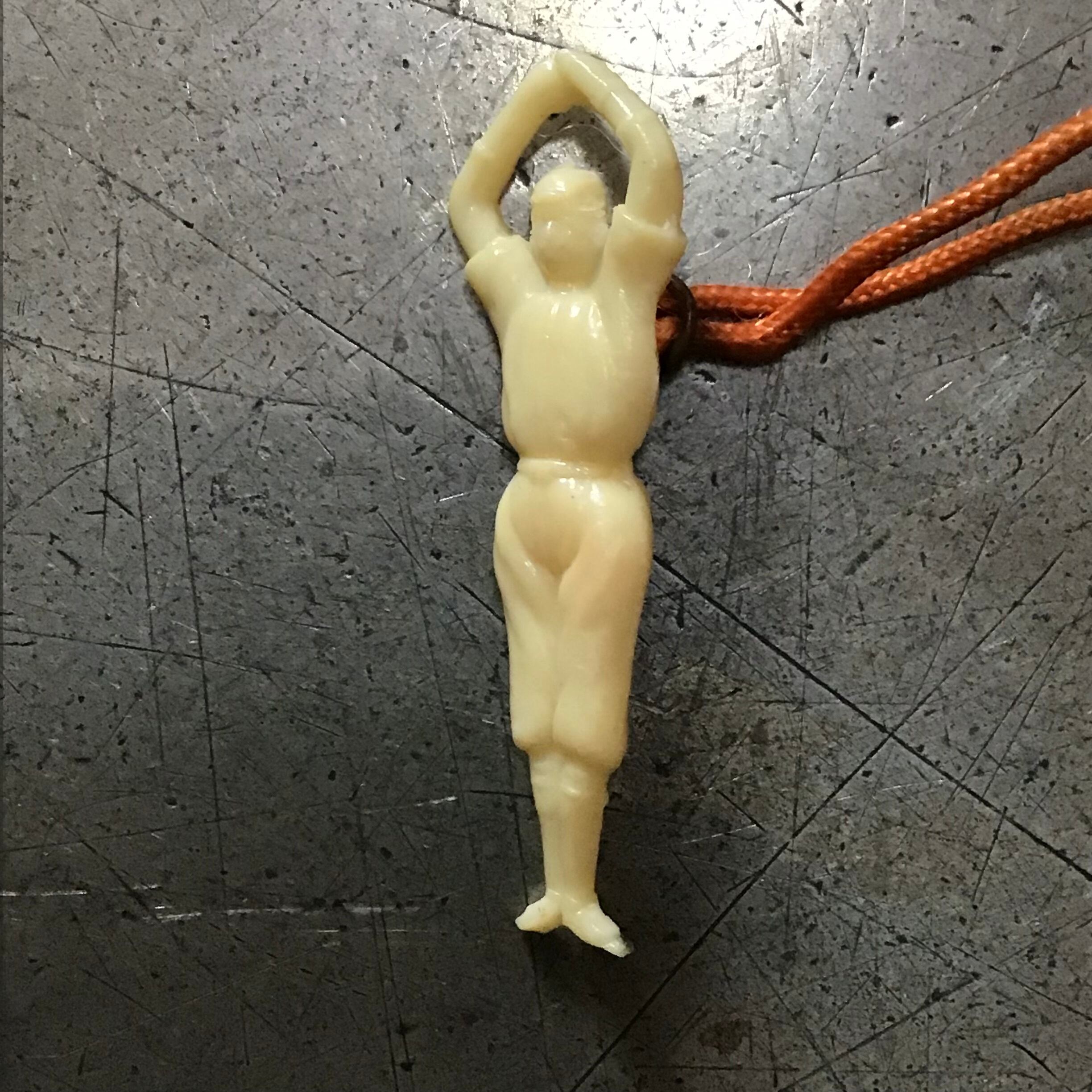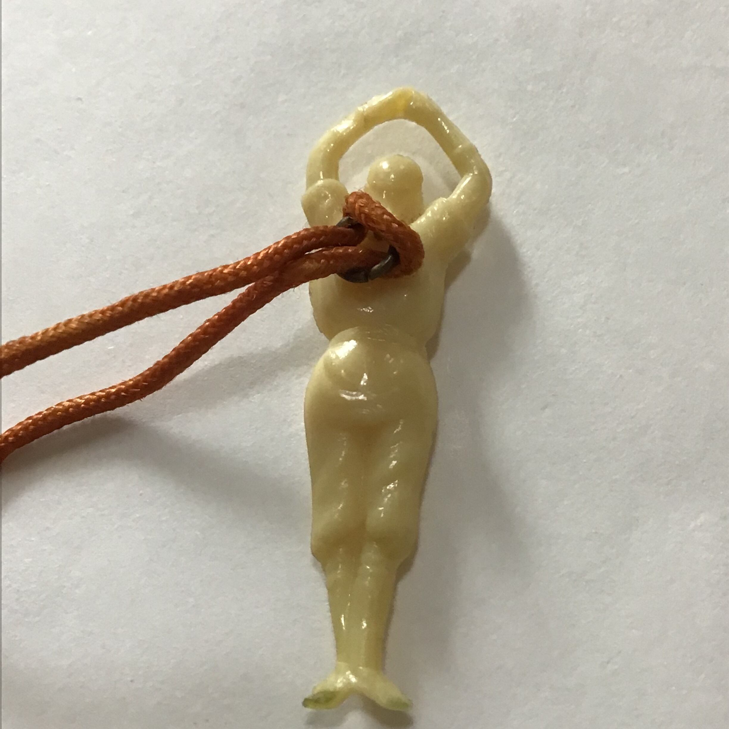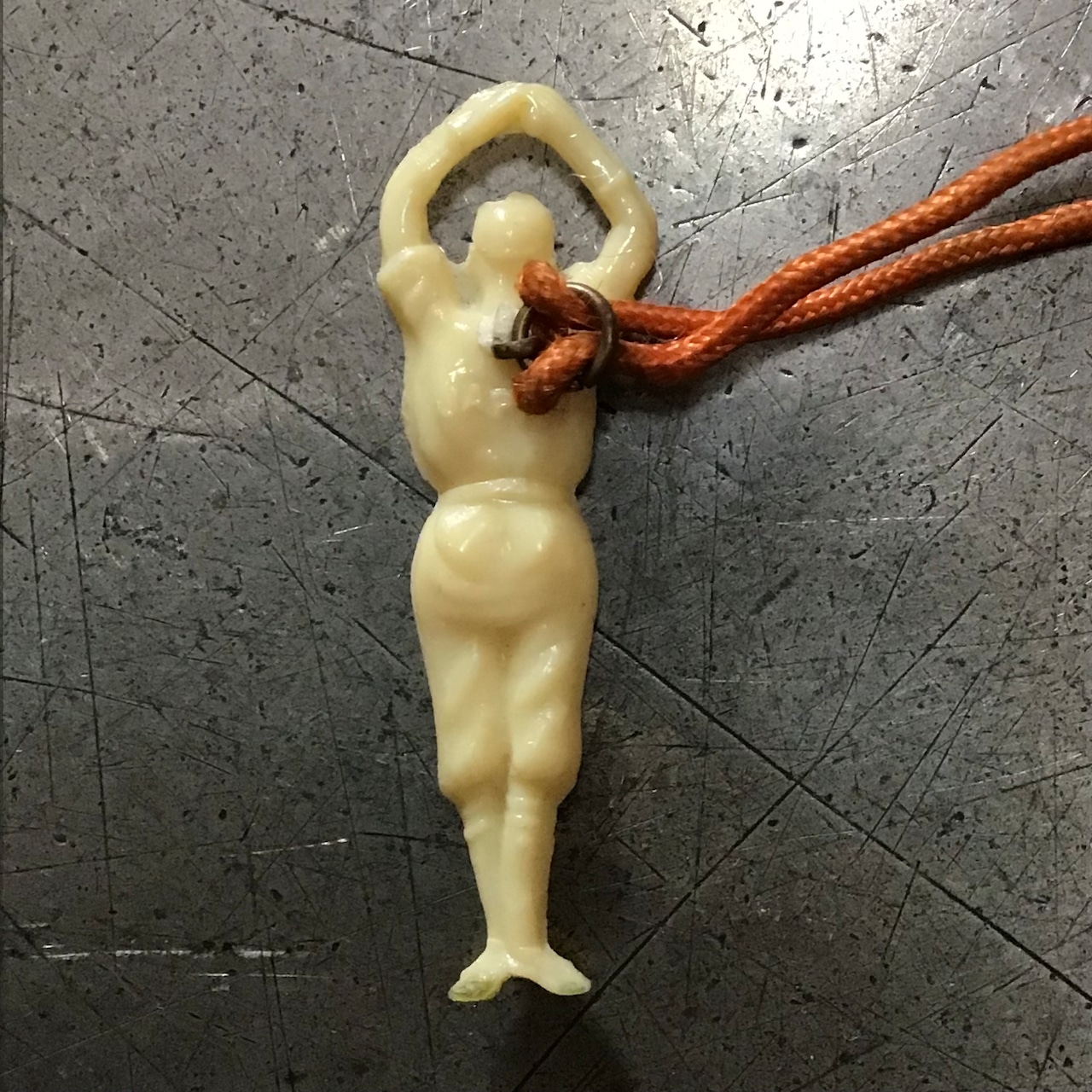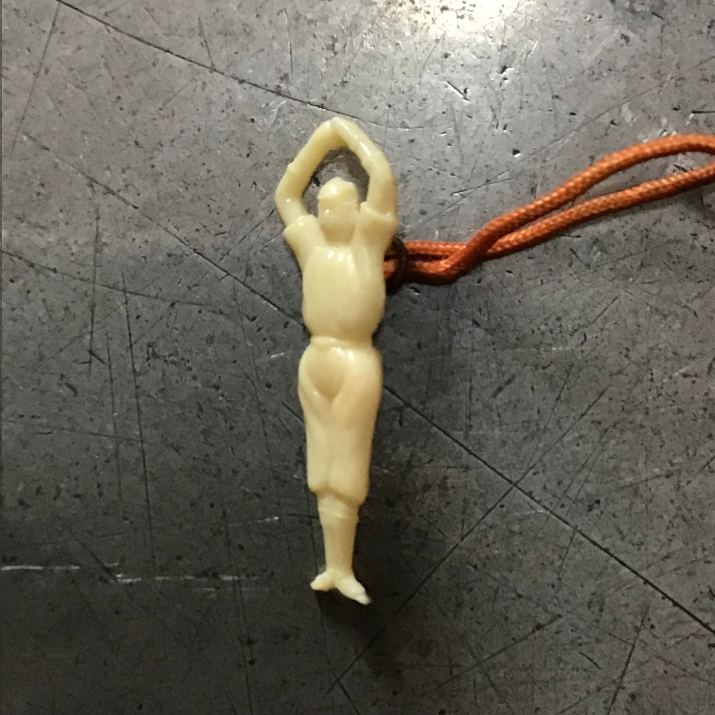 1950年代頃のガムボールのおまけチャーム、ピッチャーです。当時の紐がそのまま付いており、ブローチやネックレスにしたり、襟の先やお気に入りのポーチに縫い付けても可愛いです♡ボールチェーンをお付けしますので必要に応じてお使いください◎
