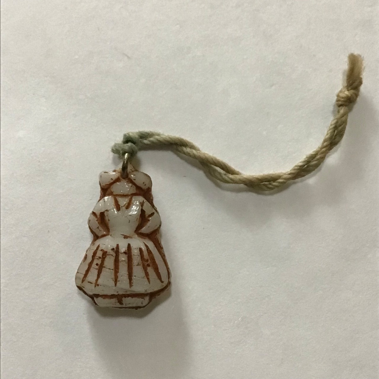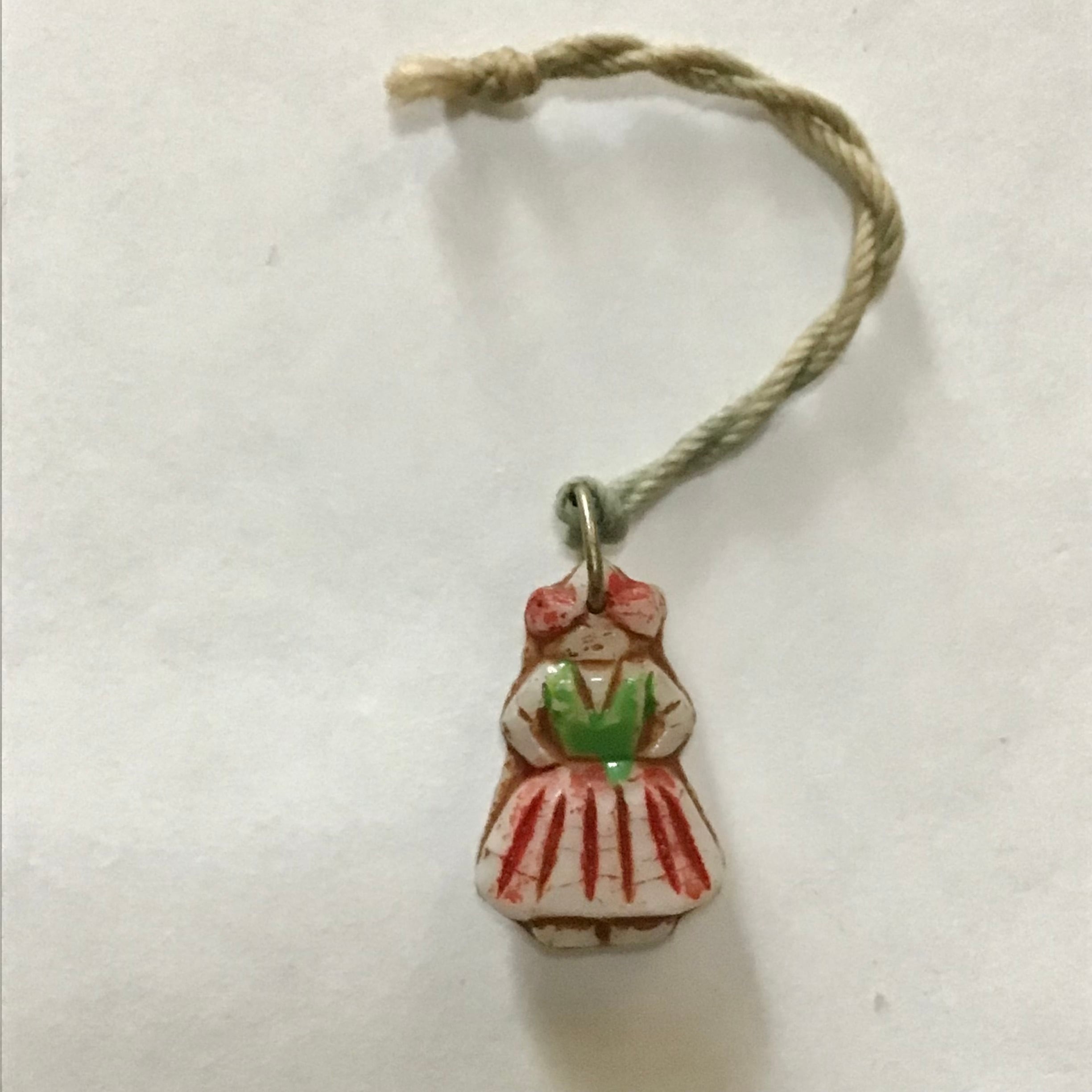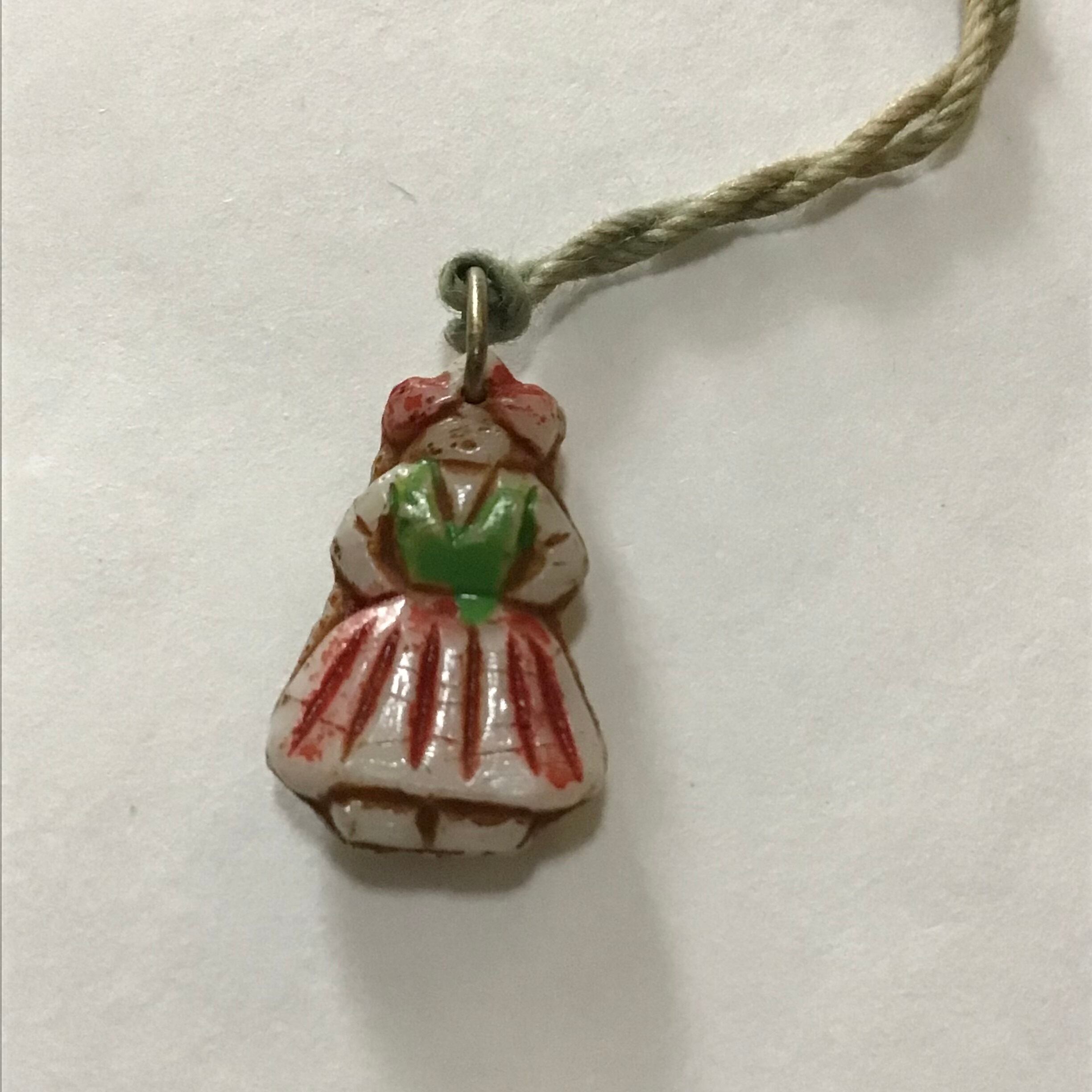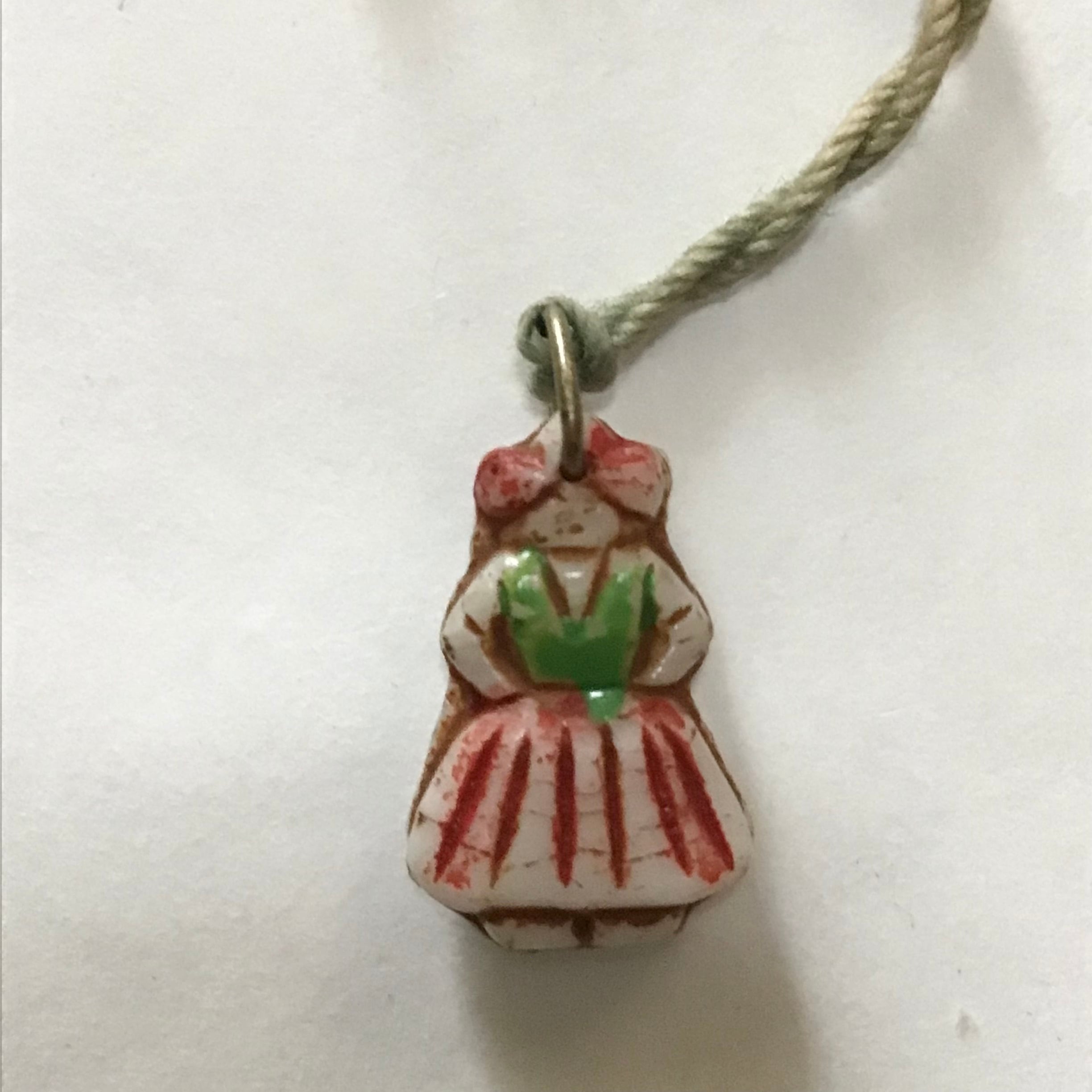 1950年代のガムボールのおまけチャーム、小さな女の子。当時の紐がそのまま付いており、ブローチやネックレスにしたり、襟の先やお気に入りのポーチに縫い付けても可愛いです♡ボールチェーンをお付けしますので必要に応じてお使いください◎