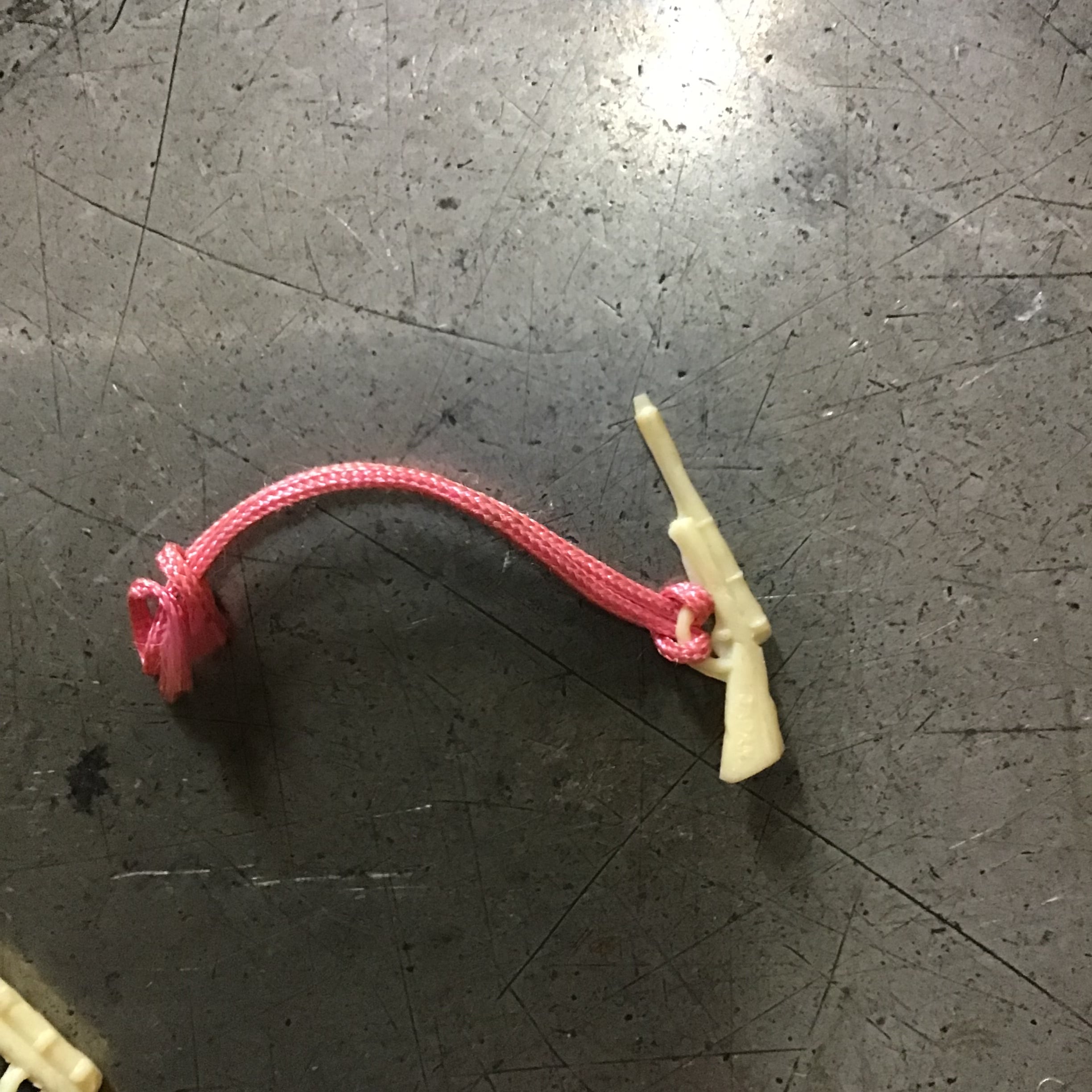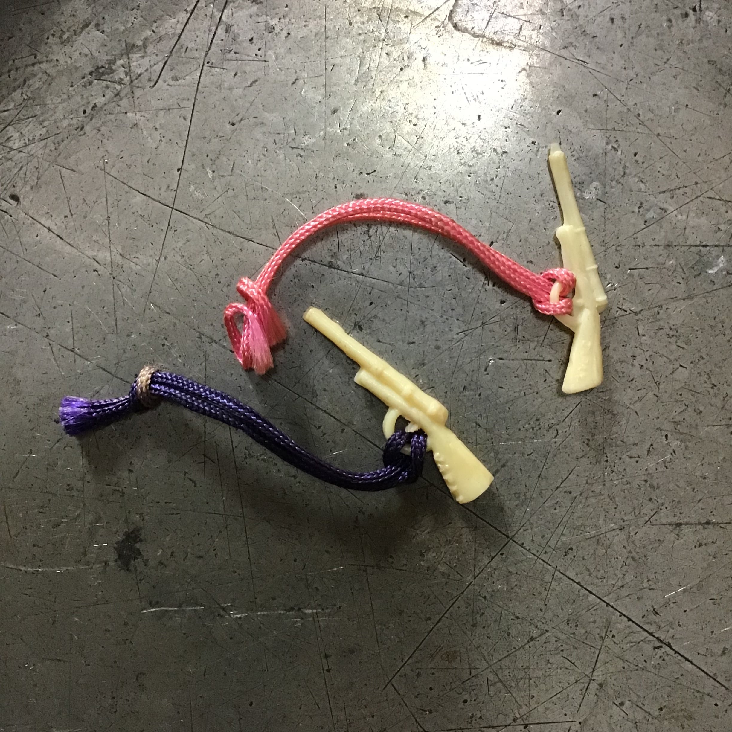1950年代頃のガムボールのおまけチャーム、ライフル銃です。当時の紐がそのまま付いており、ブローチやネックレスにしたり、襟の先やお気に入りのポーチに縫い付けても可愛いです♡ボールチェーンをお付けしますので必要に応じてお使いください◎