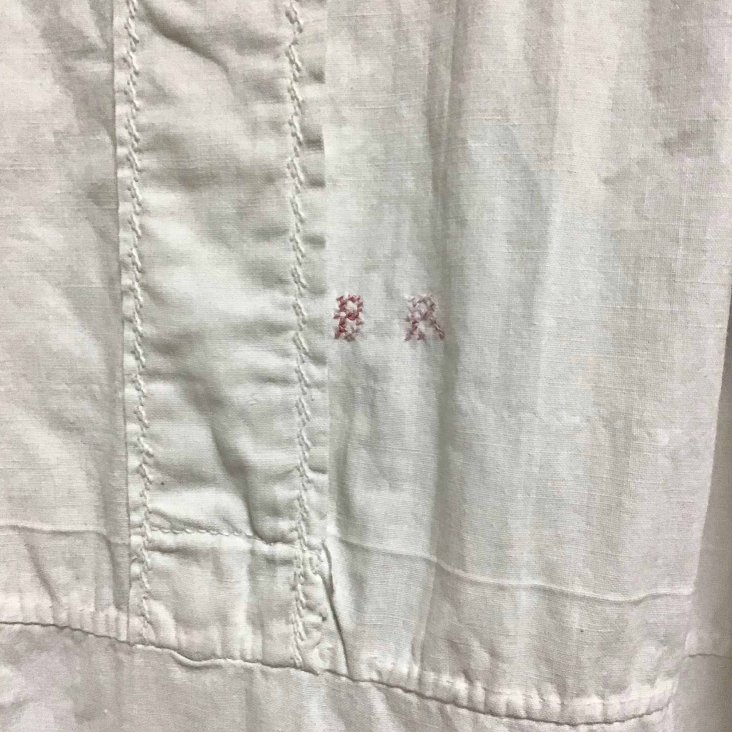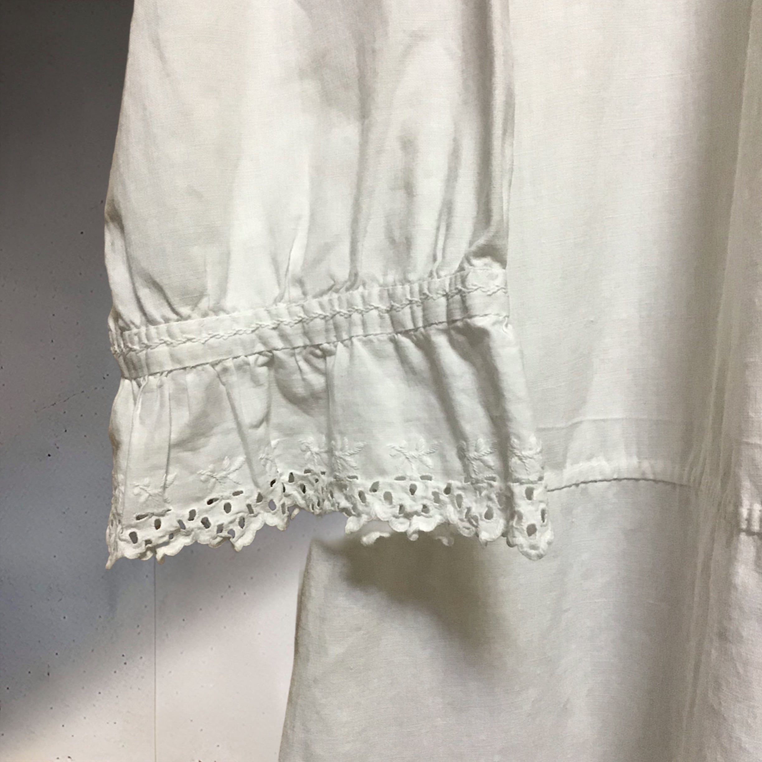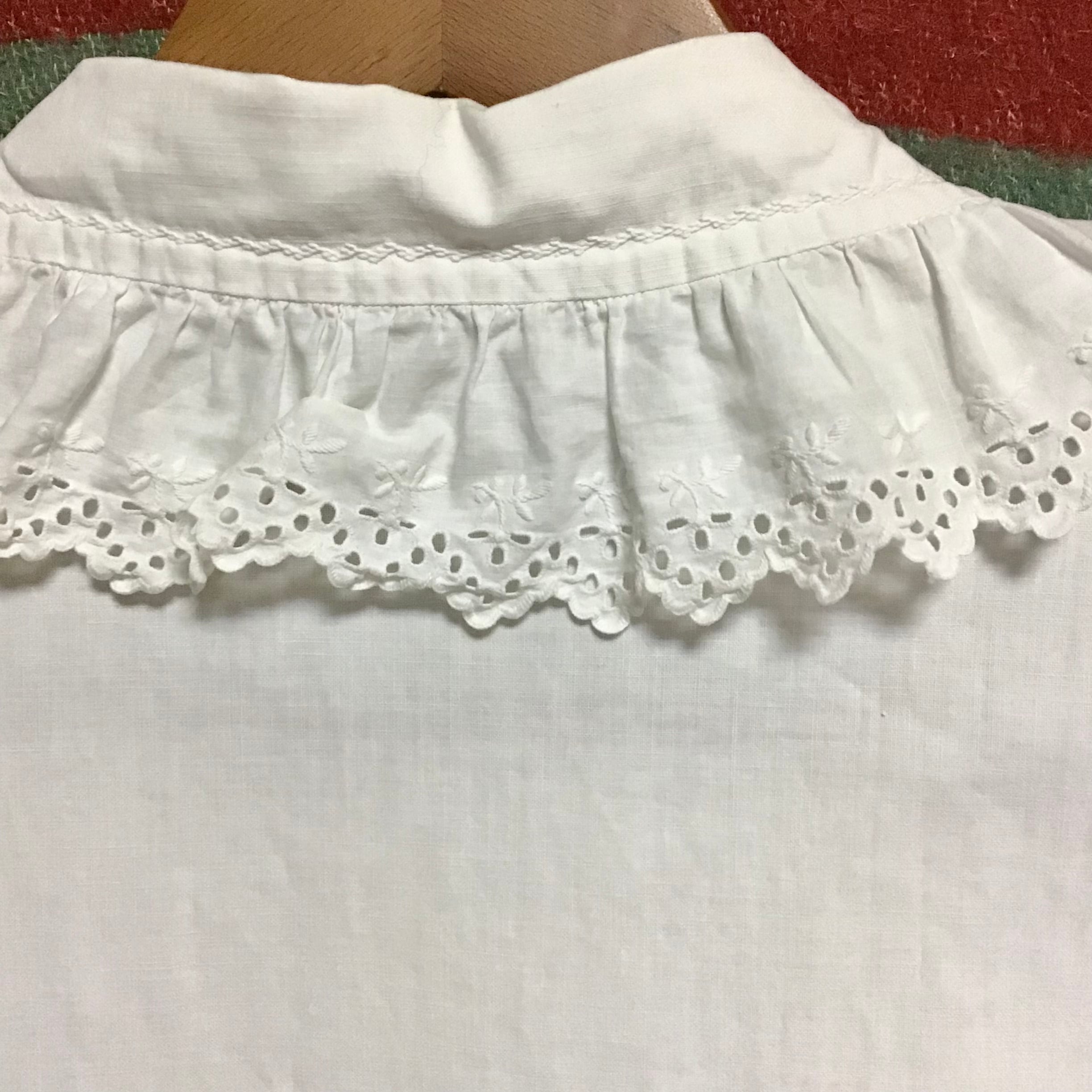 1930年代のコットンドレス。アンティークらしい柔らかな生地、程よいボリュームのレース、襟や前立て、袖口のハンドステッチ、小さなイニシャルの刺繍など可愛いポイントたくさん♡ウエスト下目の切り替えもリラックスした雰囲気で、1枚でサラッと着たり、ニットを重ねて襟と袖口を見せたりと、着回しも効くおすすめのドレスです!