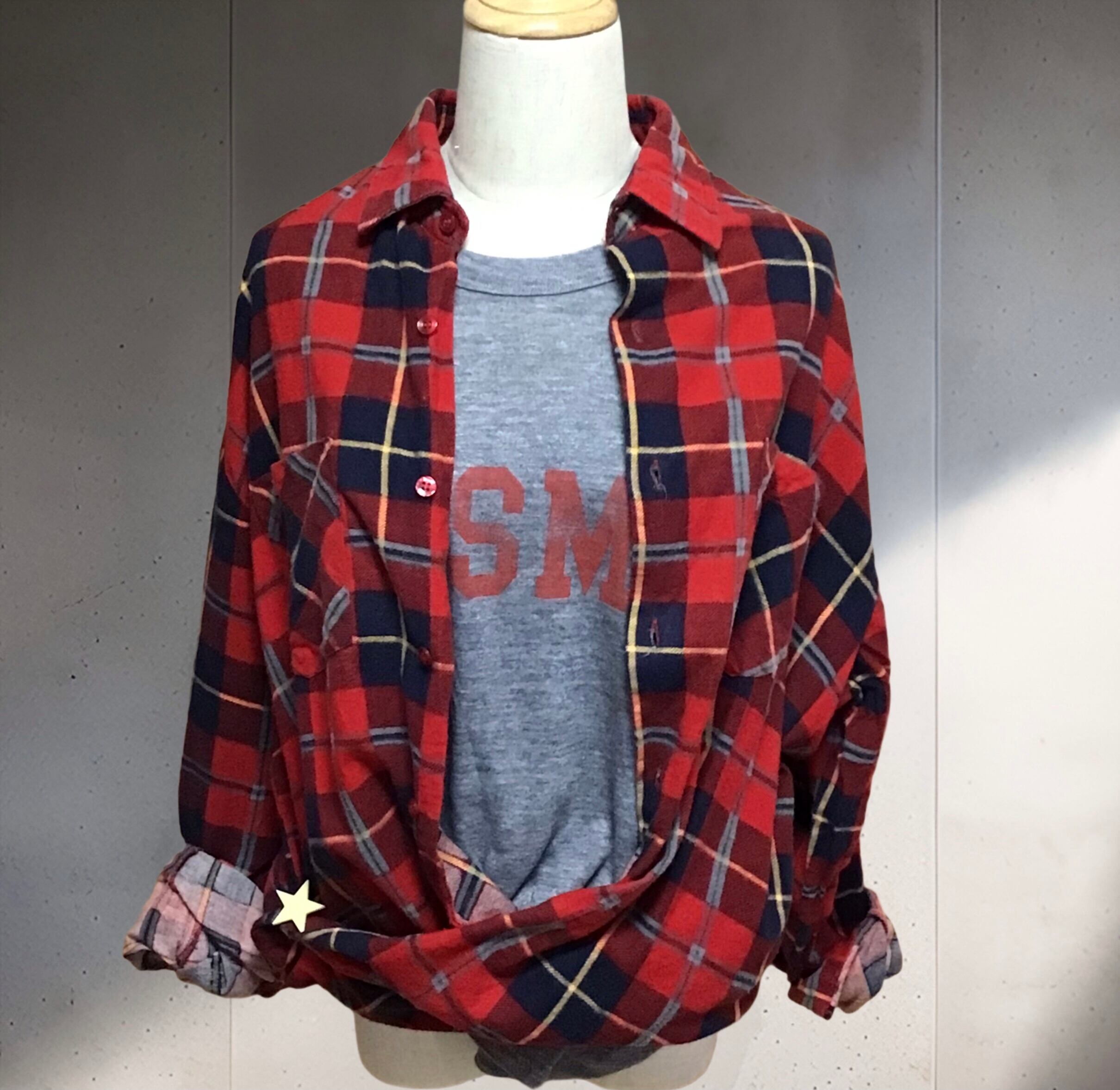 チェックのネルシャツ。定番のネルシャツですがこの季節は特に赤色に惹かれます♡羽織りとしてはもちろん、ワンポイントに巻いてみたり、スカートの様にしたり、ボタンを自由に留めて変形させたりと、シャツの可能性を広げたい店主です◎気軽に着られるとてもお気に入りのお品です!