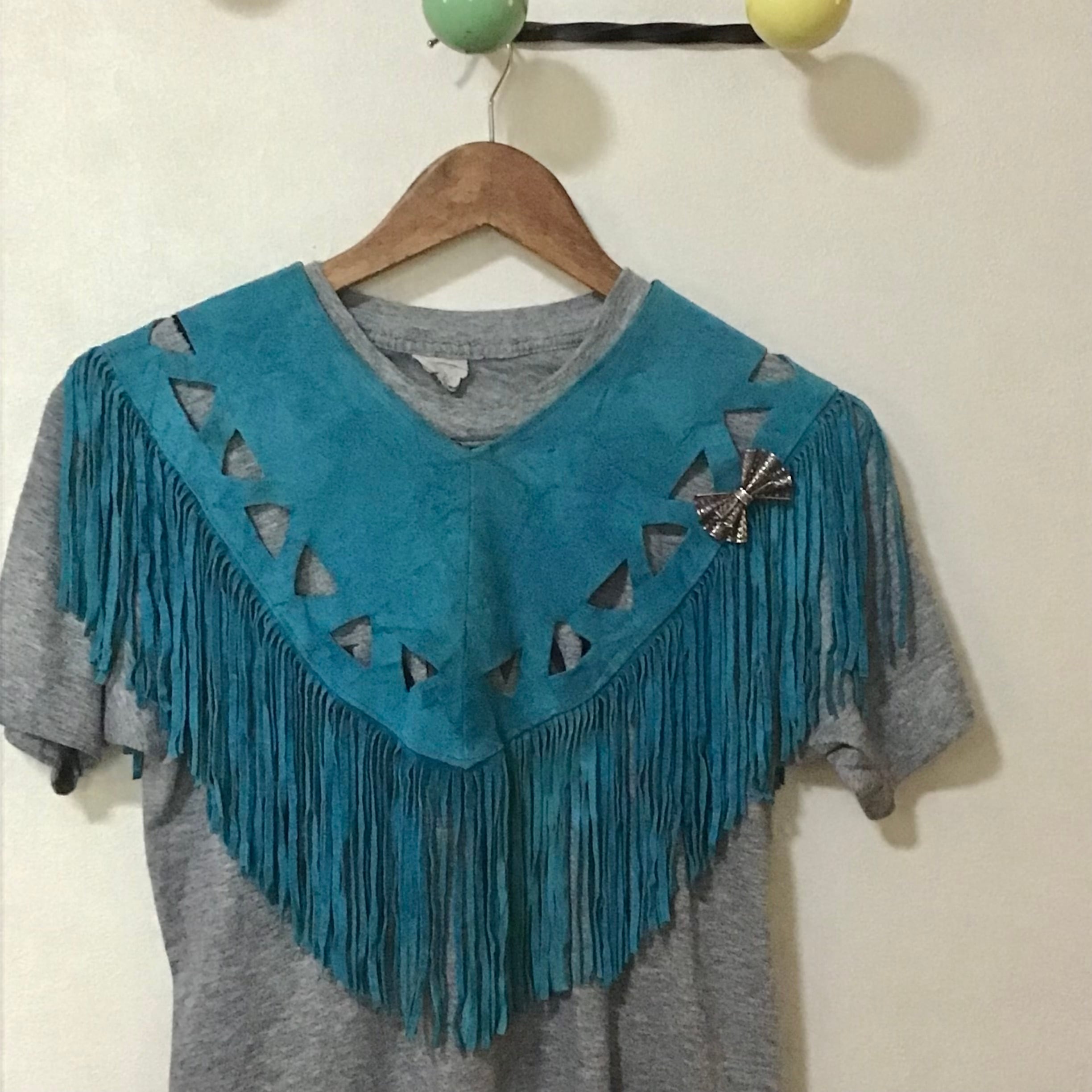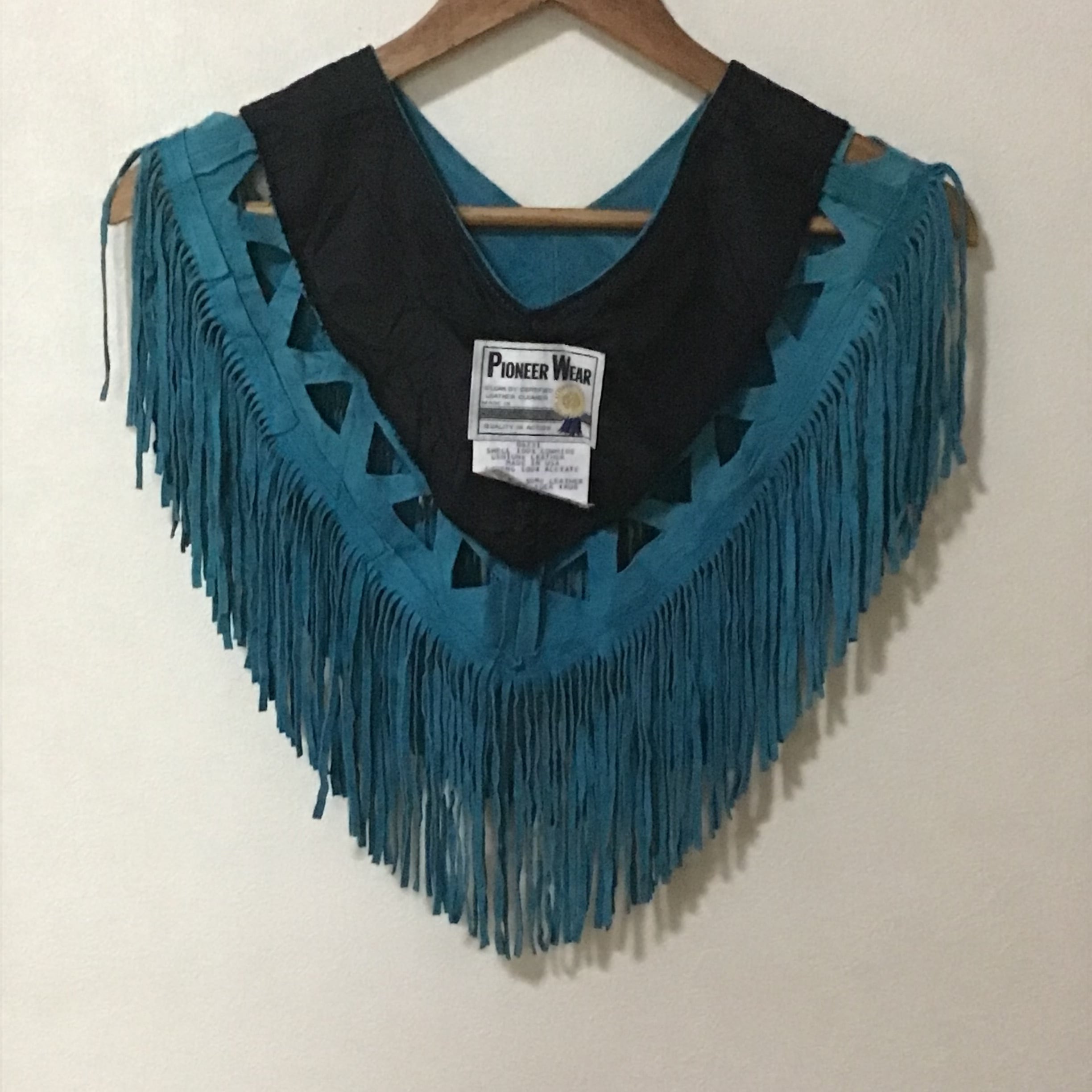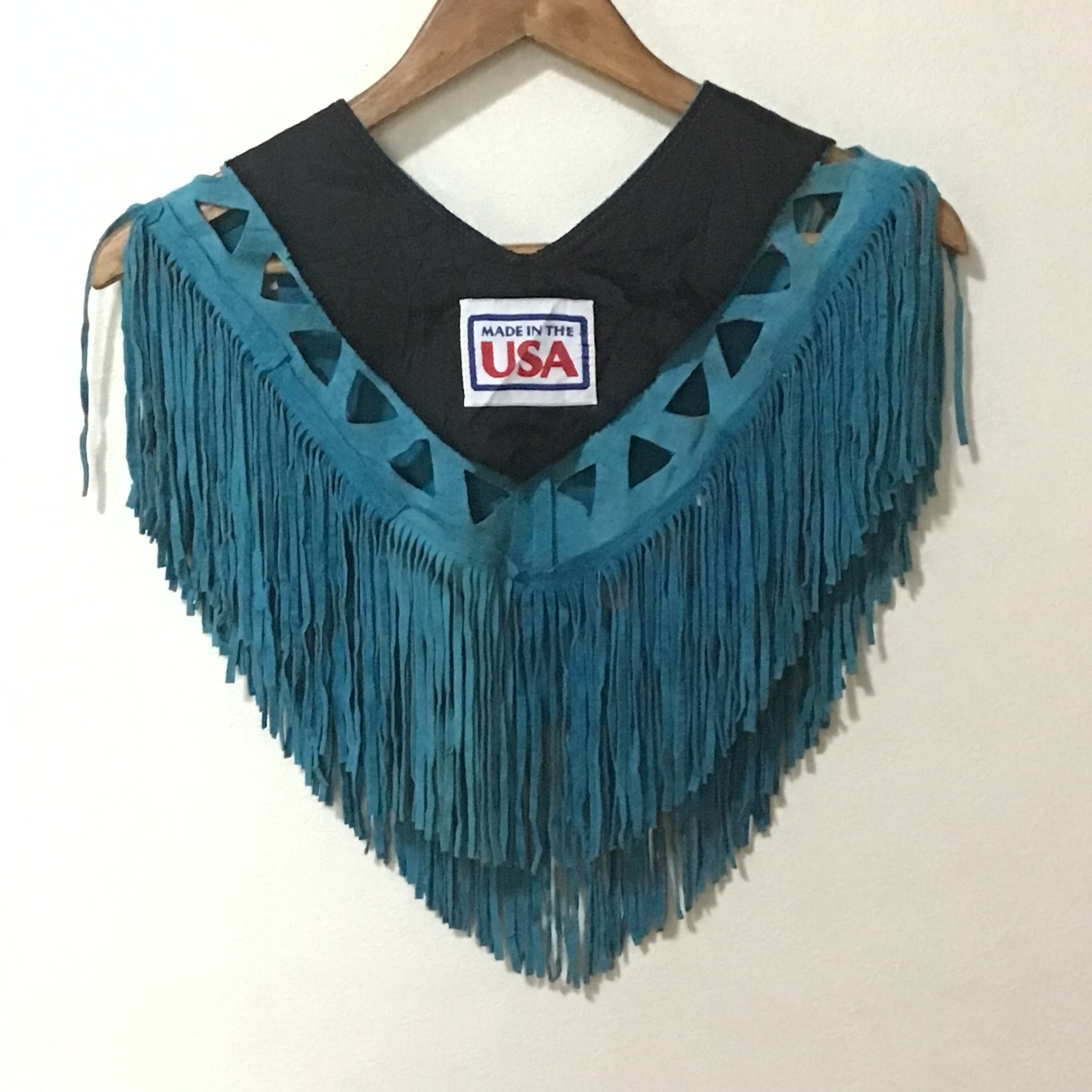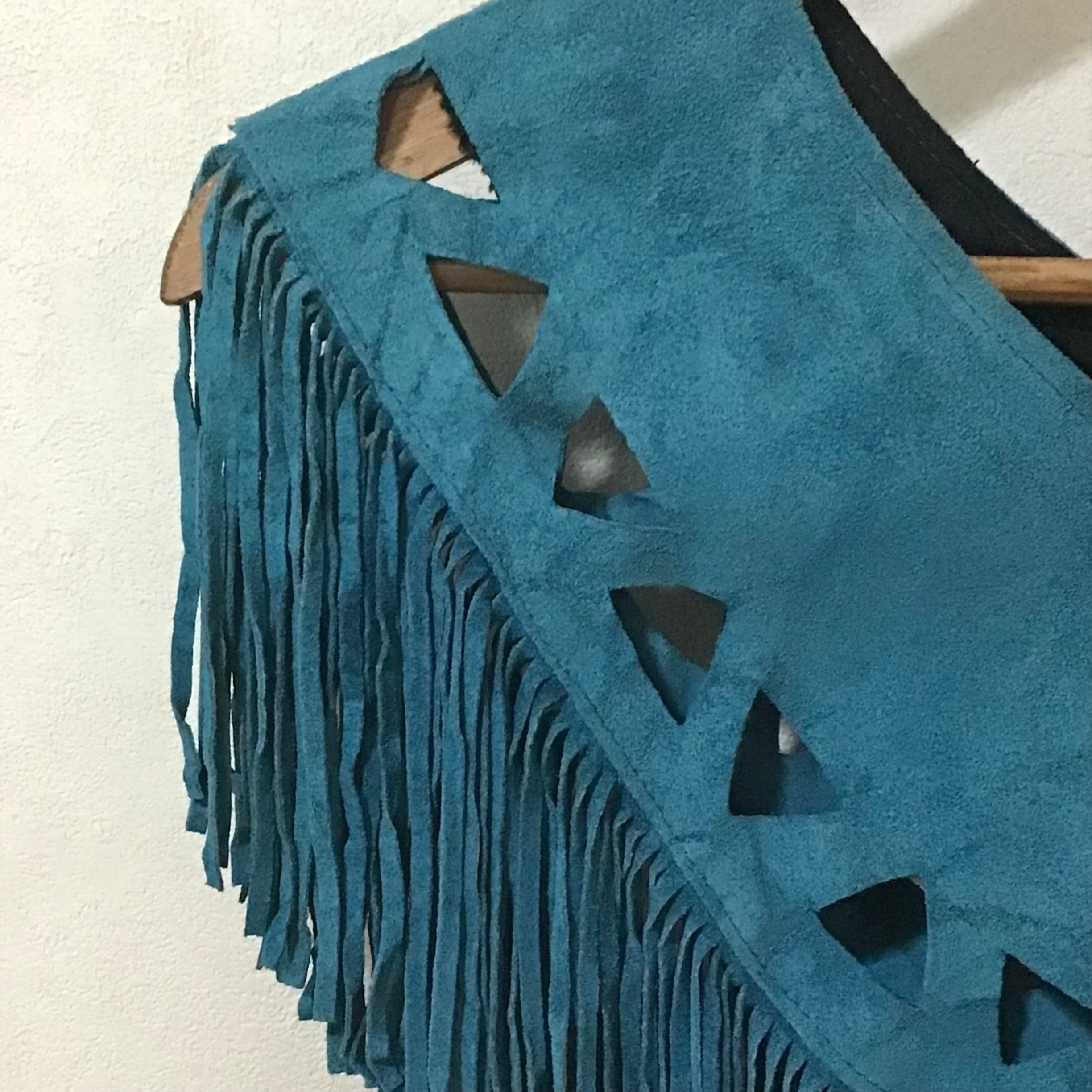 1970年代のカットワークも可愛いスエードフリンジポンチョ。ポンチョと言っても小ぶりで、Tシャツからニットやワンピースに合わせて気軽に重ねられる便利アイテムです◎くすんだターコイズブルーが様々な色に馴染みやすくおすすめです♡個人的にはコンパクトなデニムジャケットに合わせたいです!