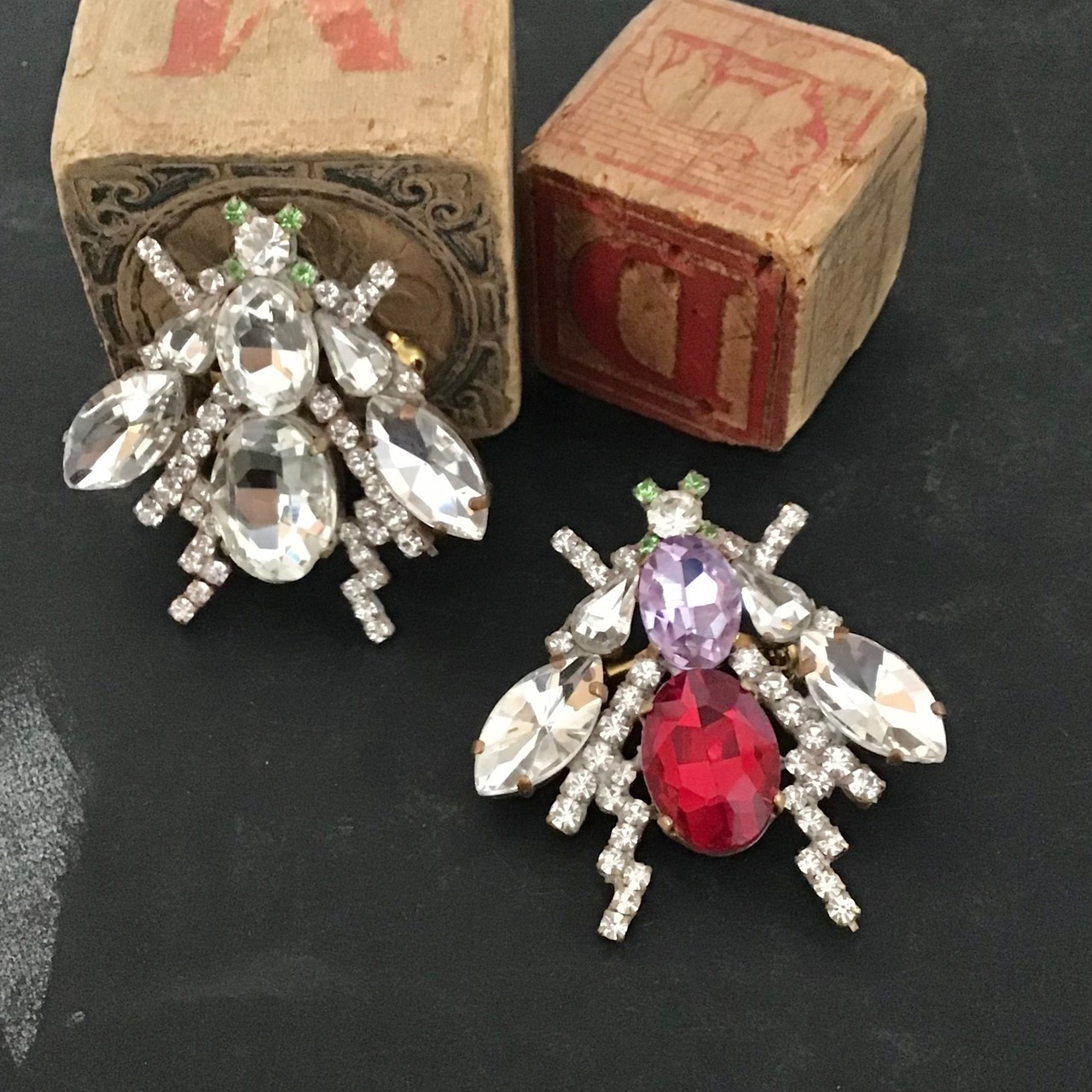 チェコガラスのブローチ。100年以上も同じ製法で一つひとつ丁寧に手作業で作られているジュエリー達。今まで古いものをご紹介してきましたが、こちらは新品です◎ ユニークなモチーフが多いのが特徴ですが、こちらはなんとハエ◎こんなにシックで可愛らしいハエのブローチがあるなんて!と、店主は一目で気に入ってしまいました♡