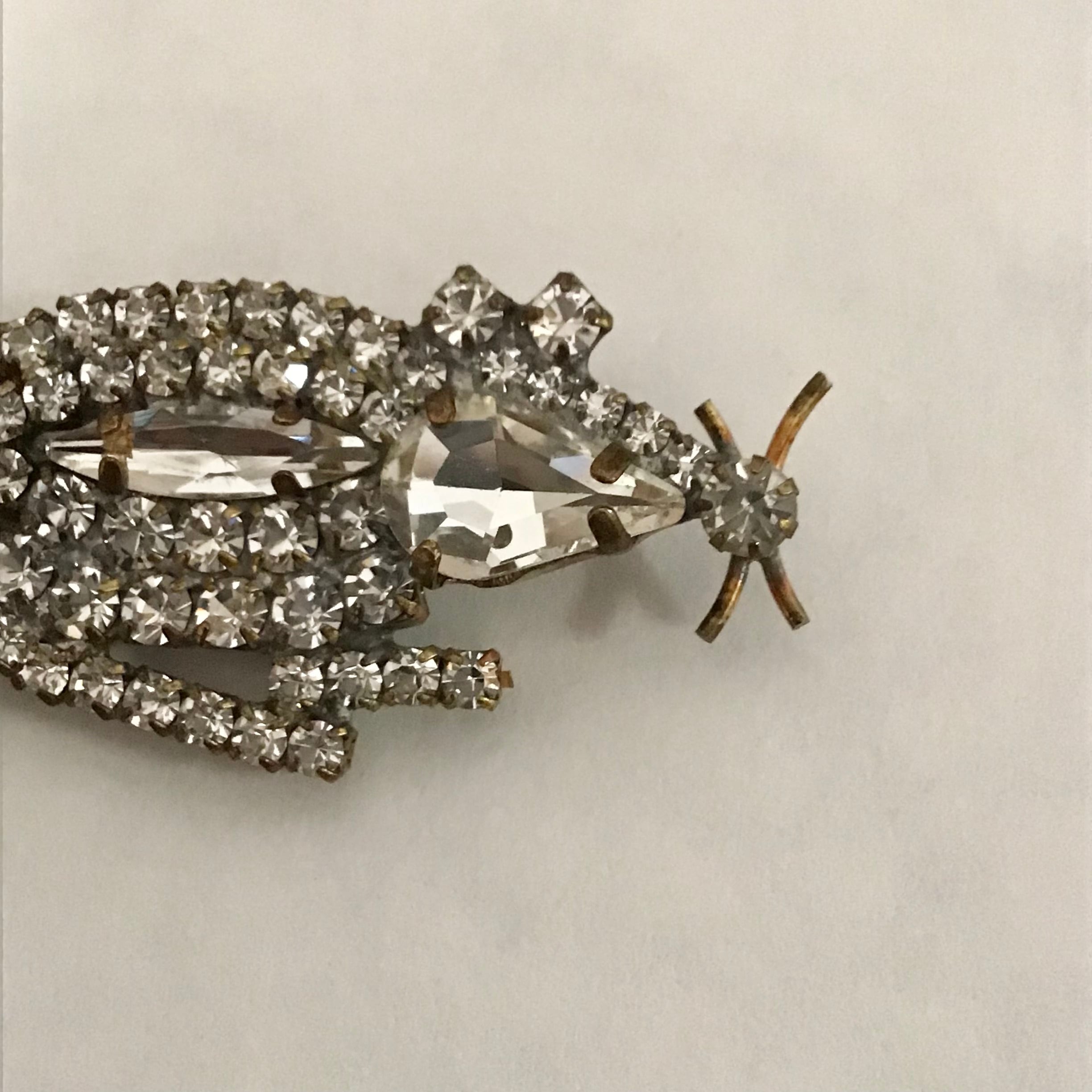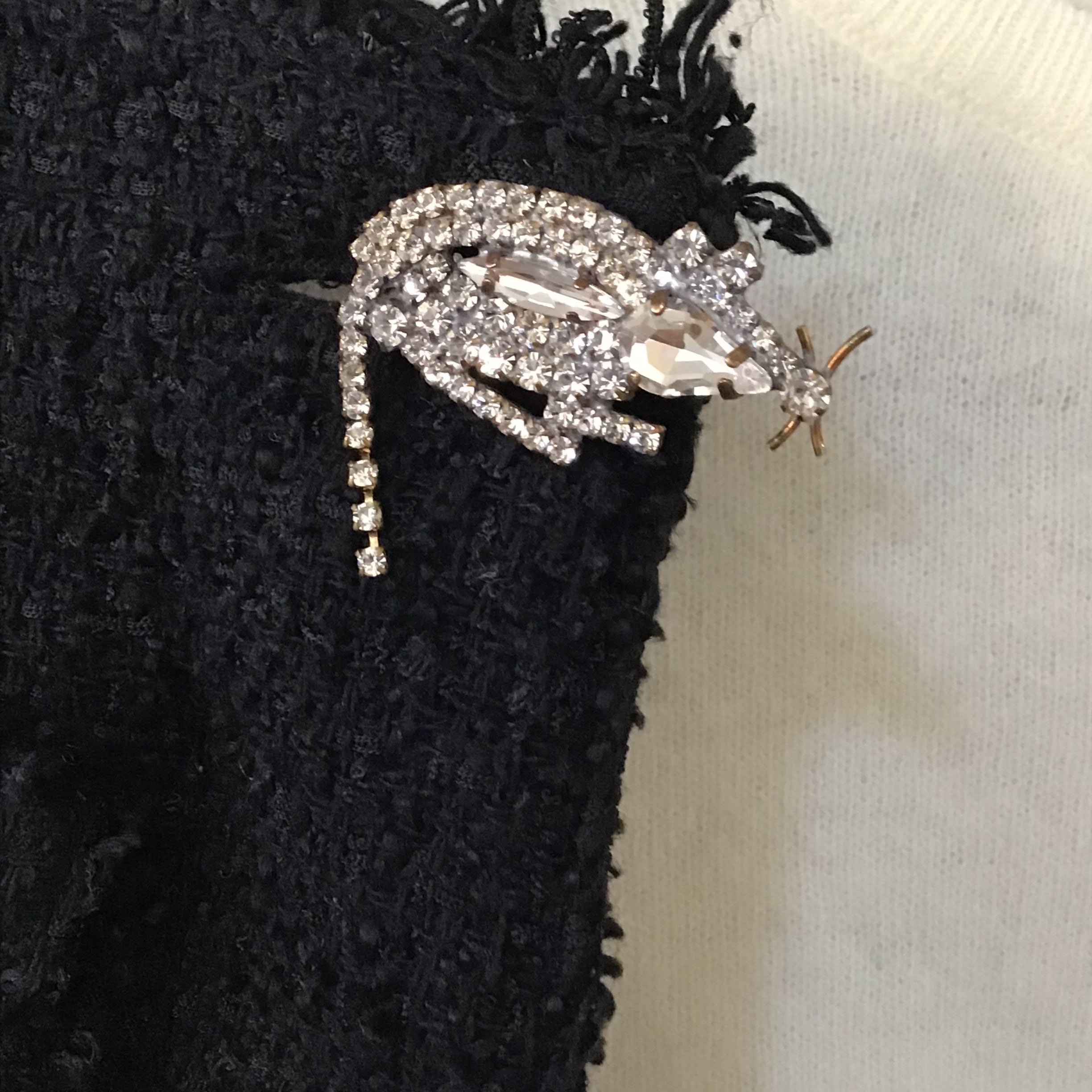 チェコガラスのブローチ。100年以上も同じ製法で、一つひとつ丁寧に手作業で作られているジュエリー達。今まで古いものをご紹介してきましたが、こちらは新品です◎ ユニークなモチーフが多くヴィンテージとも相性抜群!こちらはヒゲと、プラプラ揺れるしっぽがチャームポイントのネズミちゃん♡店主は猫のブローチと一緒に付けたいです!