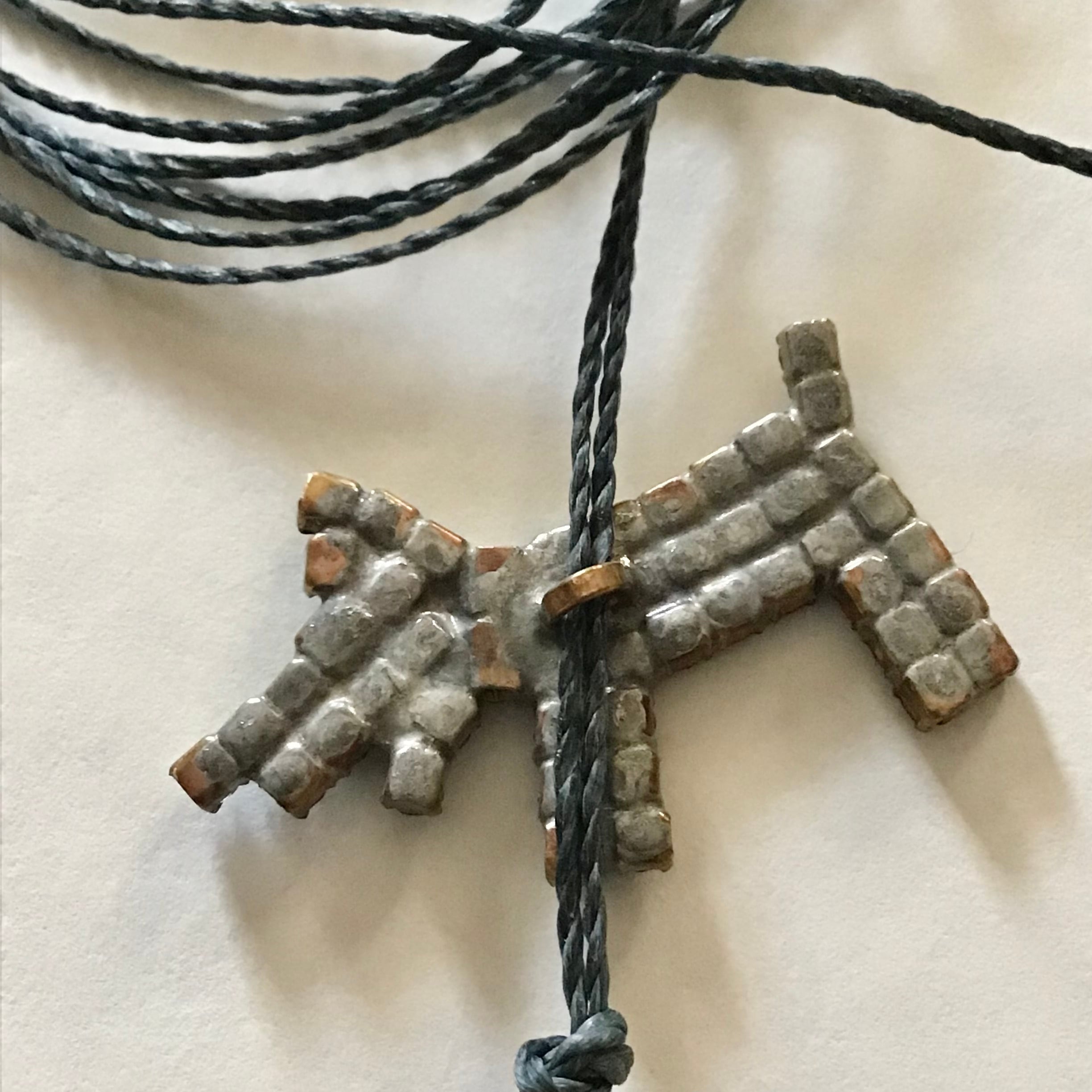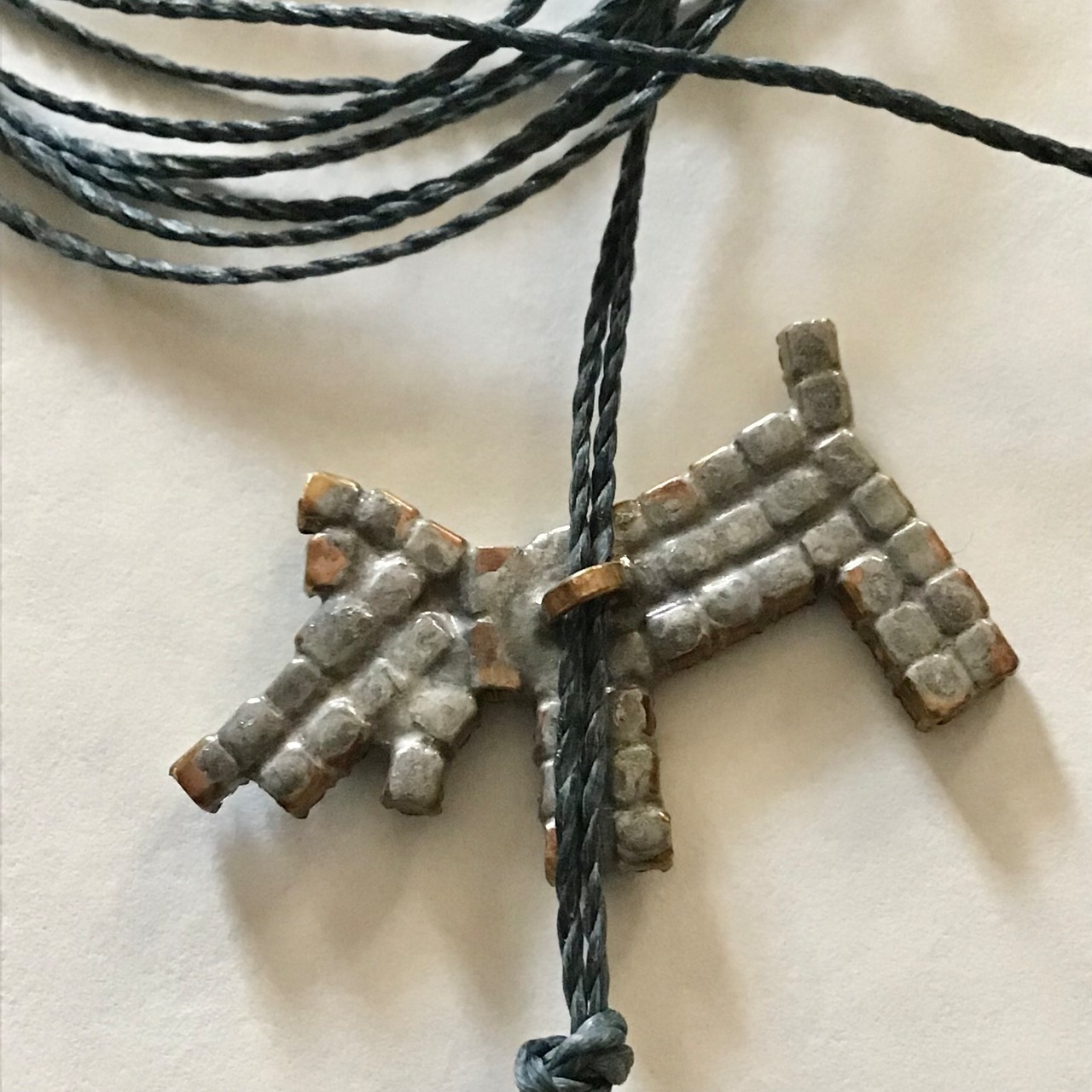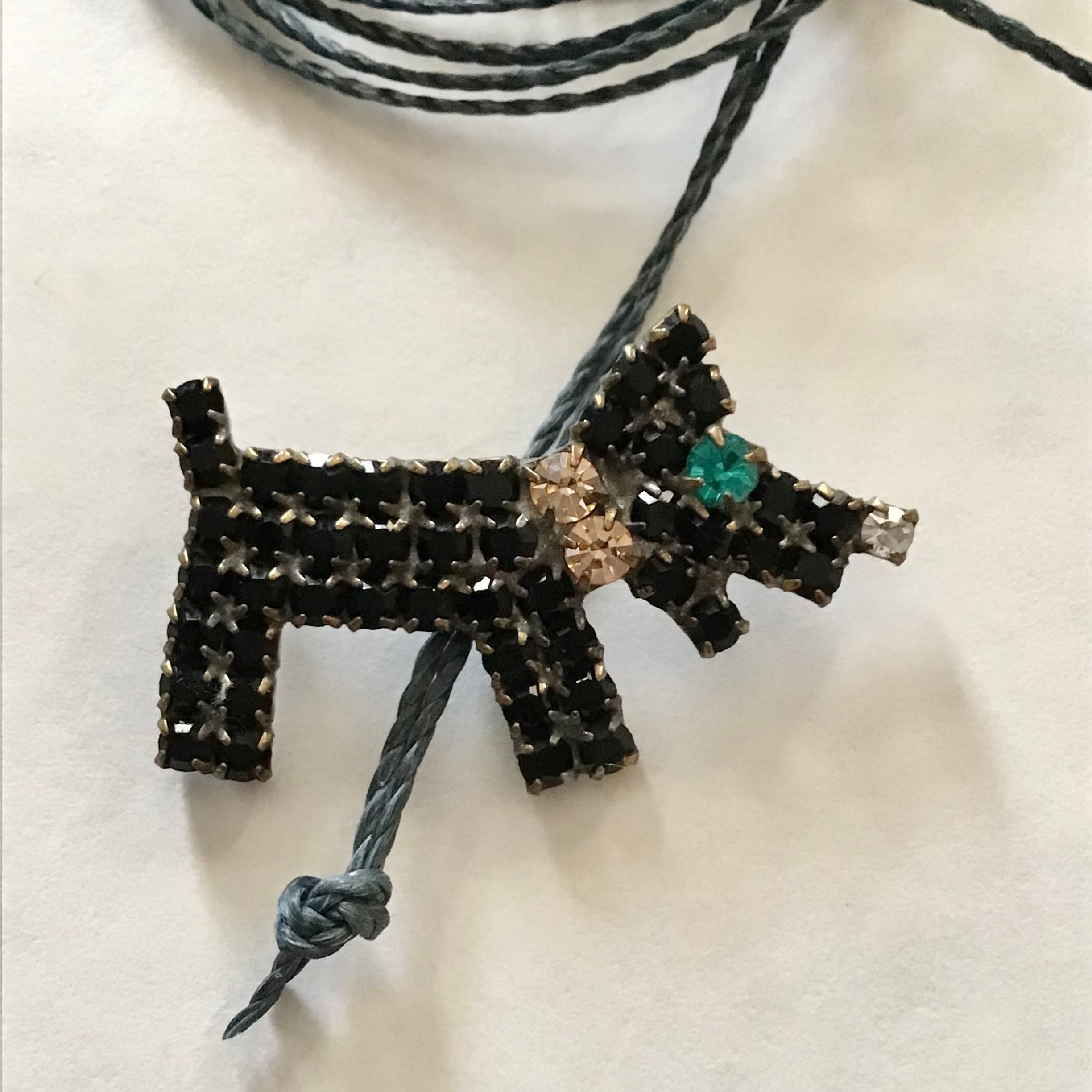 チェコガラスのボタン。100年以上も同じ製法で、一つひとつ丁寧に手作業で作られているブローチ達。今まで古いものをご紹介してきましたが、こちらは新品です◎ ユニークなモチーフが多くヴィンテージとも相性抜群!こちらは色使いも可愛らしい小さな犬です。簡易的ですがワックスコードをお付けして、ネックレスやチョーカーとして使えるようにしてみました♡もちろんご自身のアイデアで楽しんで頂いても!
