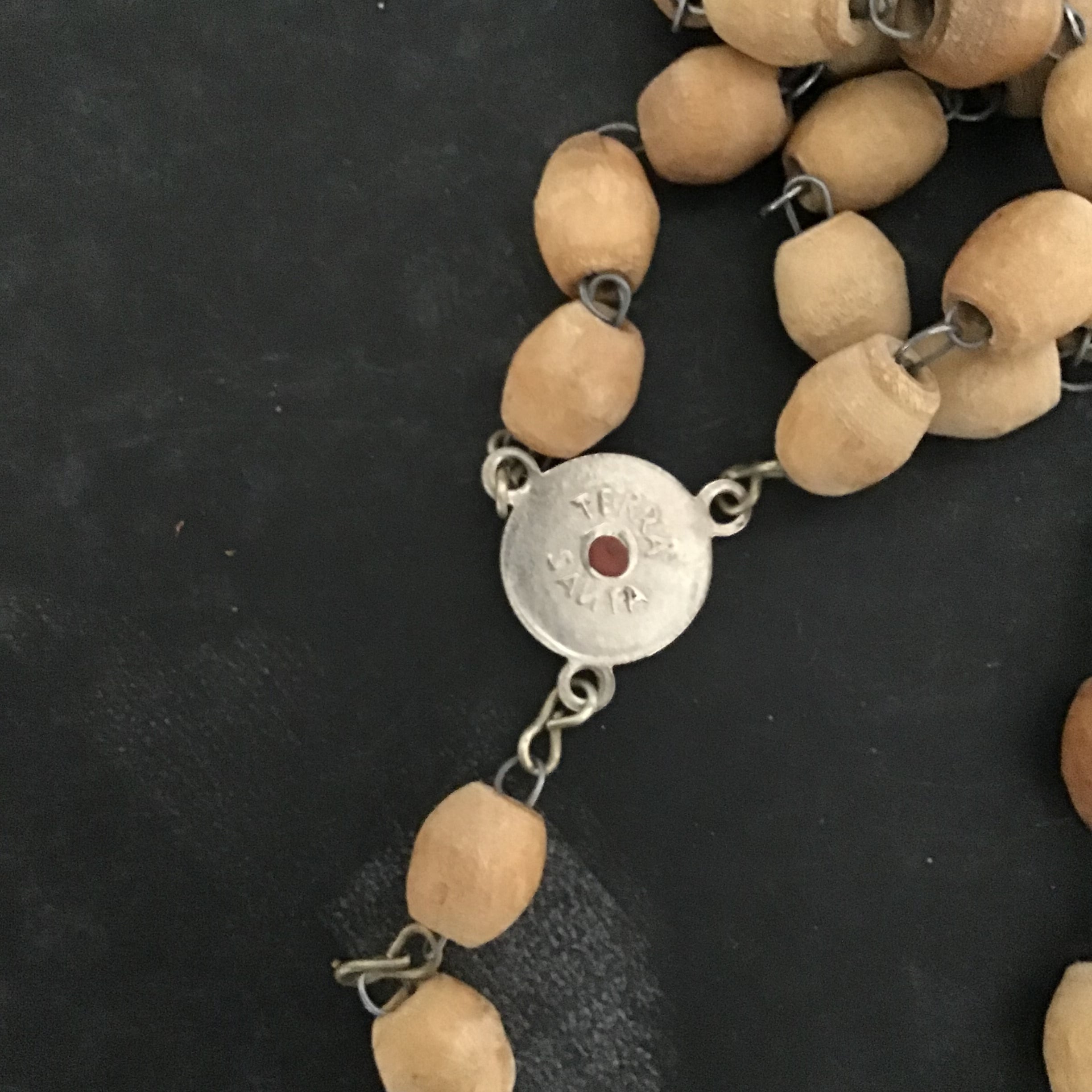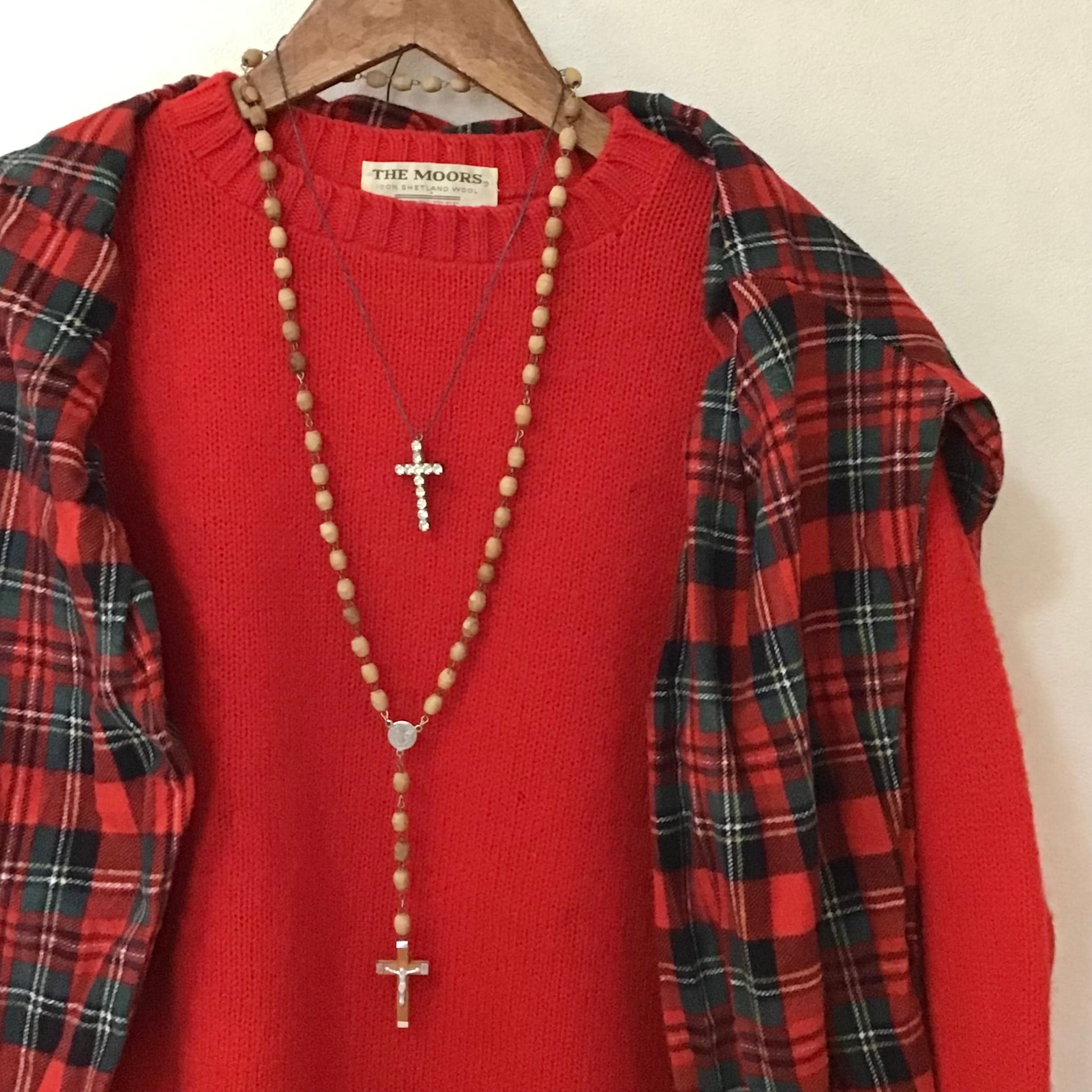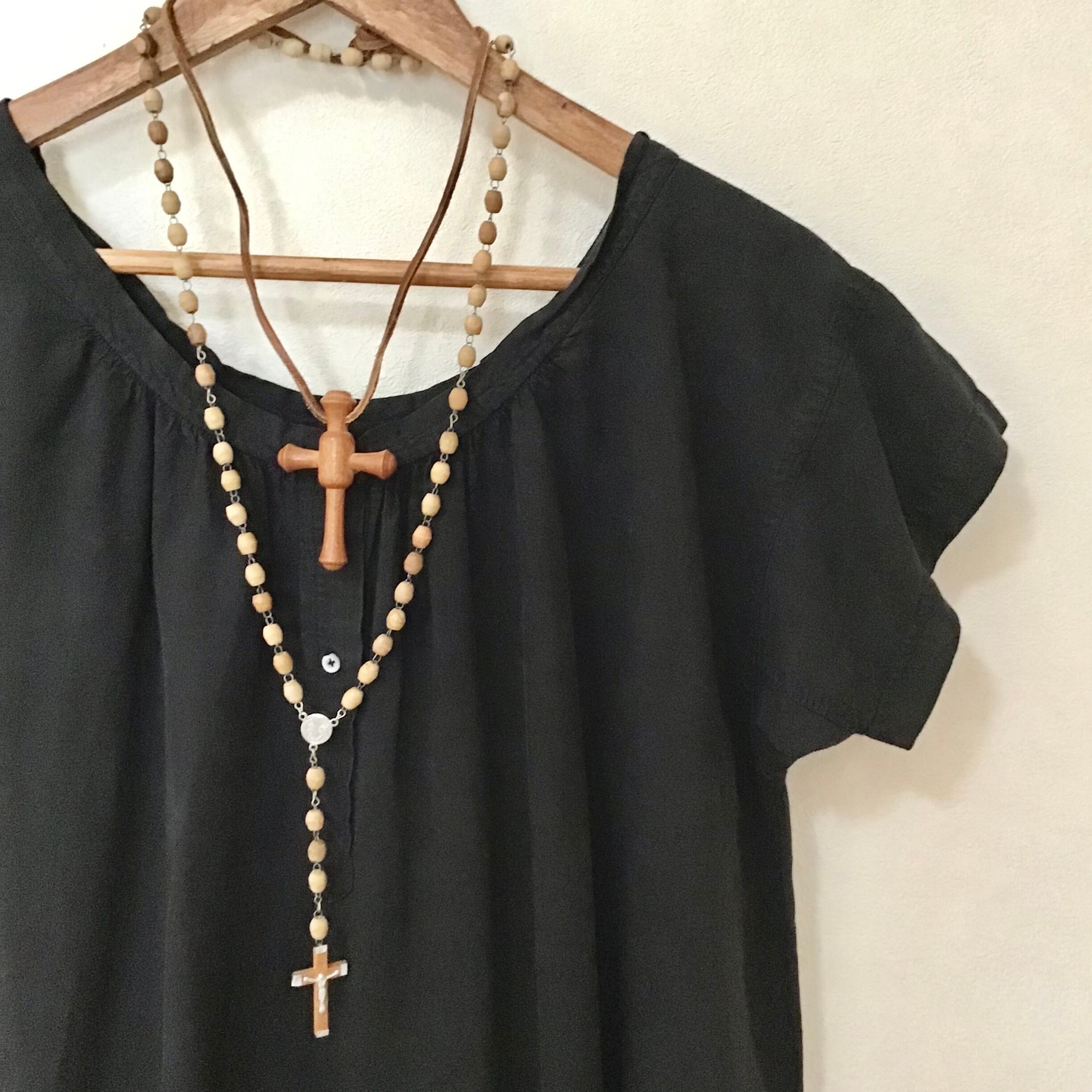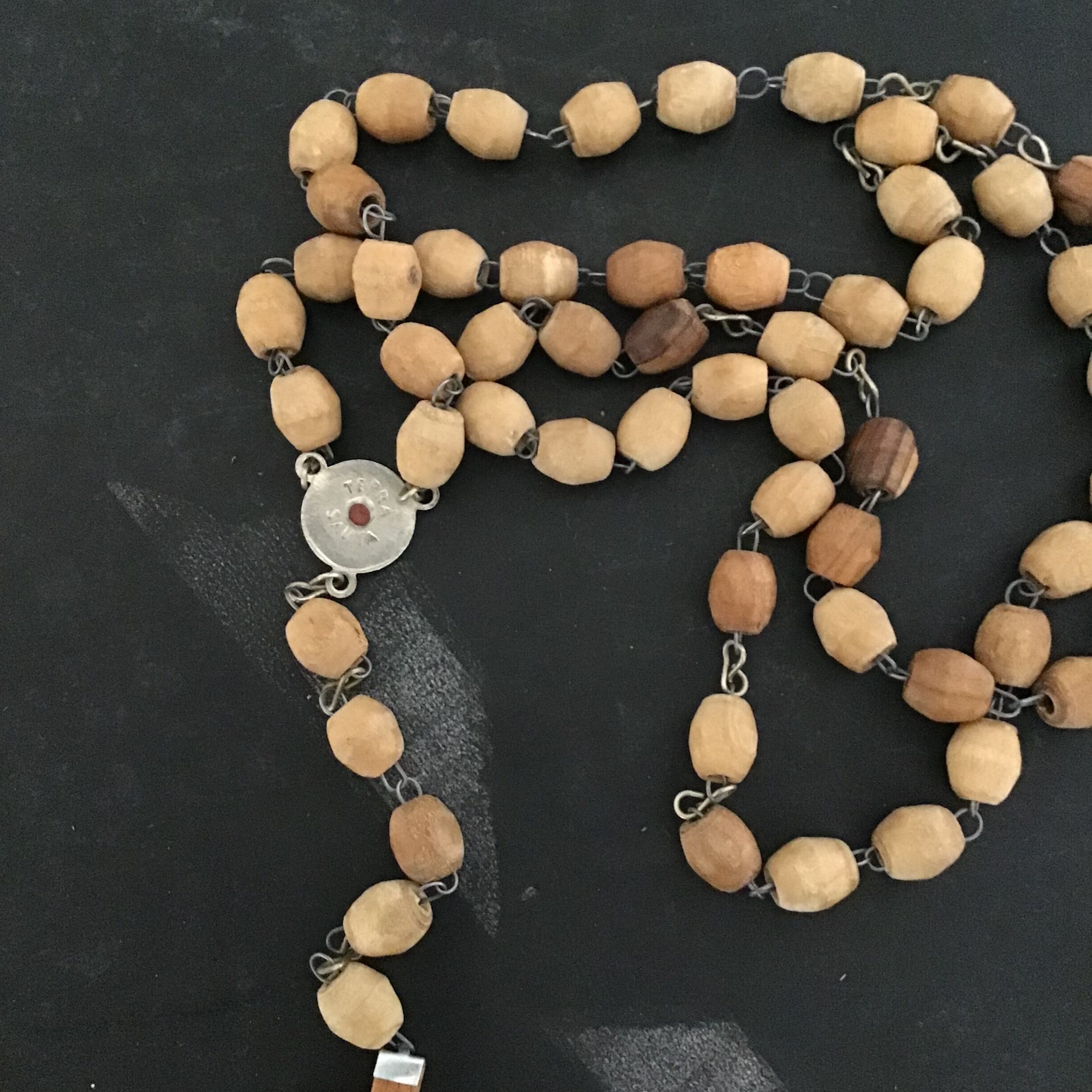 1950年代のロザリオ。木製のチェーンが軽やかで、コットンやリネンはもちろん、これからの季節のニットなどと特に相性良さそうな温かみのあるお品です♡小粒のパールと合わせたり、クロスモチーフをいくつか重ねても素敵です◎