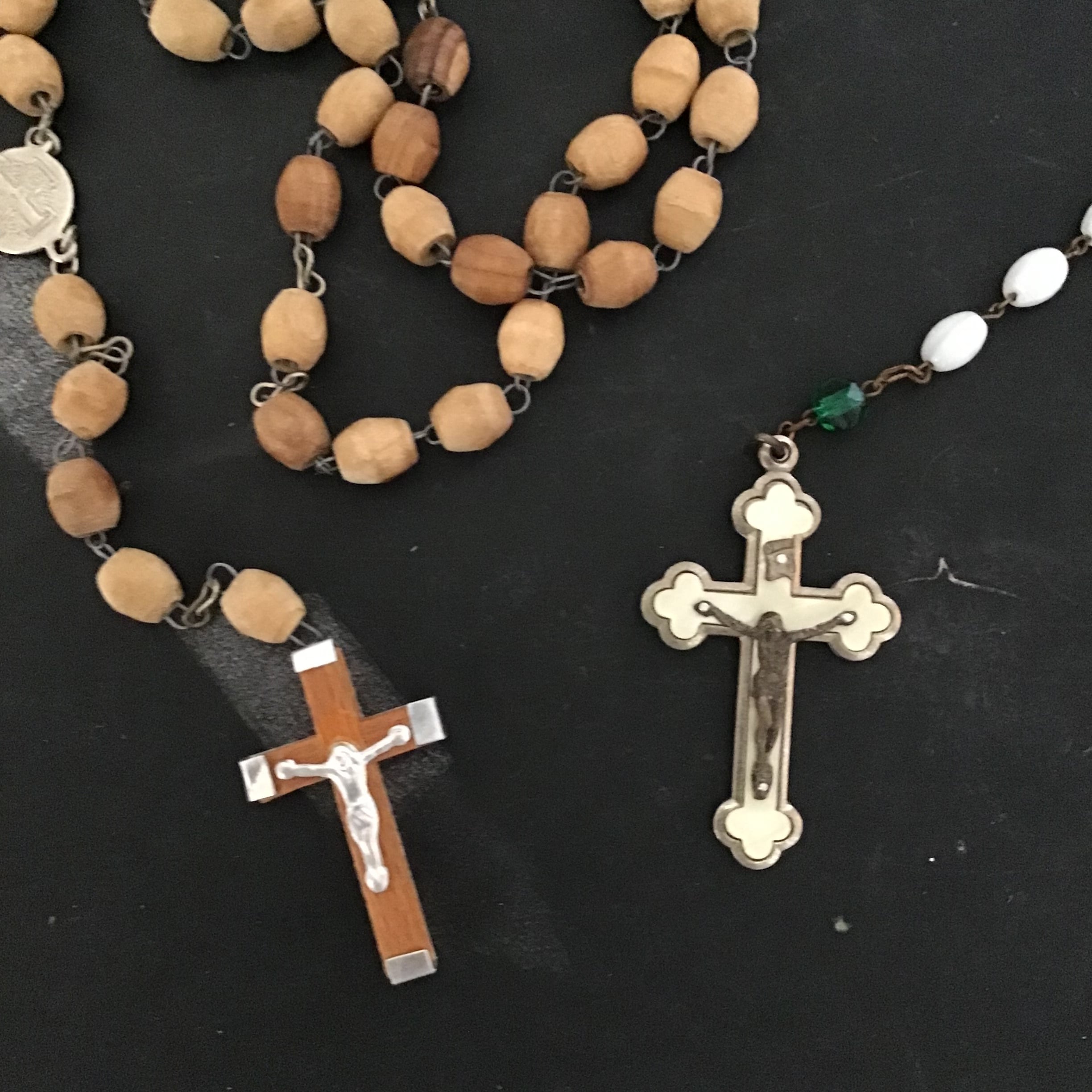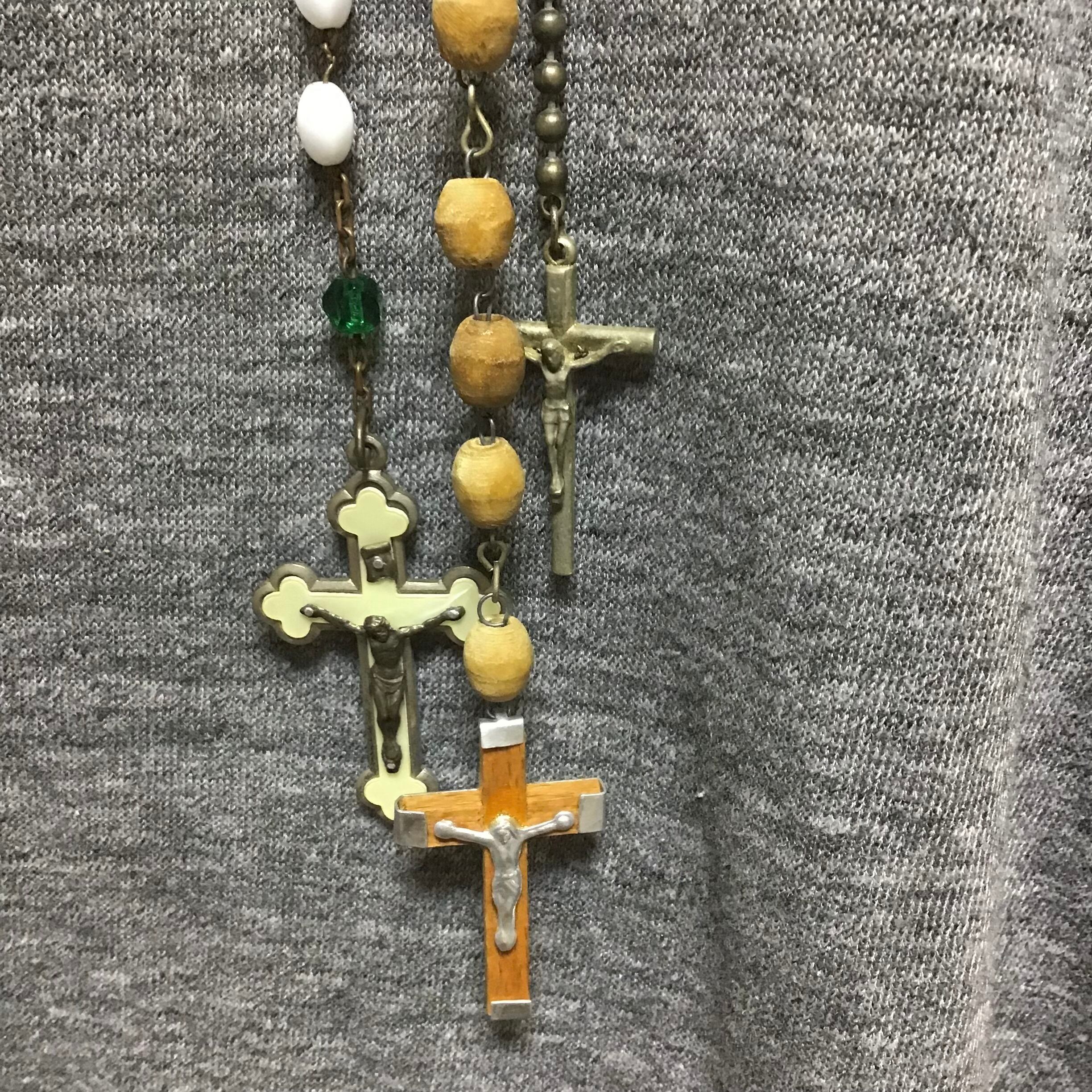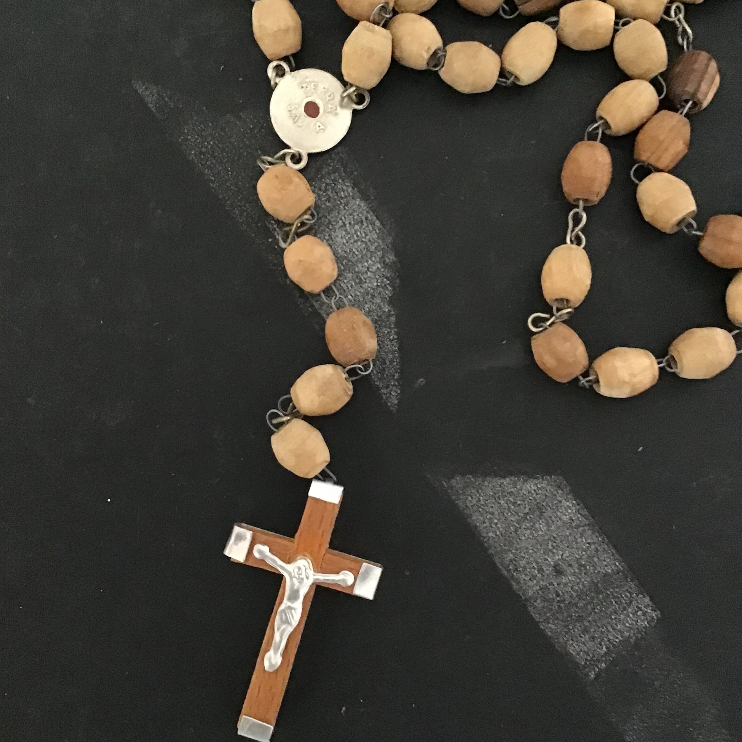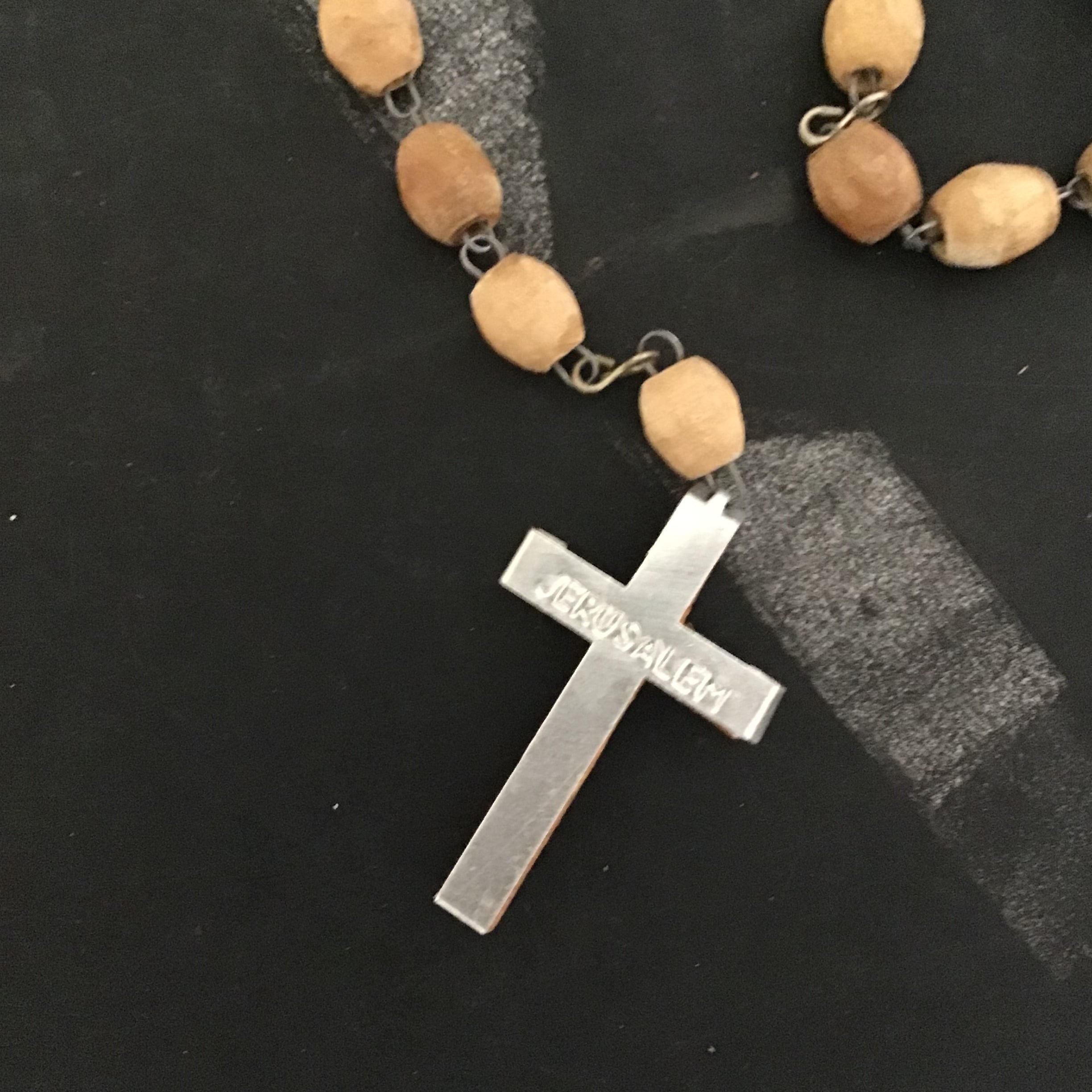 1950年代のロザリオ。木製のチェーンが軽やかで、コットンやリネンはもちろん、これからの季節のニットなどと特に相性良さそうな温かみのあるお品です♡小粒のパールと合わせたり、クロスモチーフをいくつか重ねても素敵です◎