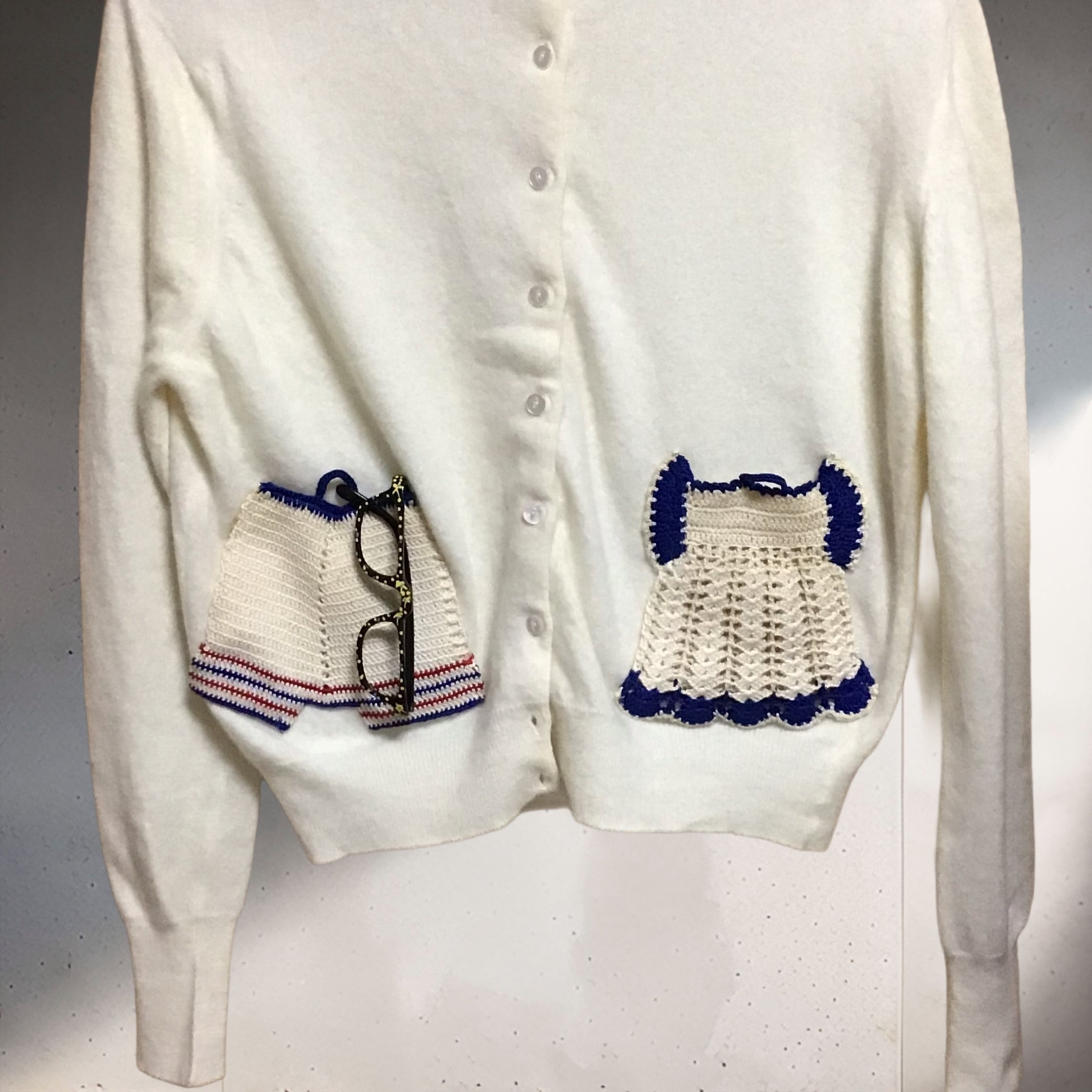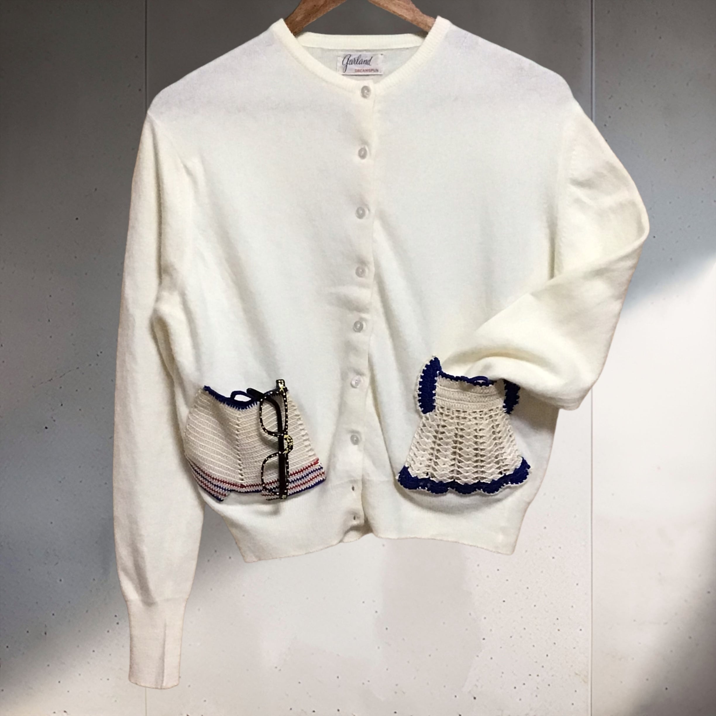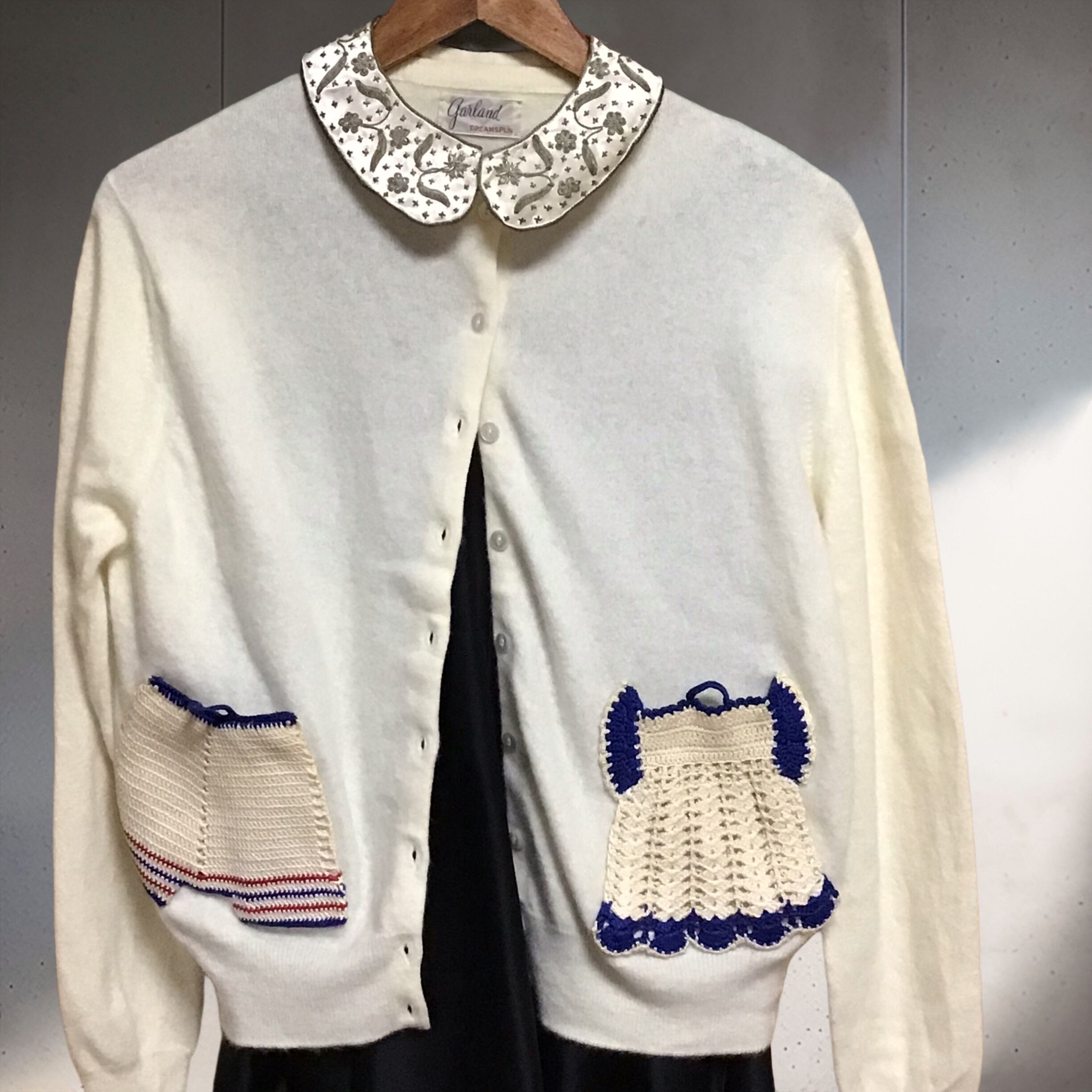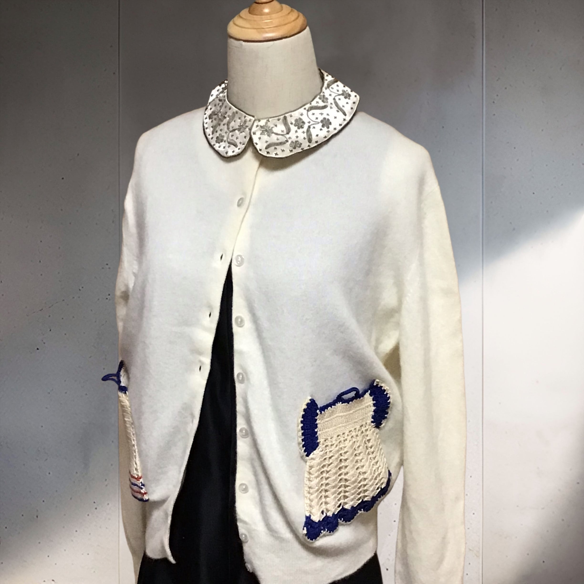 ふんわりとしたウールのカーディガンにドレスとパンツモチーフのニットパーツを施しました◎ニットパーツはそれぞれポケットになっています♡シンプルなコーディネートのポイントに、濃いめのデニムに合わせたり、ワンピースにサラッと羽織ったり、付け襟と合わせても可愛いです!肩に掛ければキュートな後ろ姿に!