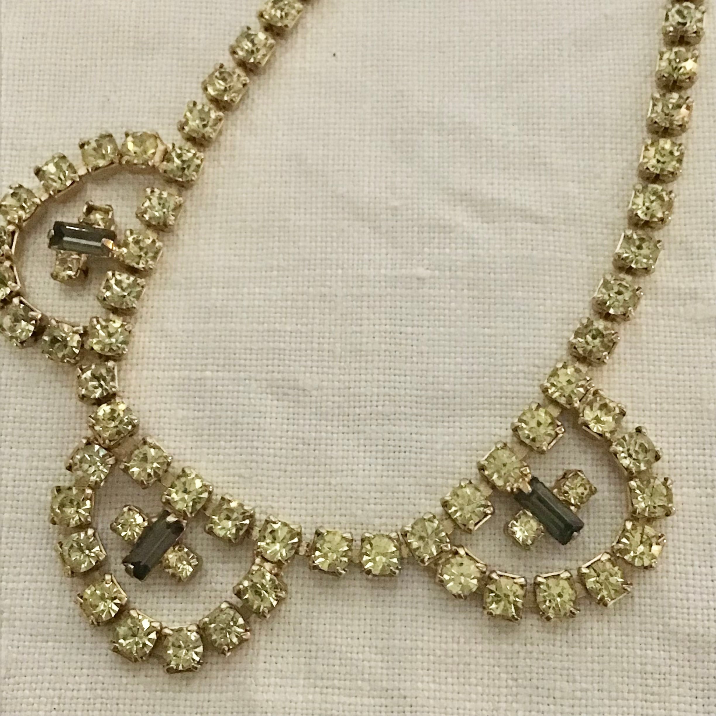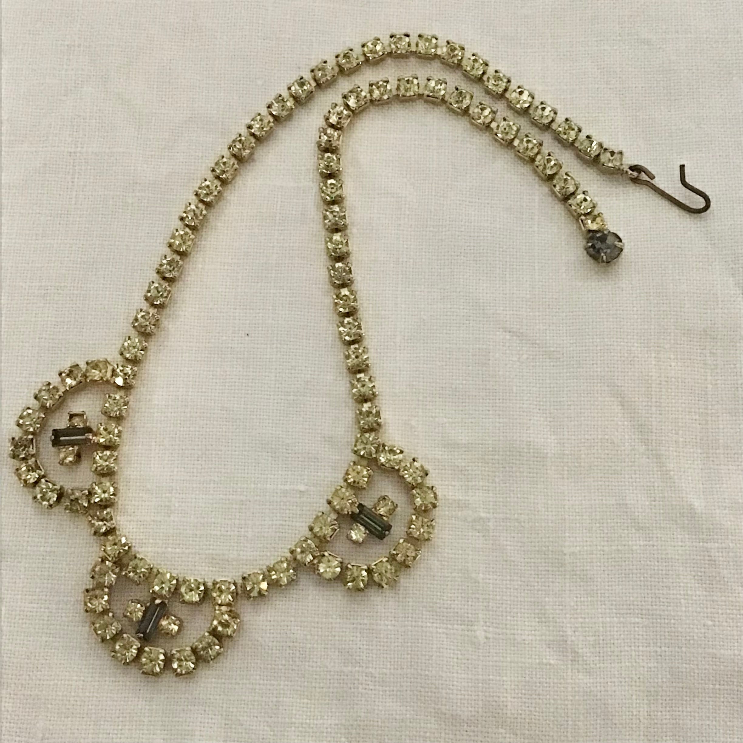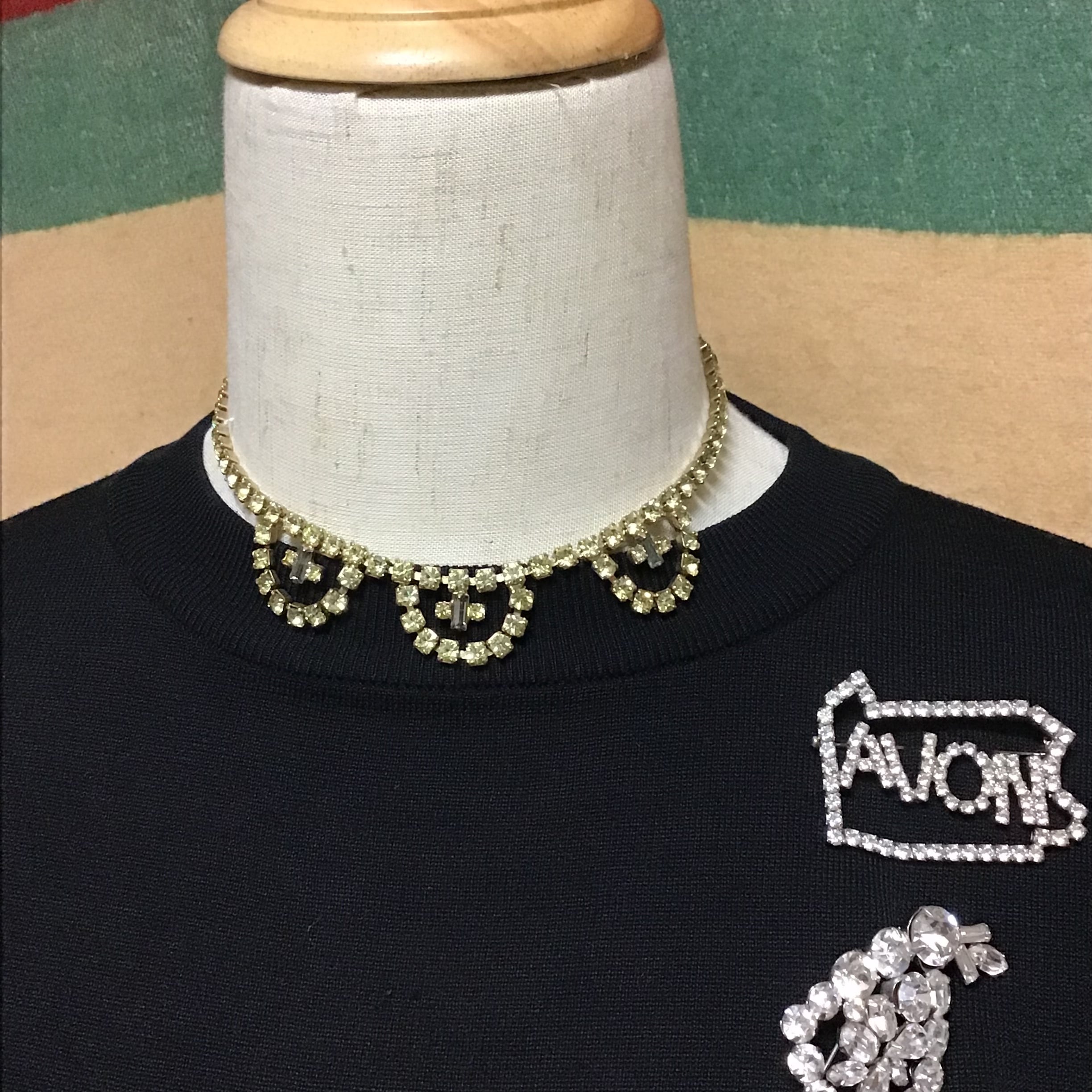1950年代のラインストーンネックレス。薄いイエローとくすんだグリーンの組み合わせが華やかですが肌馴染みも良く、意外と合わせやすいと思います◎お好きな位置でひっかけて使うデザインで、チョーカーのように首にぴったり沿わせても素敵です♡