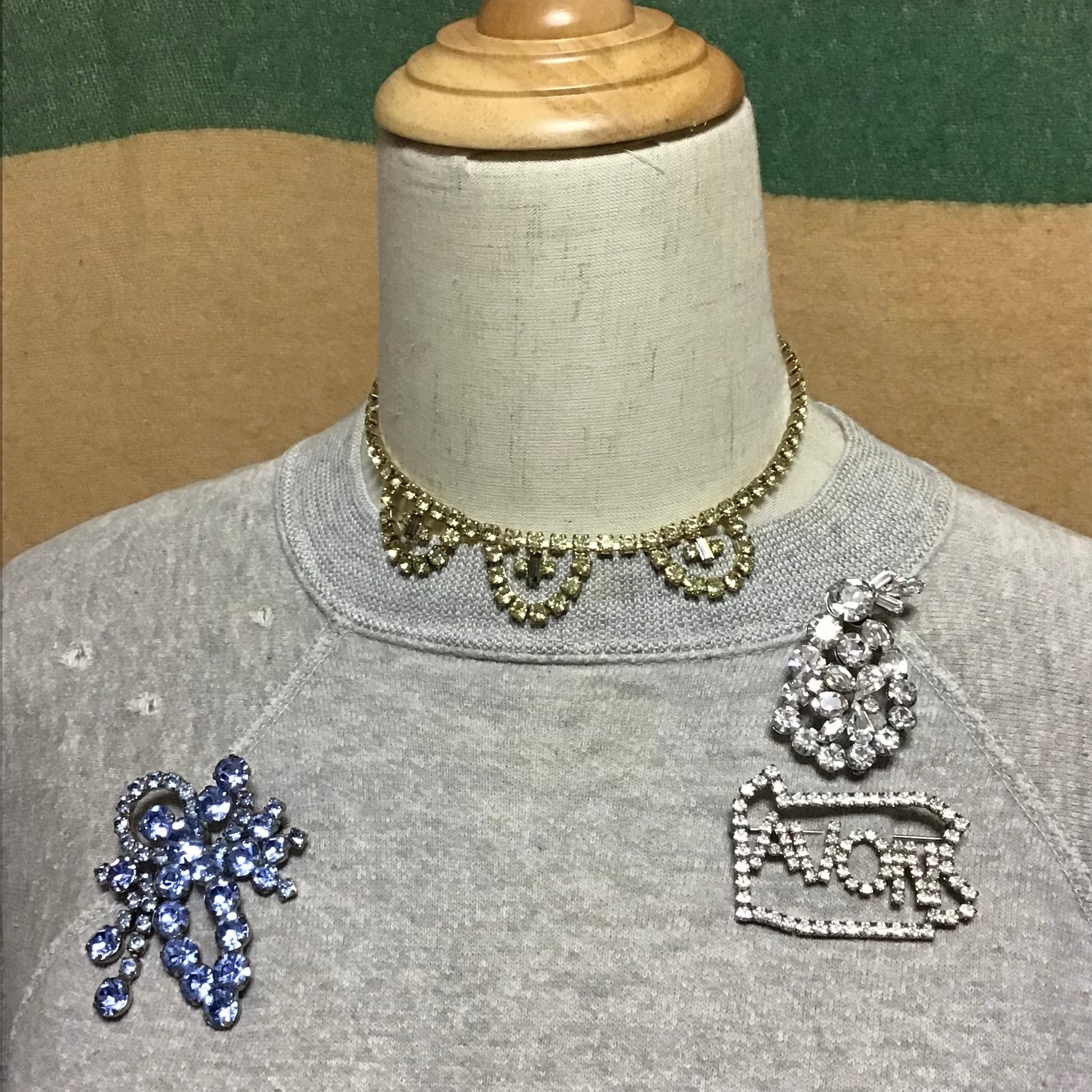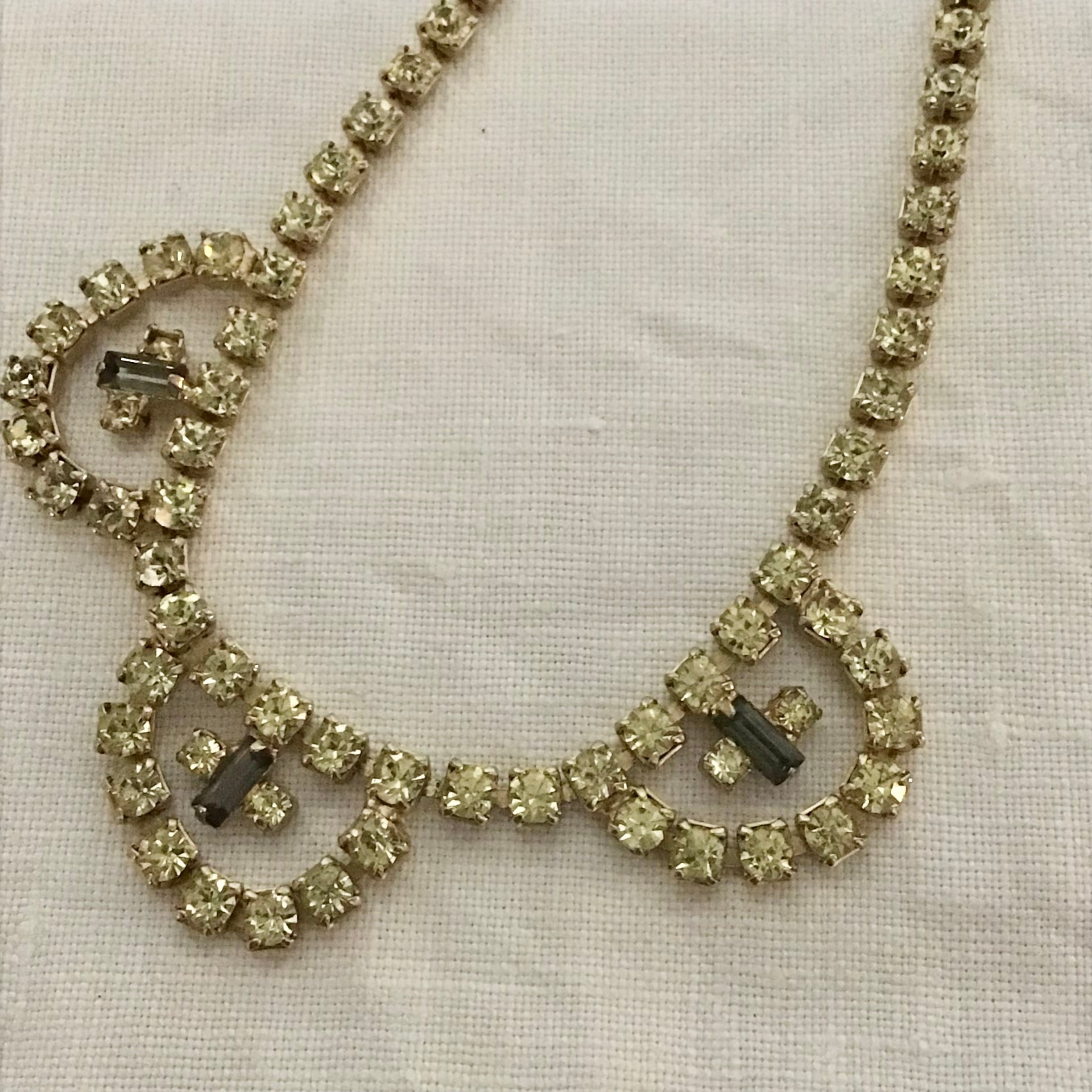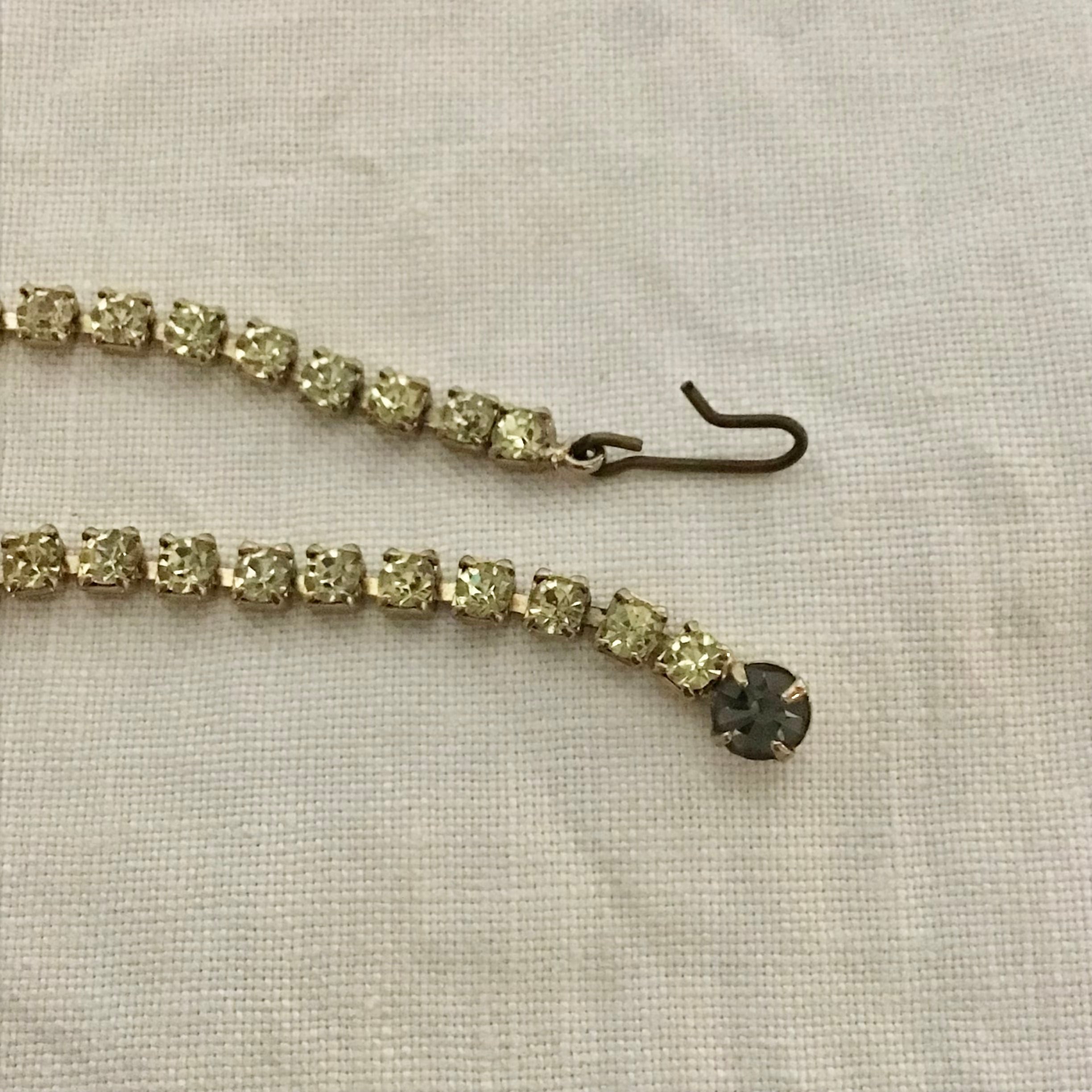 1950年代のラインストーンネックレス。薄いイエローとくすんだグリーンの組み合わせが華やかですが肌馴染みも良く、意外と合わせやすいと思います◎お好きな位置でひっかけて使うデザインで、チョーカーのように首にぴったり沿わせても素敵です♡