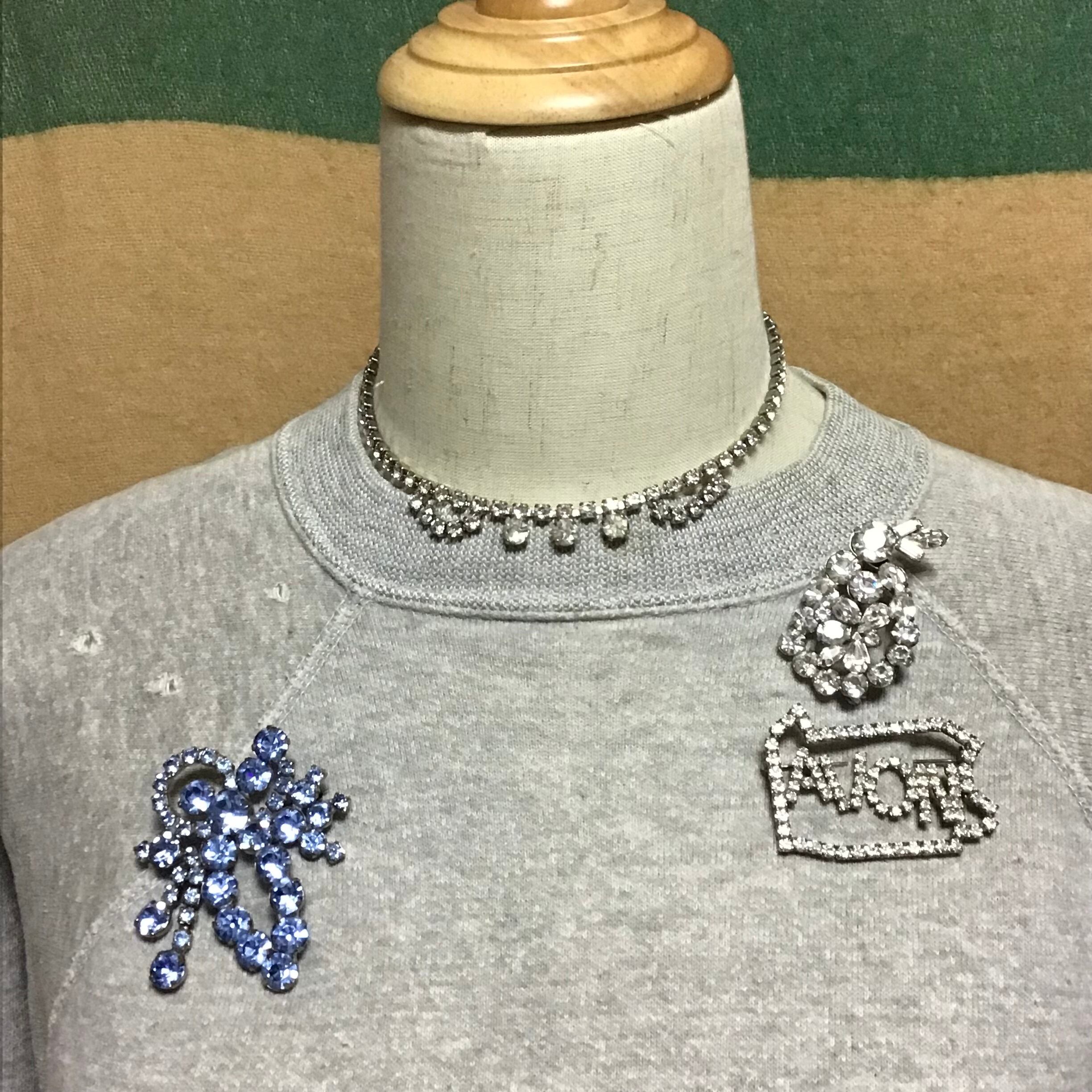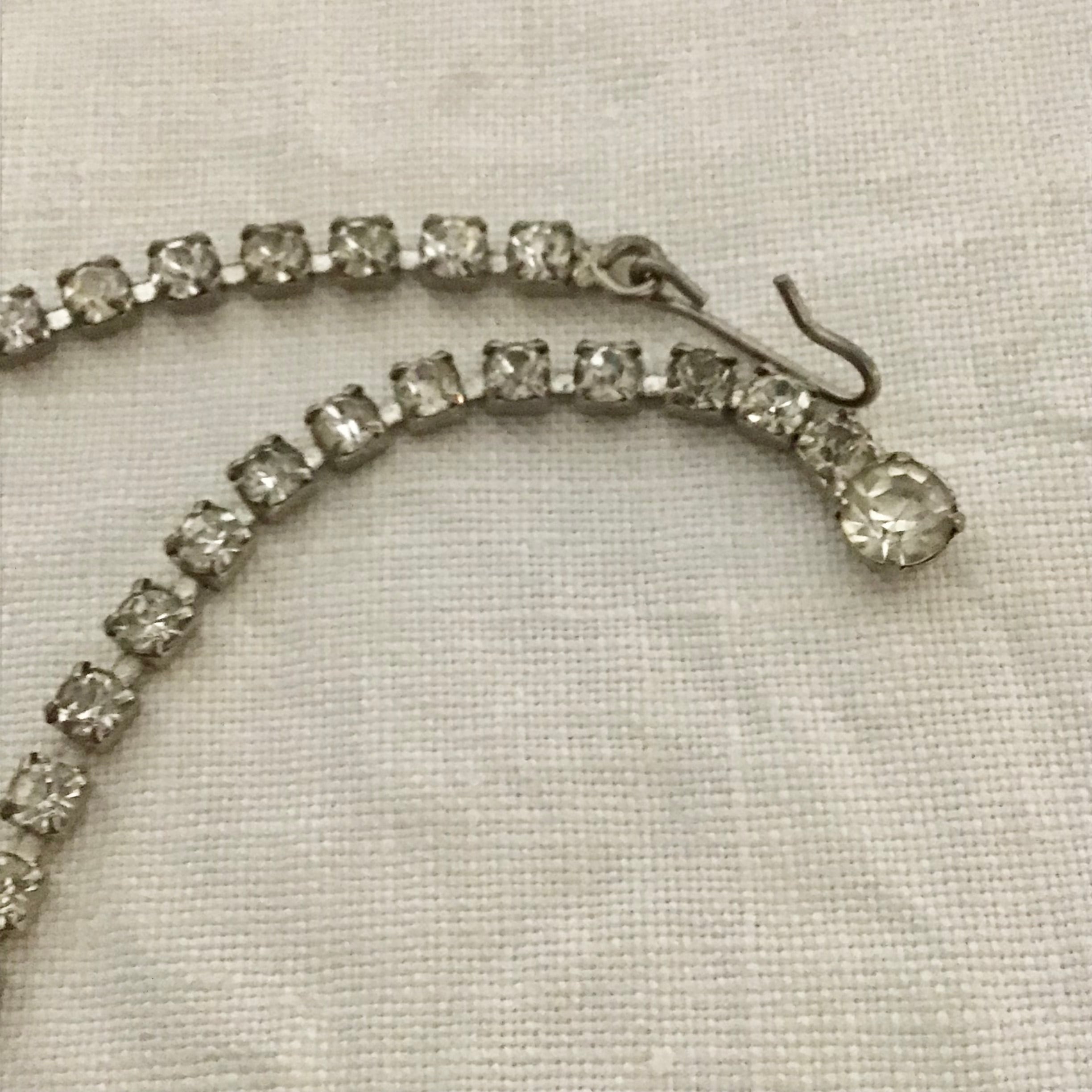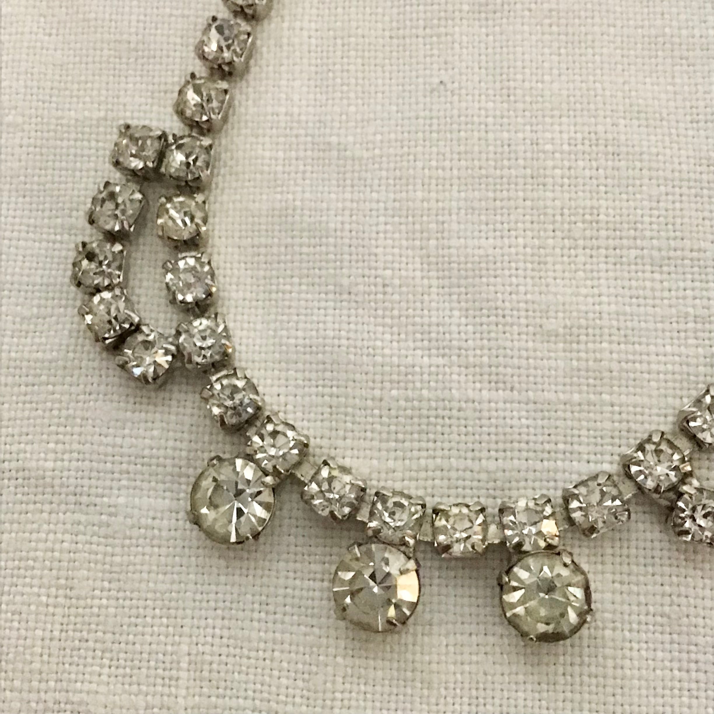 1950年代のラインストーンネックレス。クリアでクラシックなデザインが洗練された印象です♡大ぶりなジュエリーが苦手な方にも使いやすいと思います◎お好きな位置でひっかけて使うデザインで、チョーカーのように首にぴったり沿わせても素敵です♡Tシャツやスウェットからオケージョンまで幅広くお使い頂けます!
