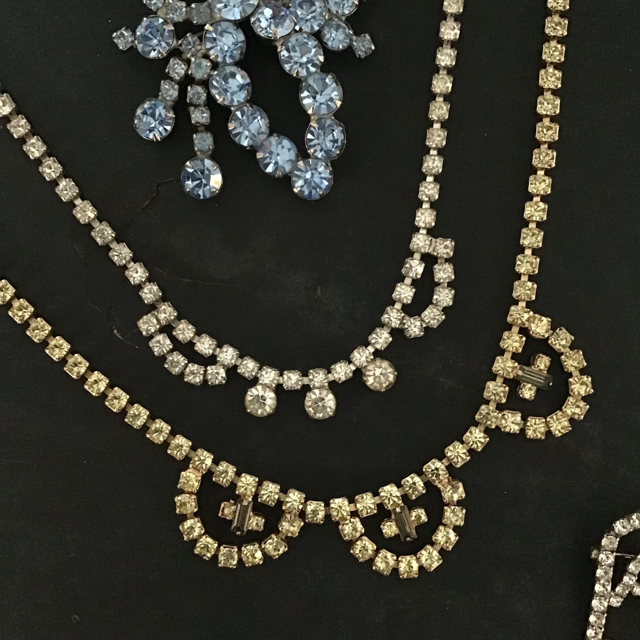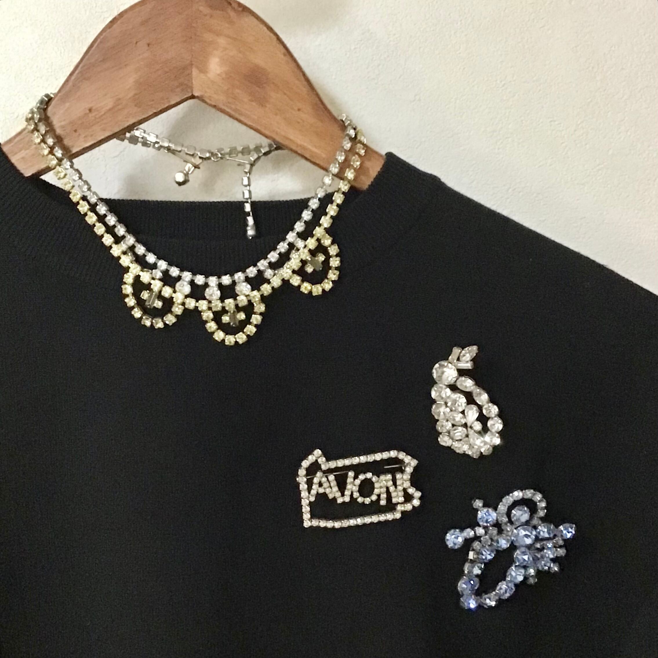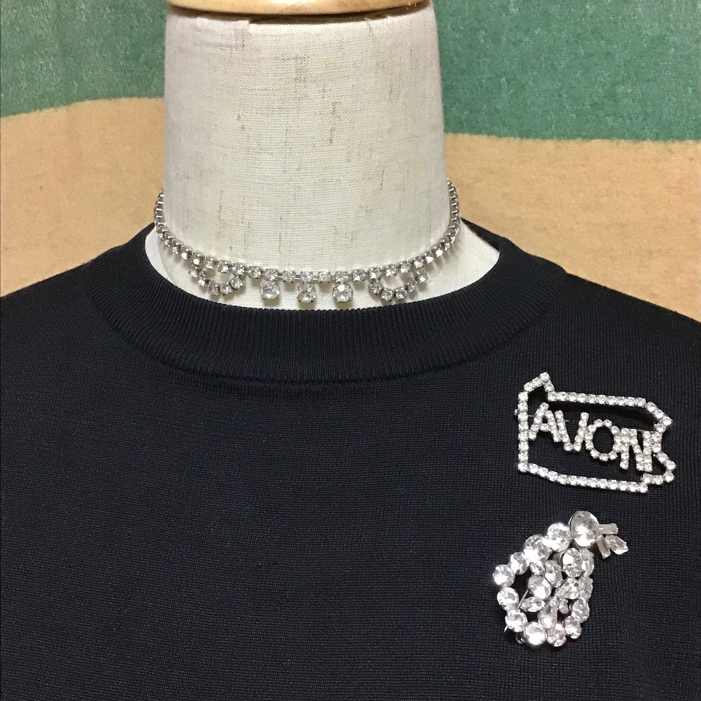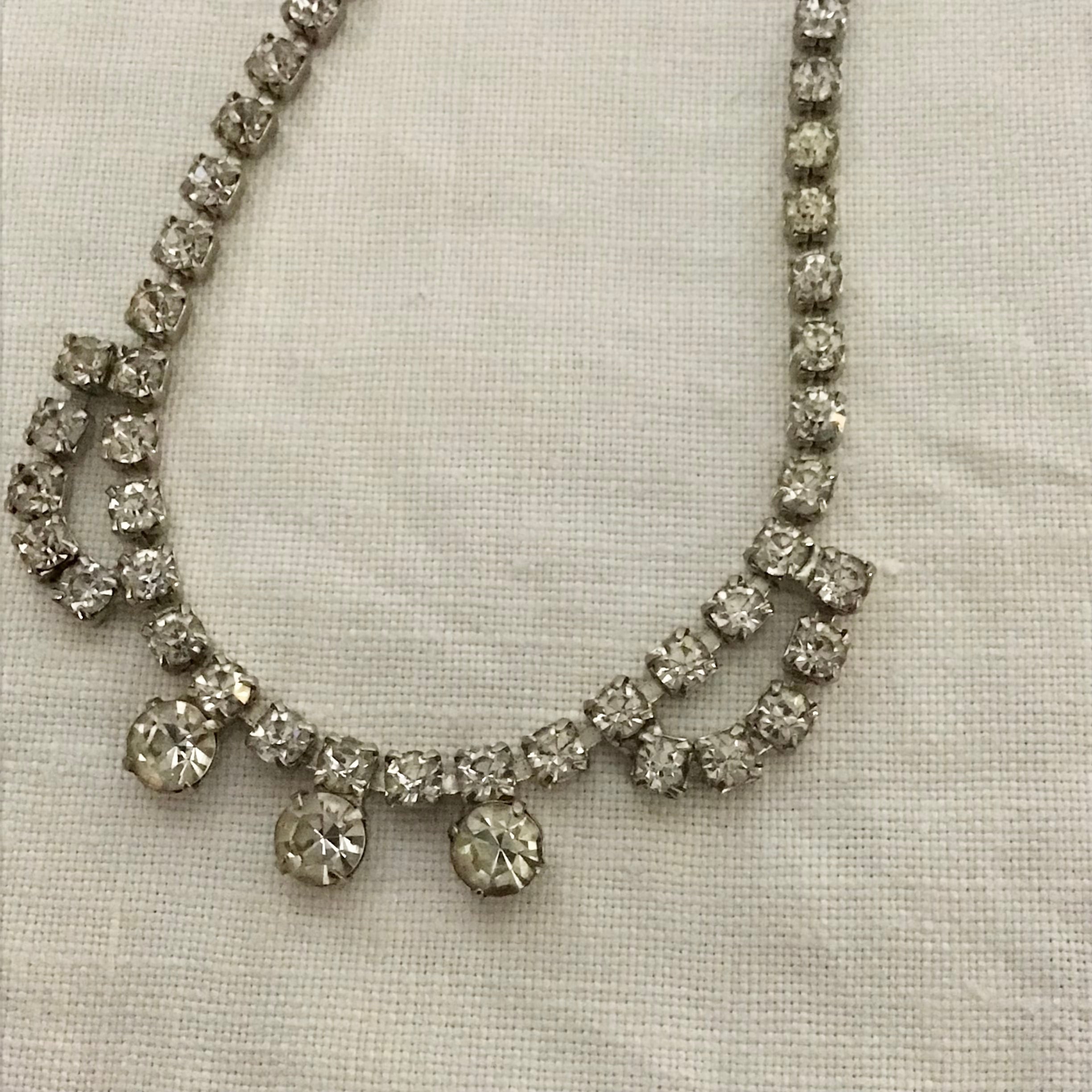 1950年代のラインストーンネックレス。クリアでクラシックなデザインが洗練された印象です♡大ぶりなジュエリーが苦手な方にも使いやすいと思います◎お好きな位置でひっかけて使うデザインで、チョーカーのように首にぴったり沿わせても素敵です♡Tシャツやスウェットからオケージョンまで幅広くお使い頂けます!