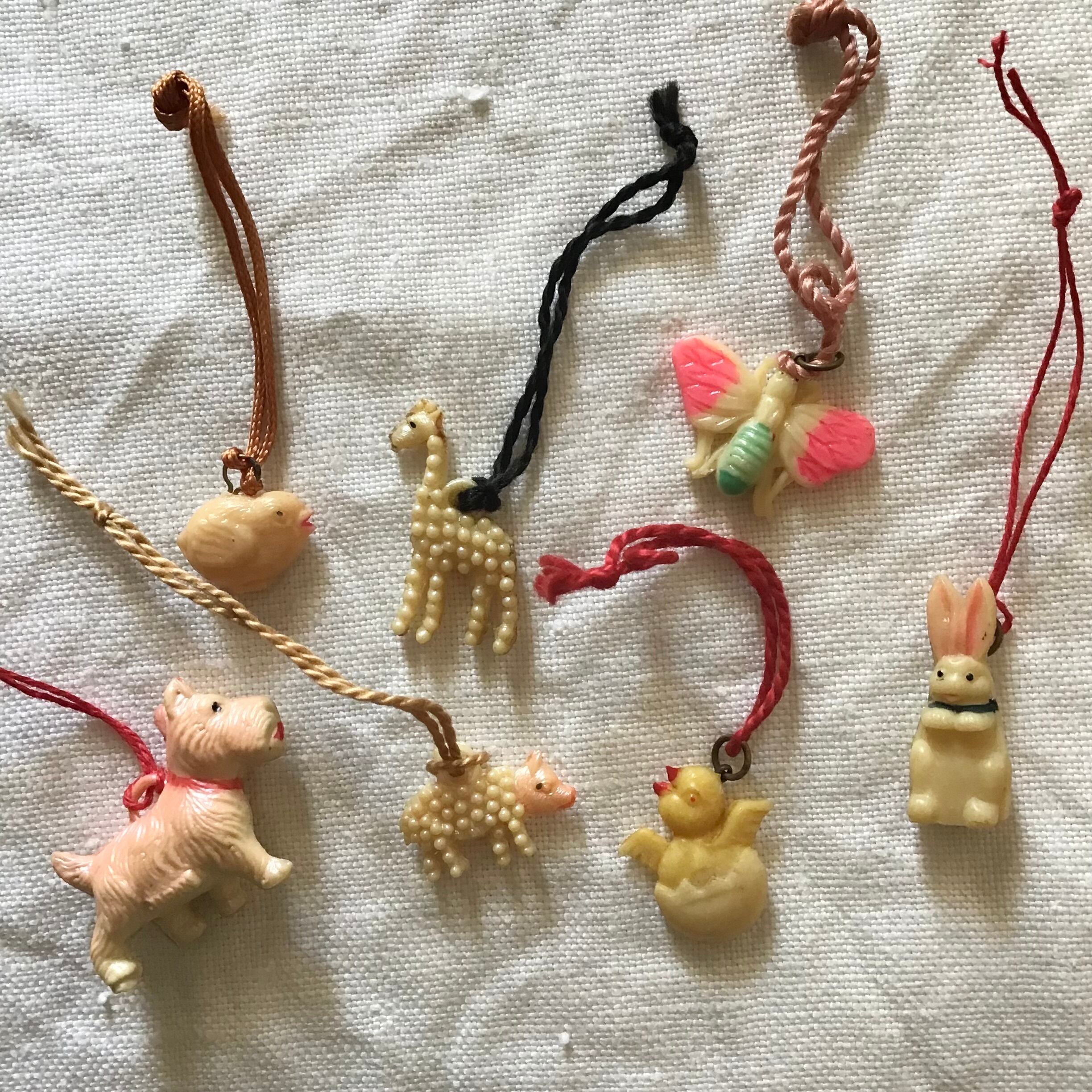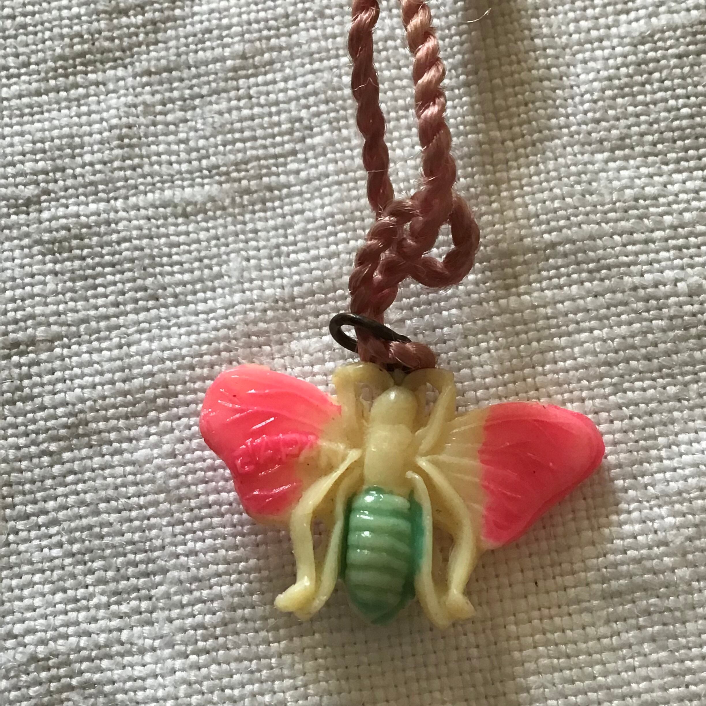 1950年代頃のガムボールのおまけチャーム、ピンクとグリーンの配色が良いチョウです。ブローチやネックレスにしたり、襟の先やお気に入りのポーチに縫い付けても可愛いです♡ボールチェーンをお付けしますので必要に応じてお使いください◎
