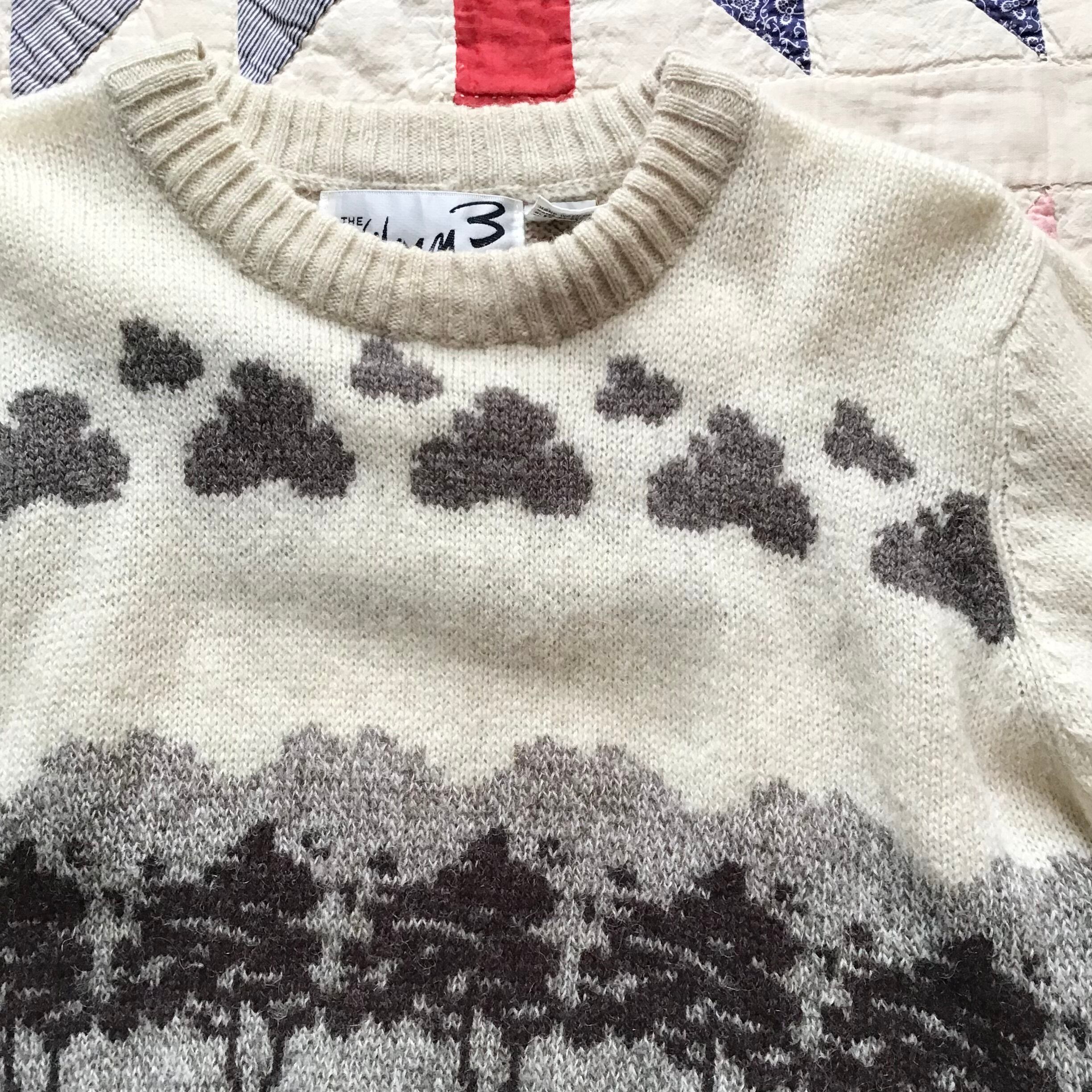 1990年代の柄編みニット。ふんわりとした軽い着心地のウールに、羊たちが並んだ風景が可愛いらしいお品です♡コンパクトなサイズ感でアウターも羽織りやすく、スッキリしたシルエットがカジュアルになりすぎず良い雰囲気です◎