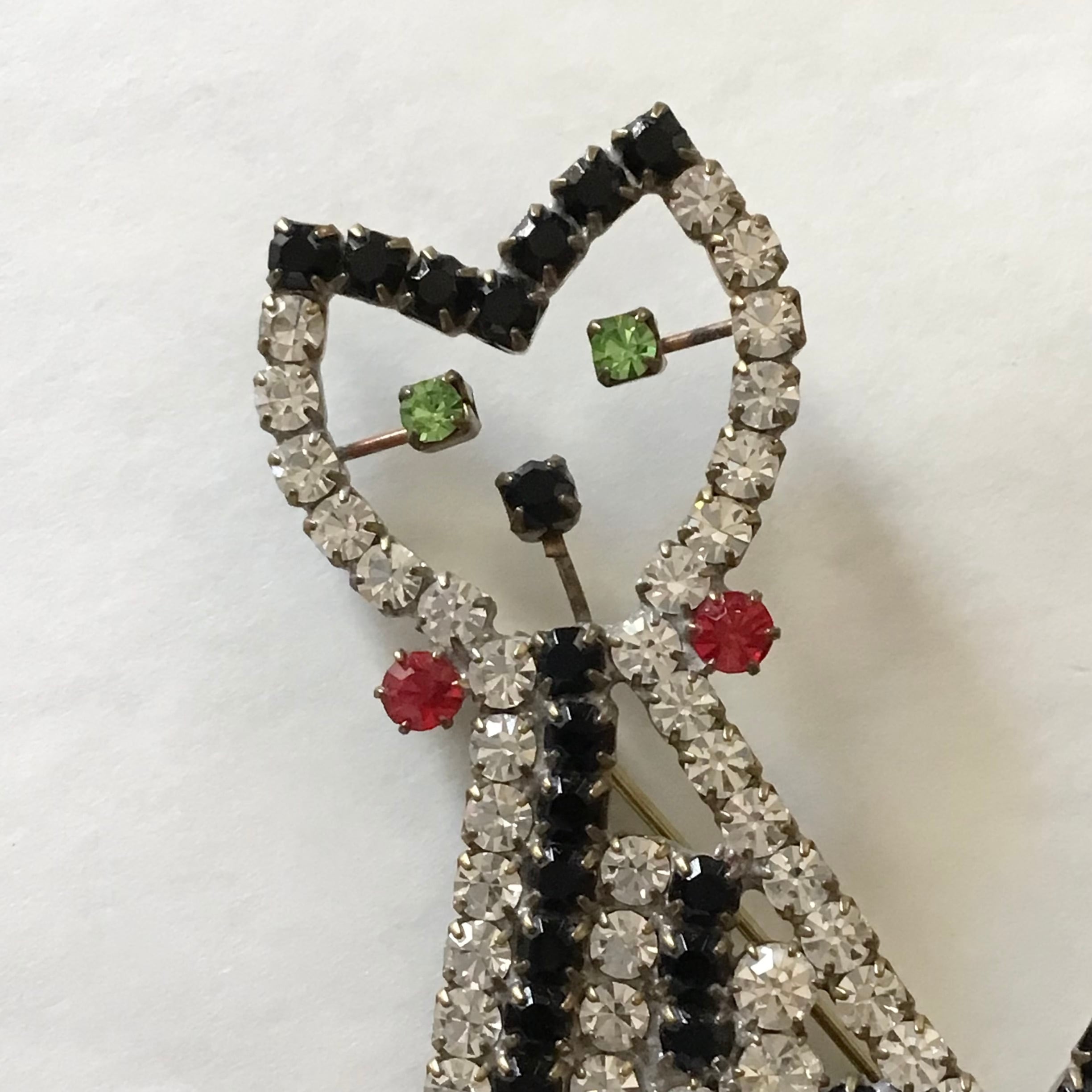 チェコガラスのブローチ、こちらは新品です◎モノトーンにちょこんと入った赤とグリーンが可愛い猫ちゃん♡1個でも存在感のある程よいサイズです。ニットやコートにつけて、一緒にお出掛けをお楽しみください!