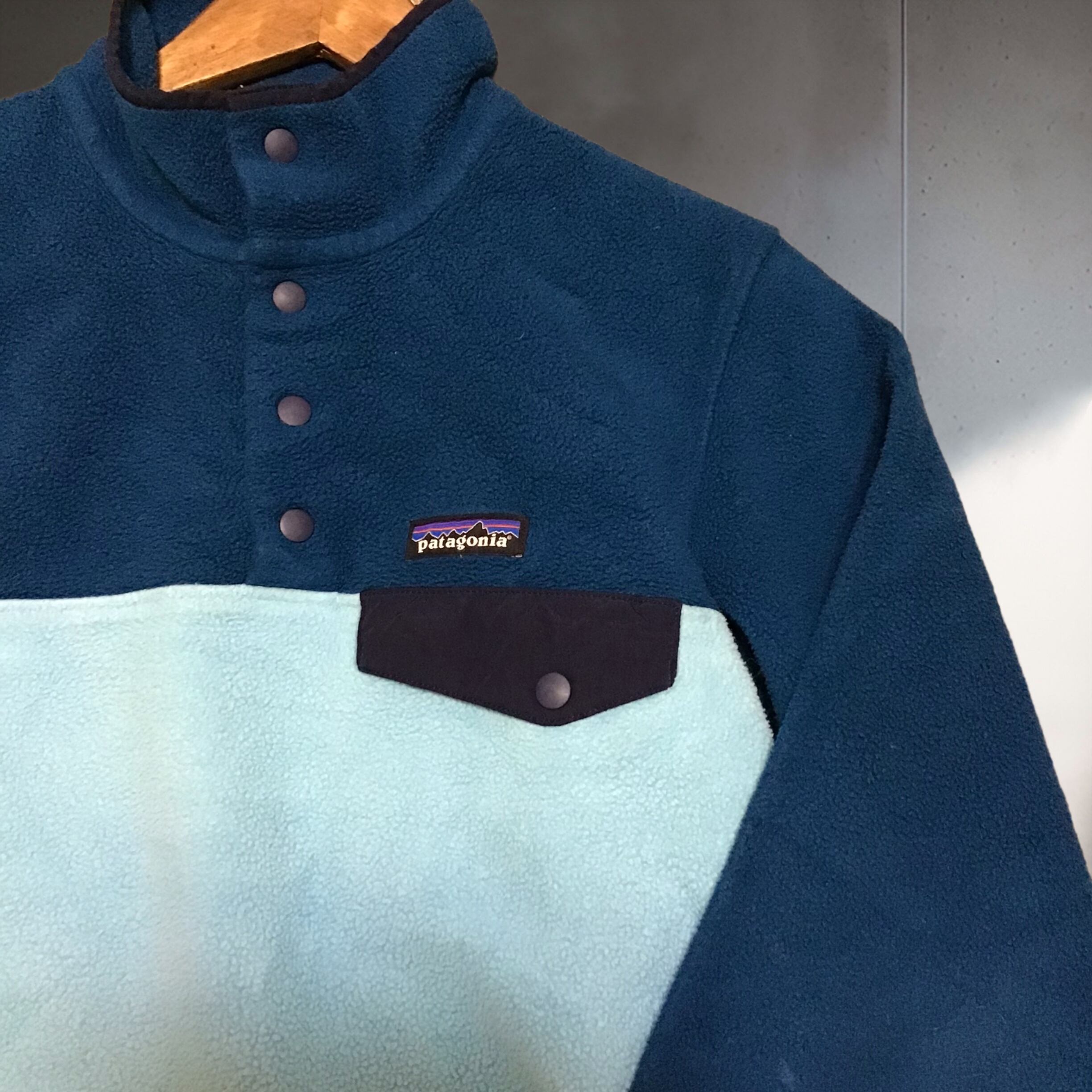 パタゴニアのシンチラスナップT。ブルートーンのカラーがキレイで、暗くなりがちな冬のコーディネートを明るく見せてくれそうです◎コートのインナーとして、ニット代わりに、キレイめなトラッドスタイルにプラスしても可愛いと思います!