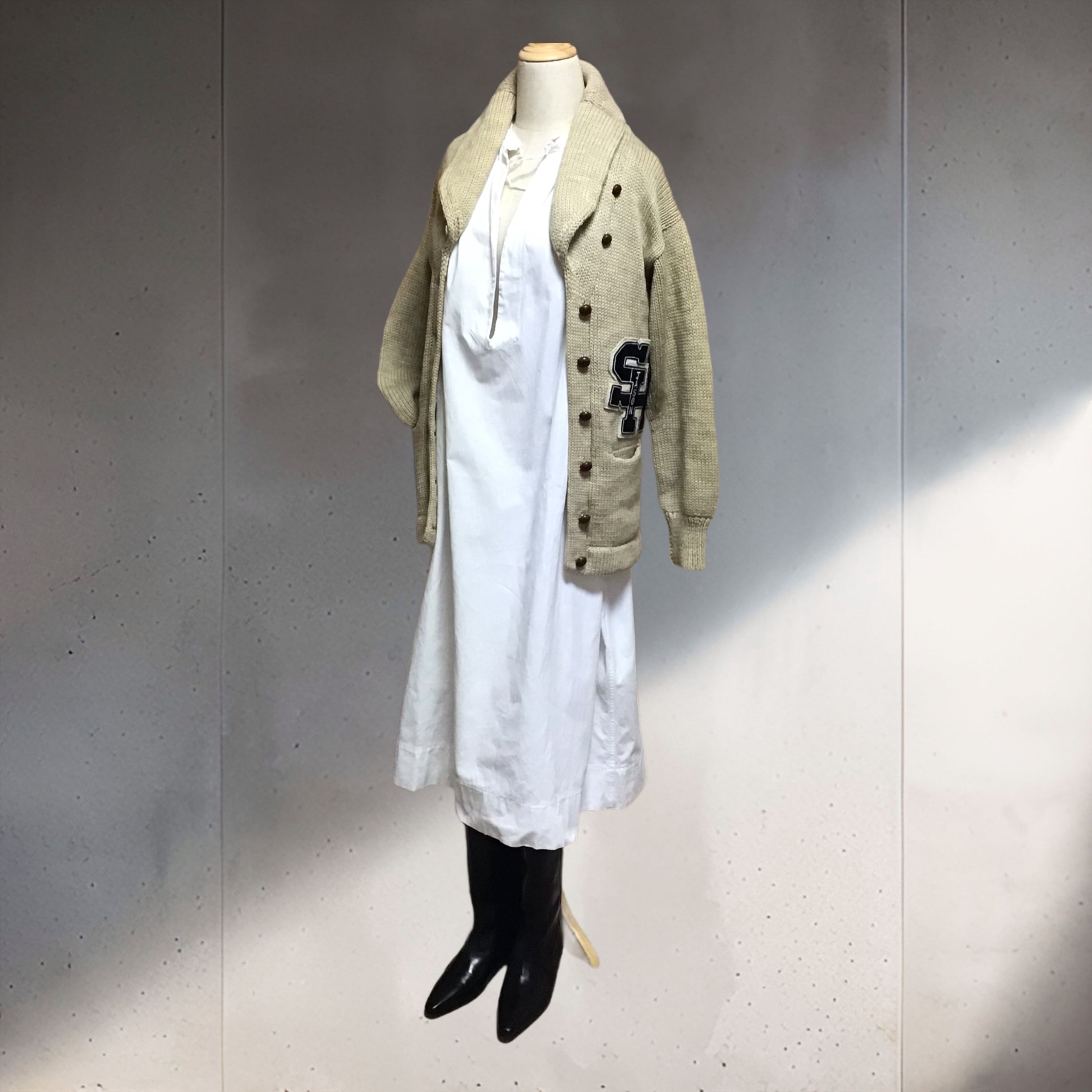 1950年代のレタードカーディガン。ヴィンテージらしいモチっとした厚みのあるウールにへちま襟、ミックスベージュの様なお色目に大きなワッペンがよく合い良い雰囲気です♡コンパクトなサイズ感でゆったりめのアウターなら羽織って頂けそうです◎パンツスタイルはもちろん、コットンやリネンのワンピースに合わせても可愛いです!