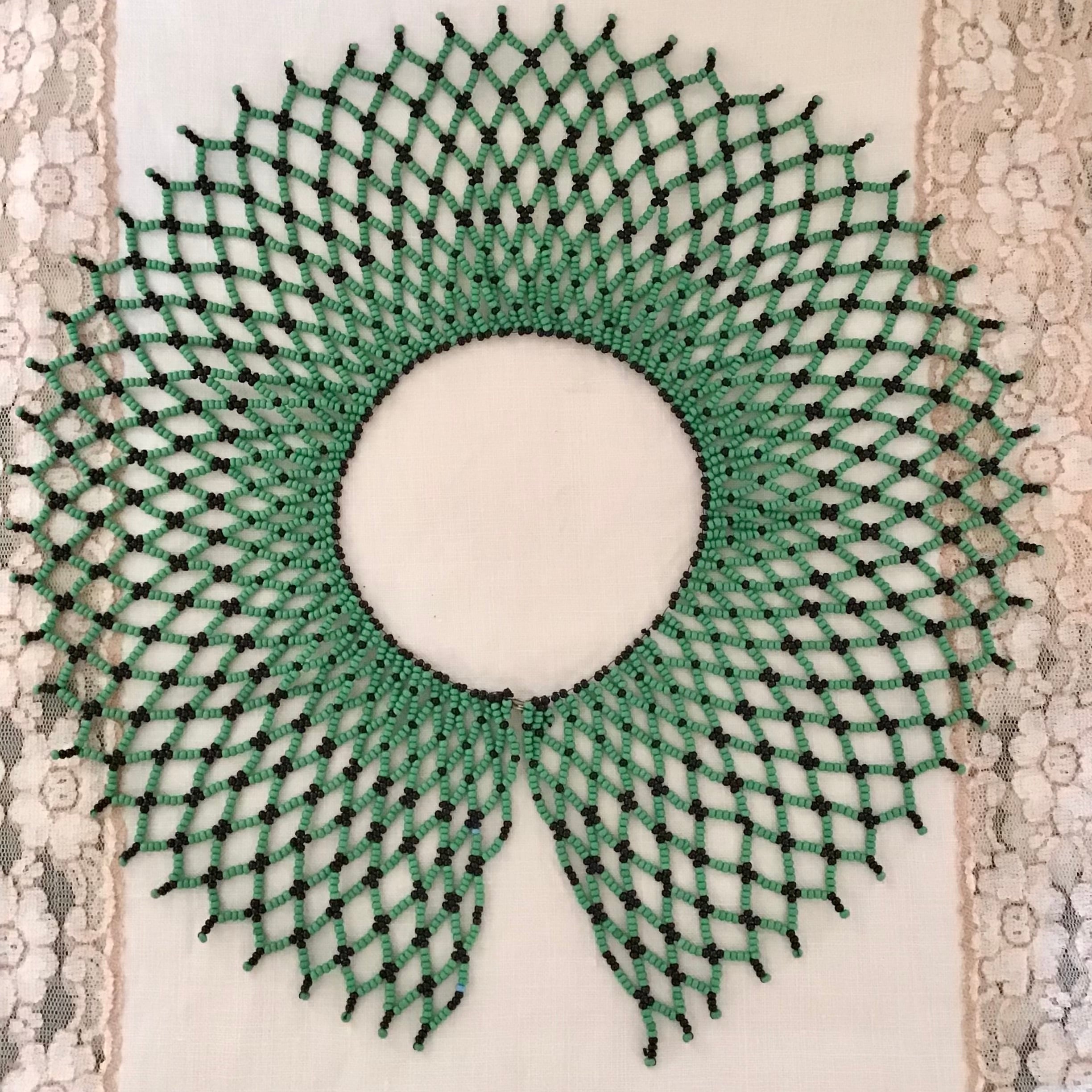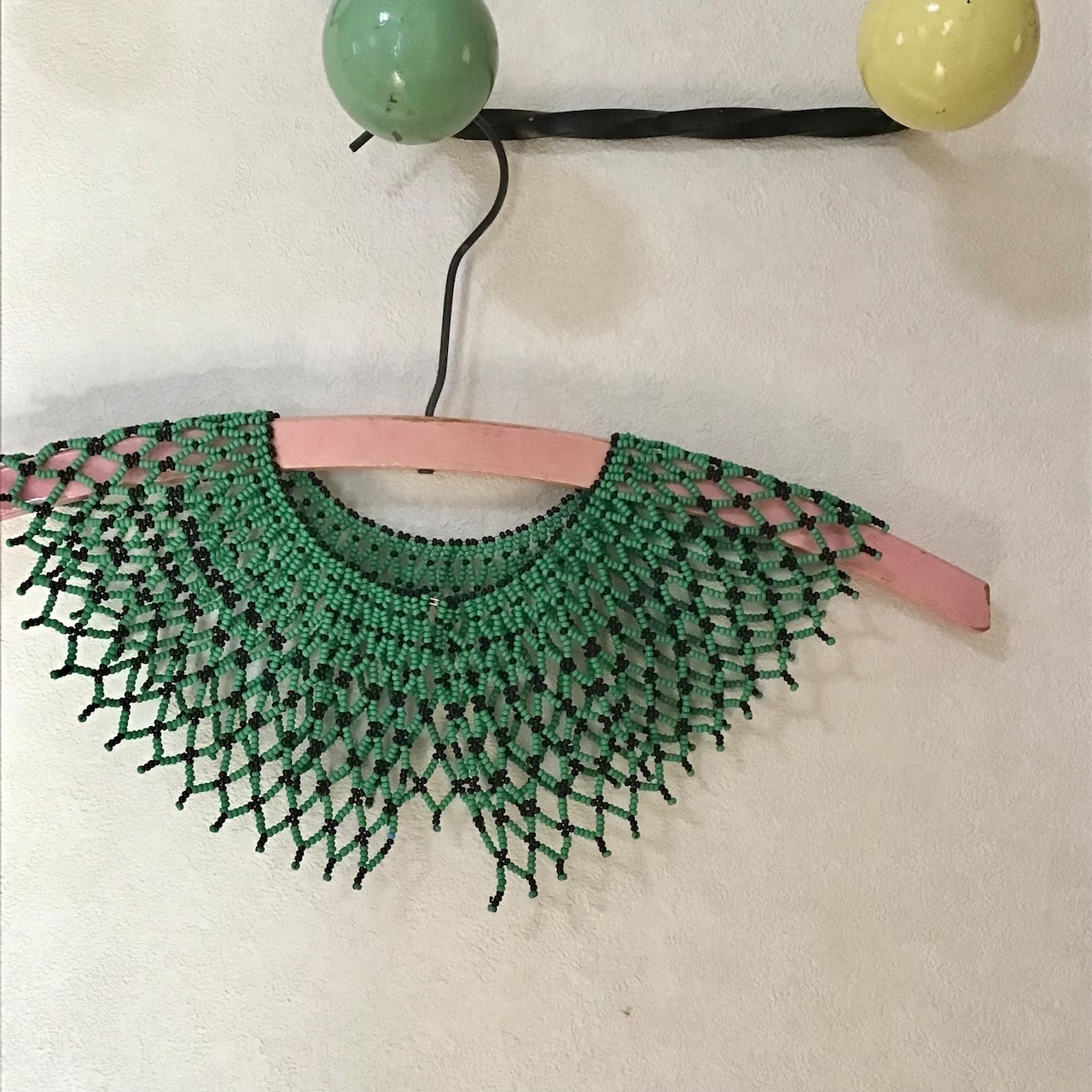 1970年代、ハンドメイドのビーズの付け襟です。少しくすんだグリーンと黒の組み合わせが意外と合わせやすく、Tシャツからニットまで幅広く合わせて頂けます♡幅広めなので、ノースリーブに合わせても可愛いです◎