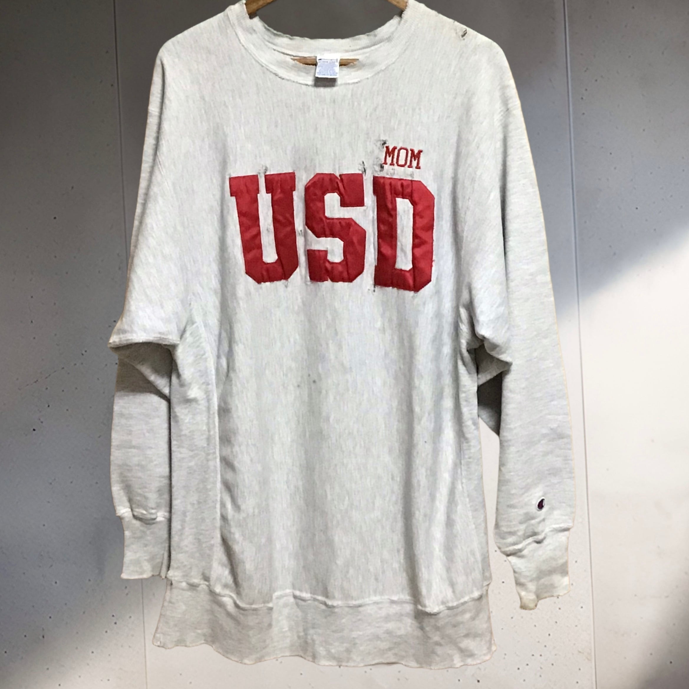 1990年代、チャンピオンリバースウィーブ。あまり見ないXXXLのビッグサイズでワンピース風に着られるサイズ感です♡ボロのため、穴や汚れ、生地の劣化はありますがとても良い雰囲気です◎フロントの赤いアップリケも可愛いらしく、まだまだ更にボロへと育てていけるお品です!
