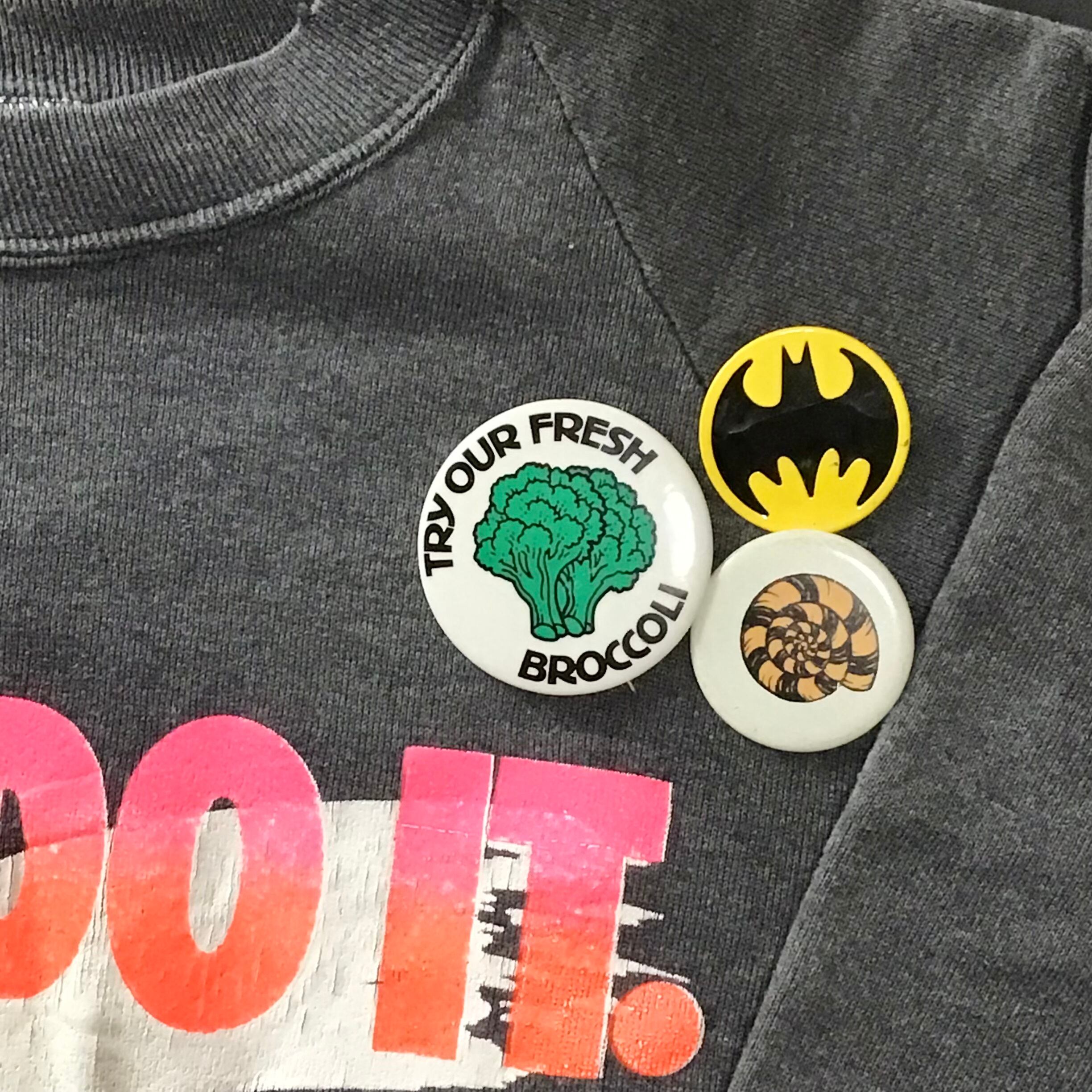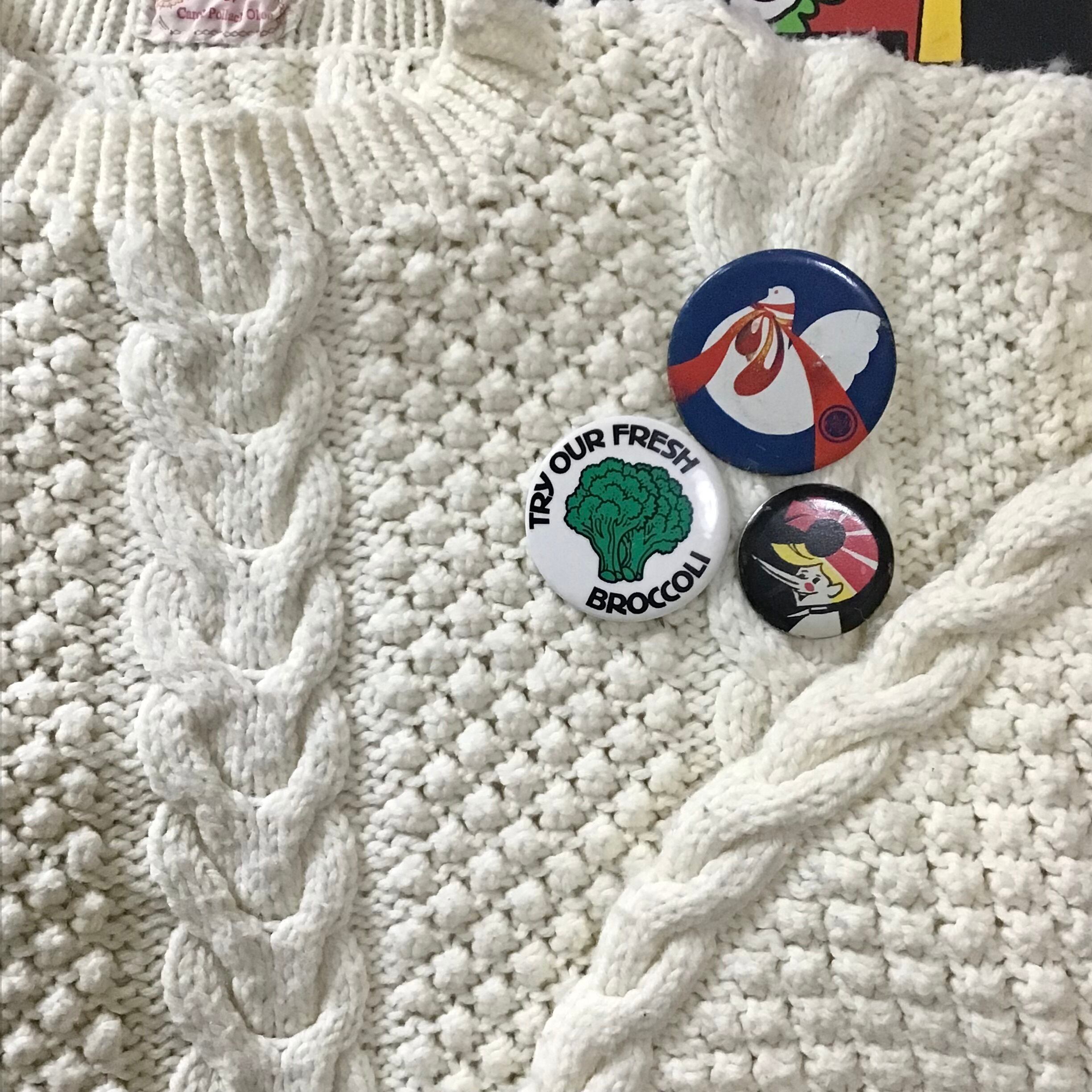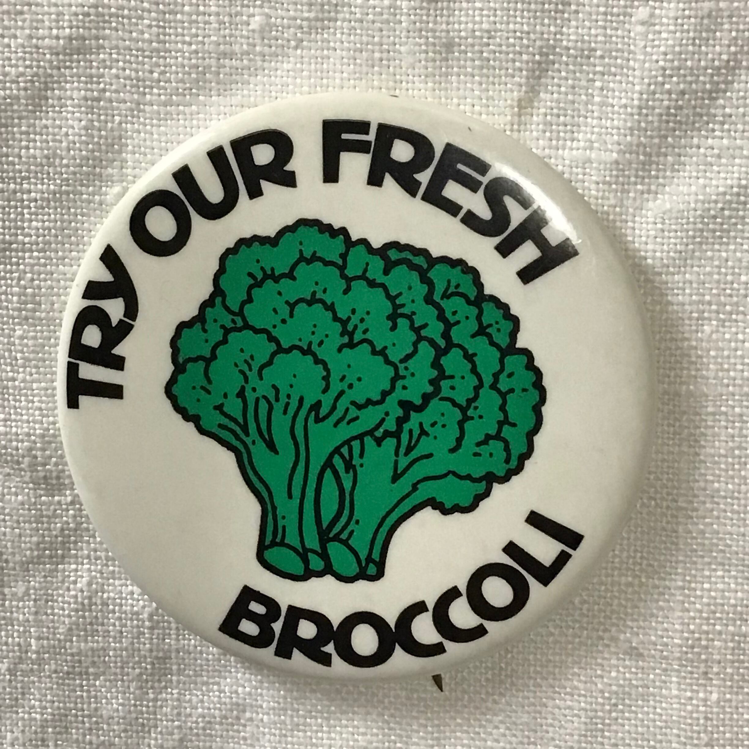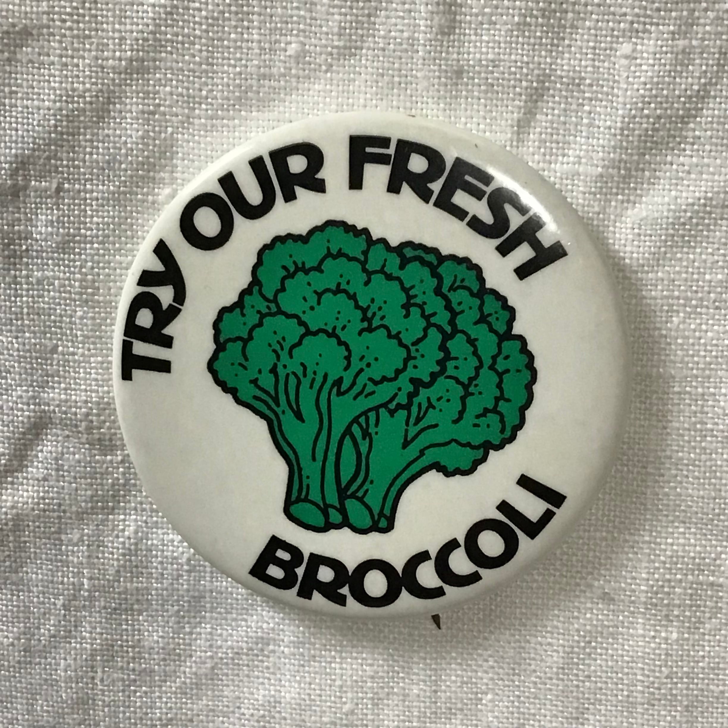 1970年代のブロッコリー柄缶バッジ。その文字の通り、とても新鮮で美味しそうなブロッコリーです♡キレイ目なコーディネートのハズしにしたり、何かと使えそうな缶バッジです◎ブロッコリー好きの方へのギフトにも!