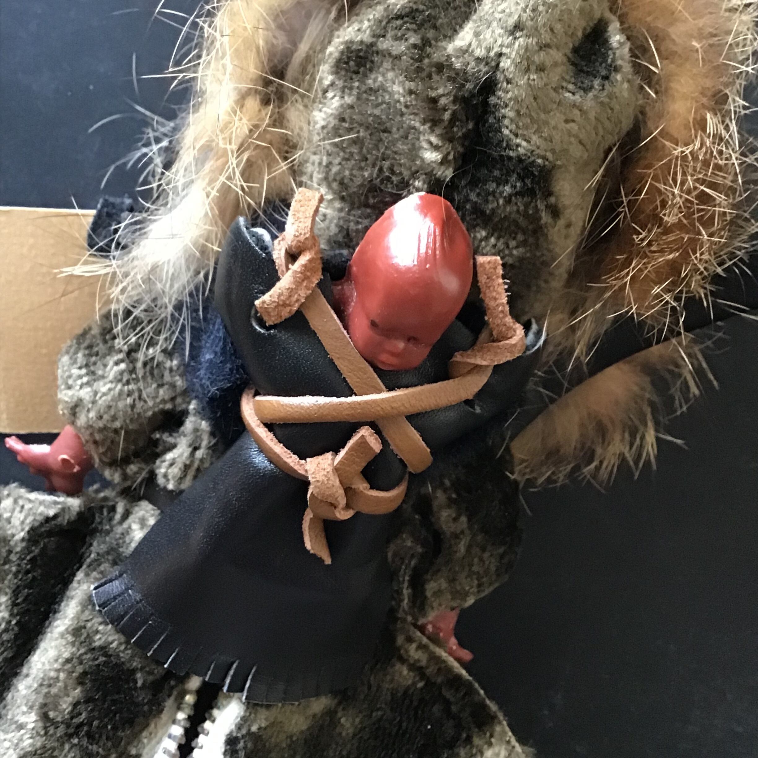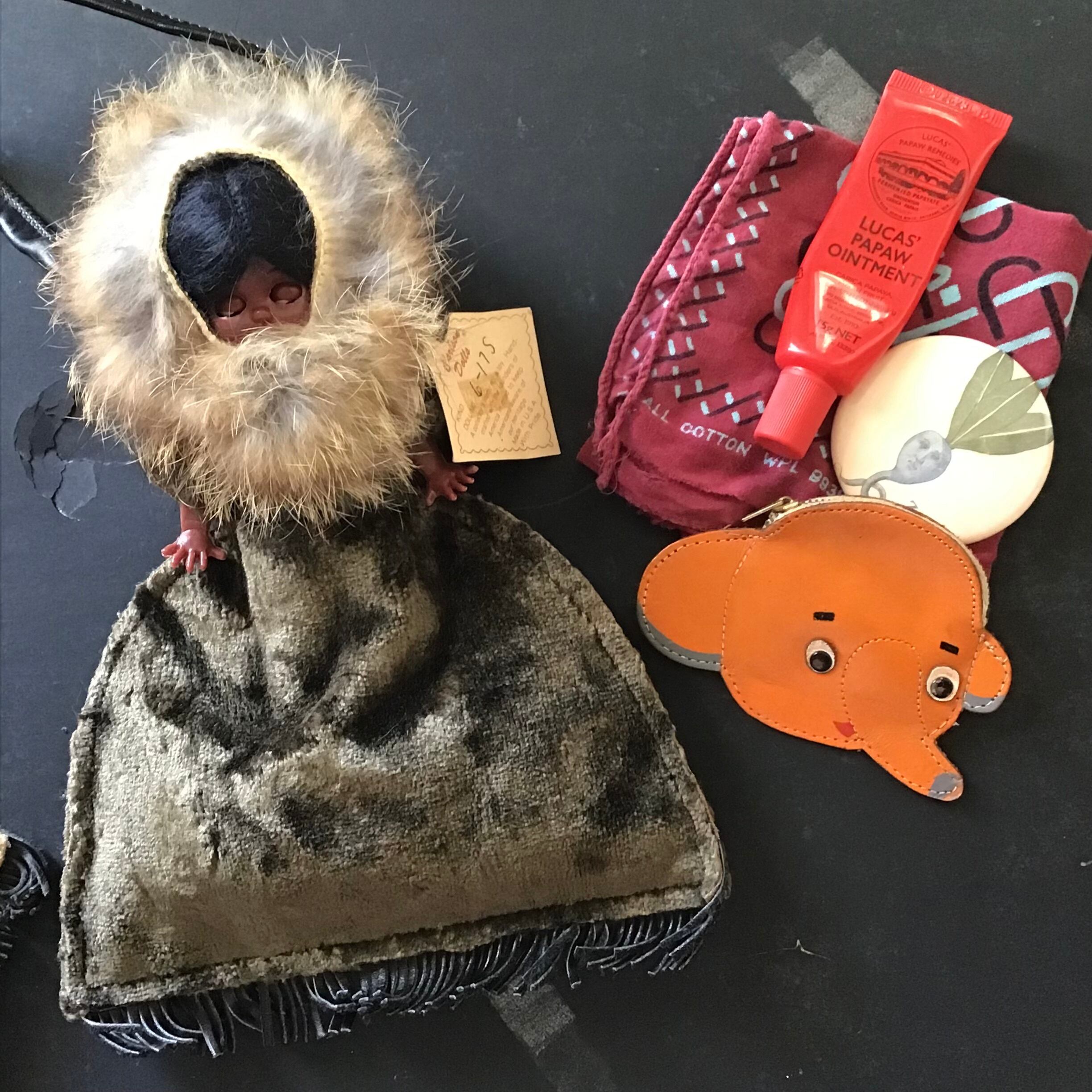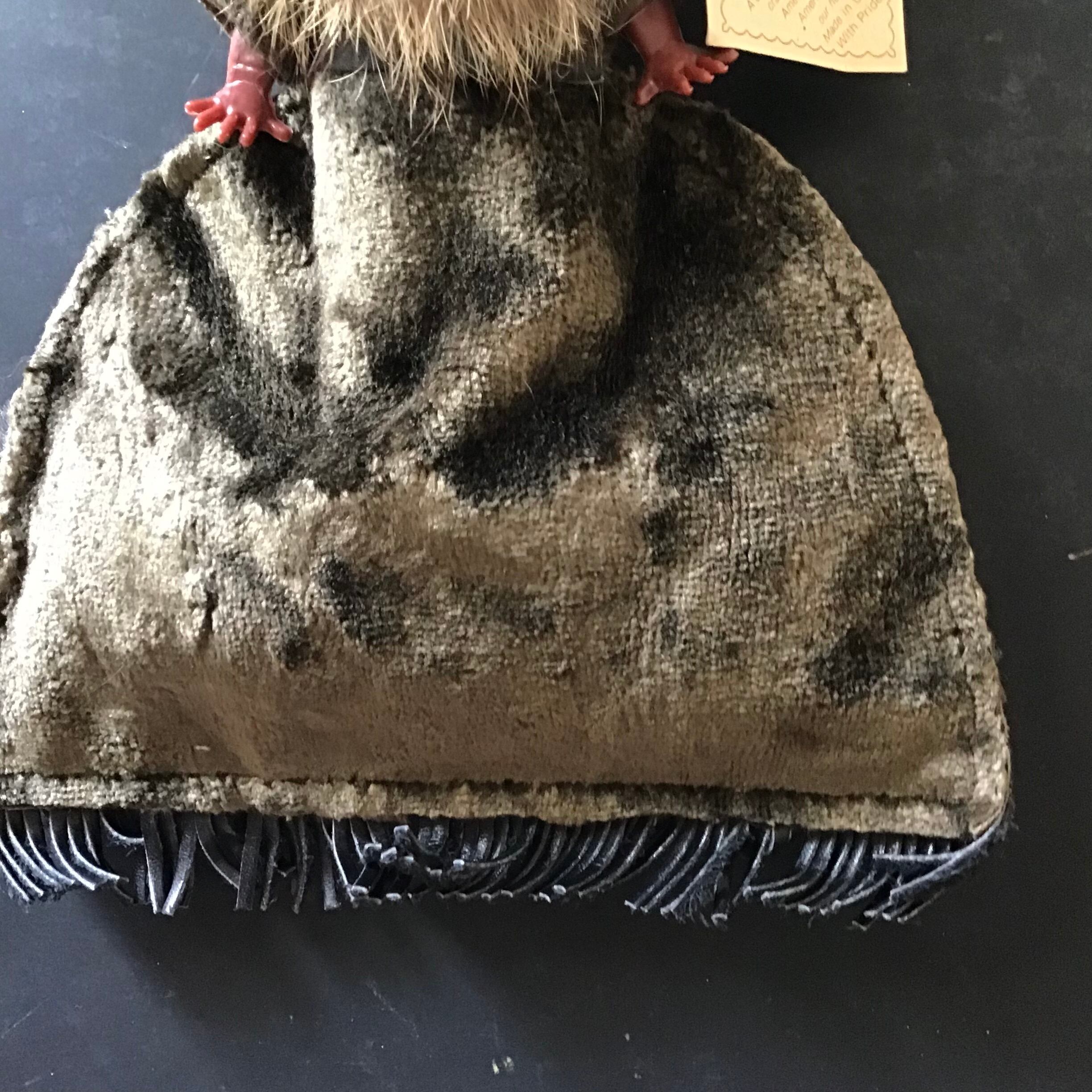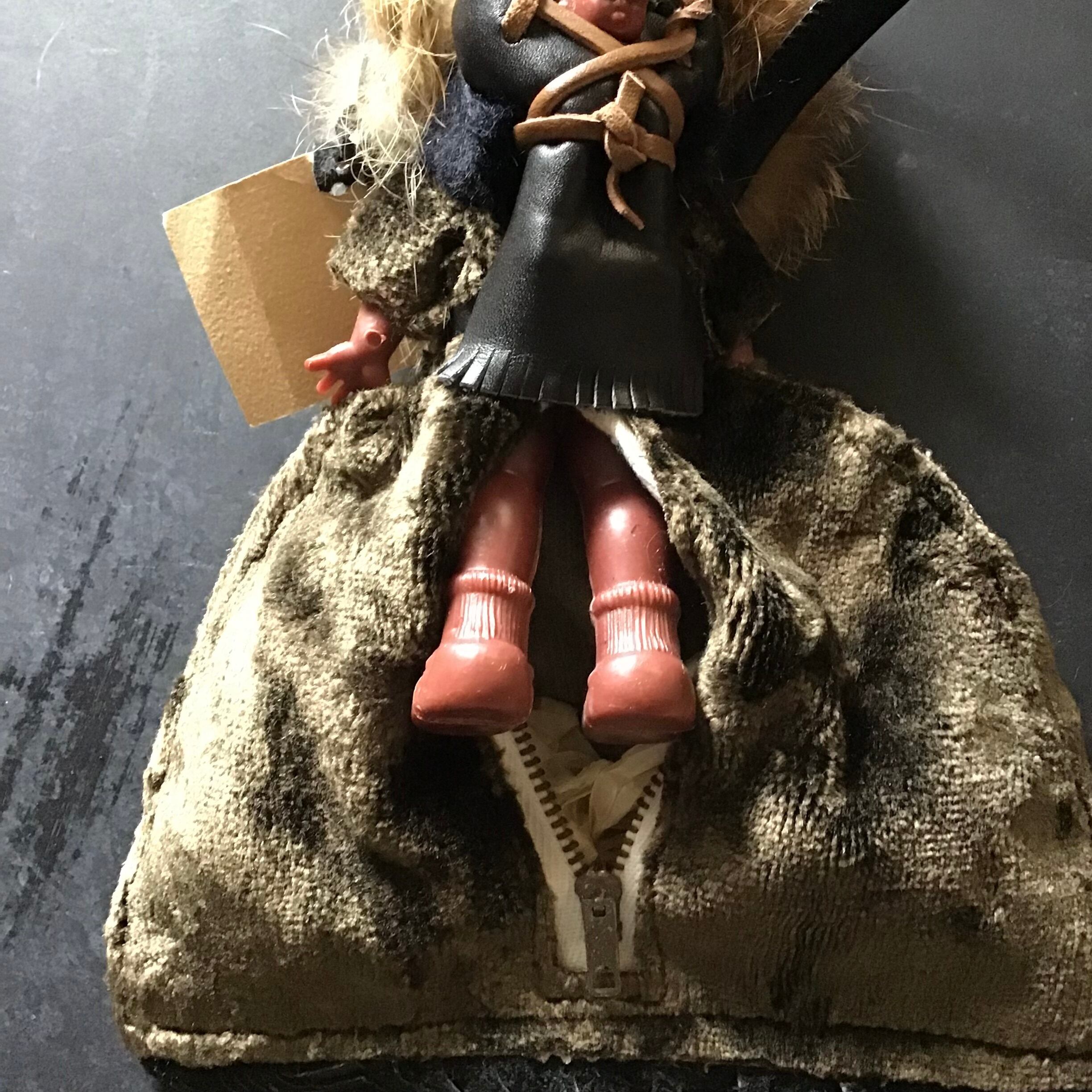1950年代のカールソン人形。一体一体ハンドメイドされおり、こちらは持ち手がついたミニバッグ仕様です◎ふわふわのリアルファーや裾のレザーフリンジ、背中の赤ちゃんなど細部まで凝った作りや、寝かせると目を閉じるのがとっても可愛いです♡小銭入れにハンカチ、ミラーとリップなどが入るサイズ感、ちょっとそこまでのお出かけに是非どうぞ
