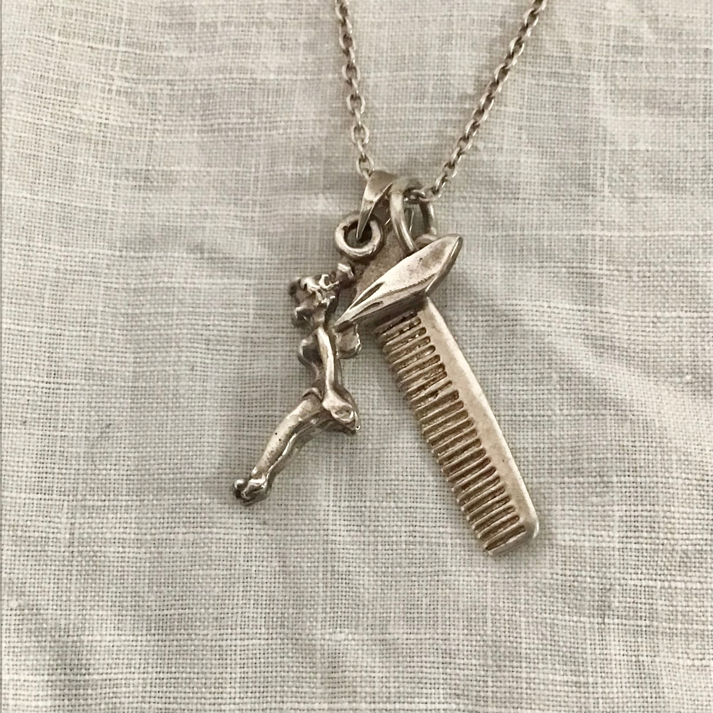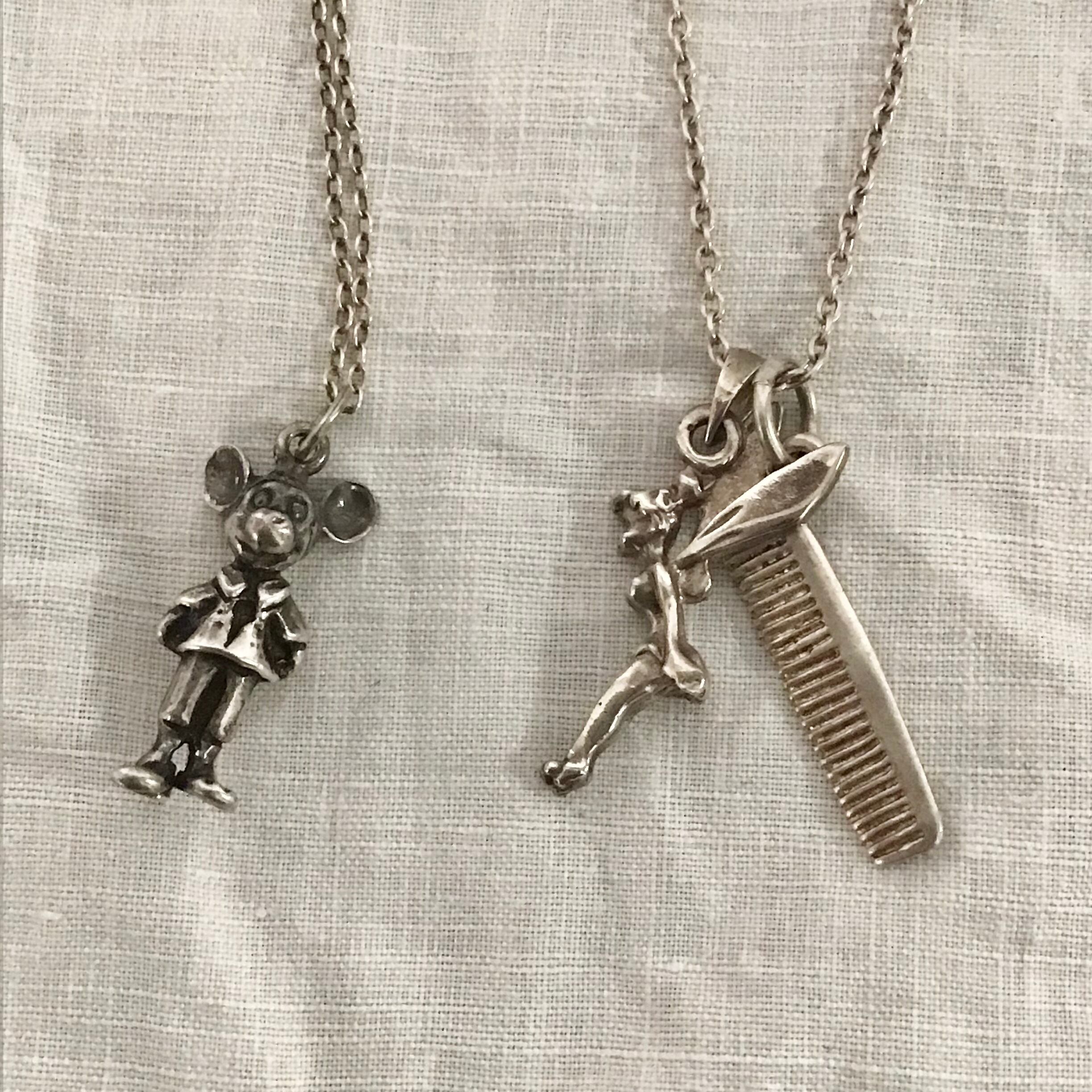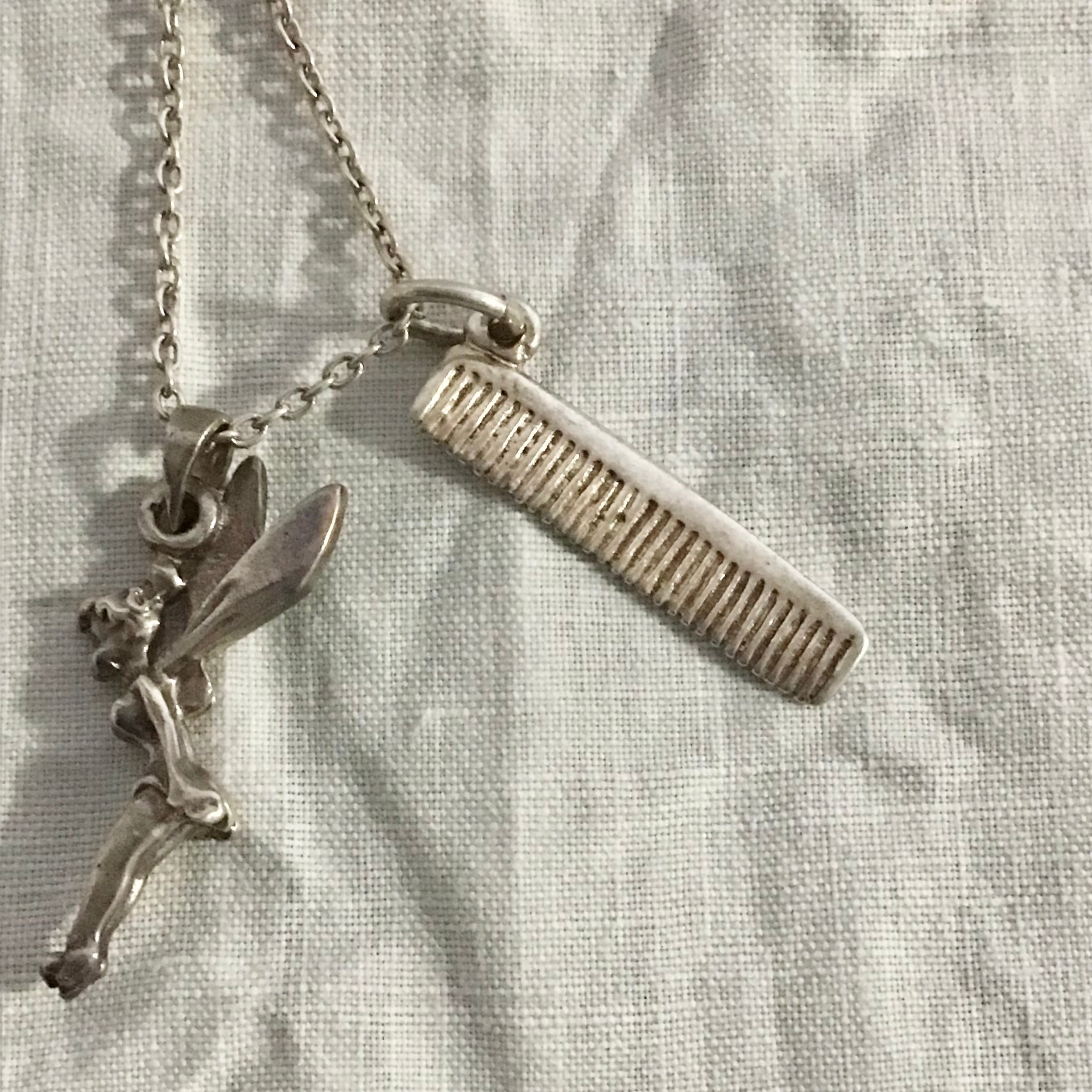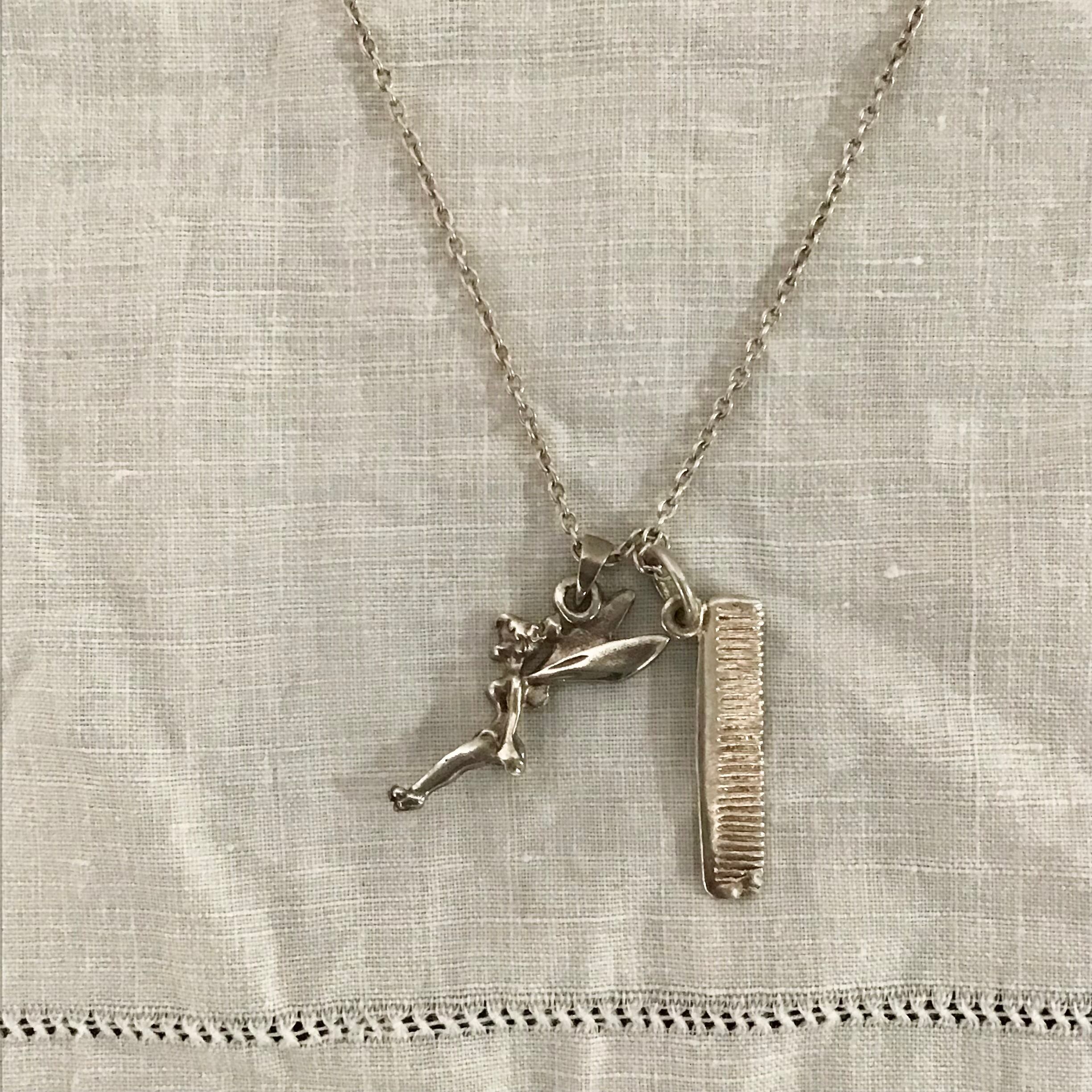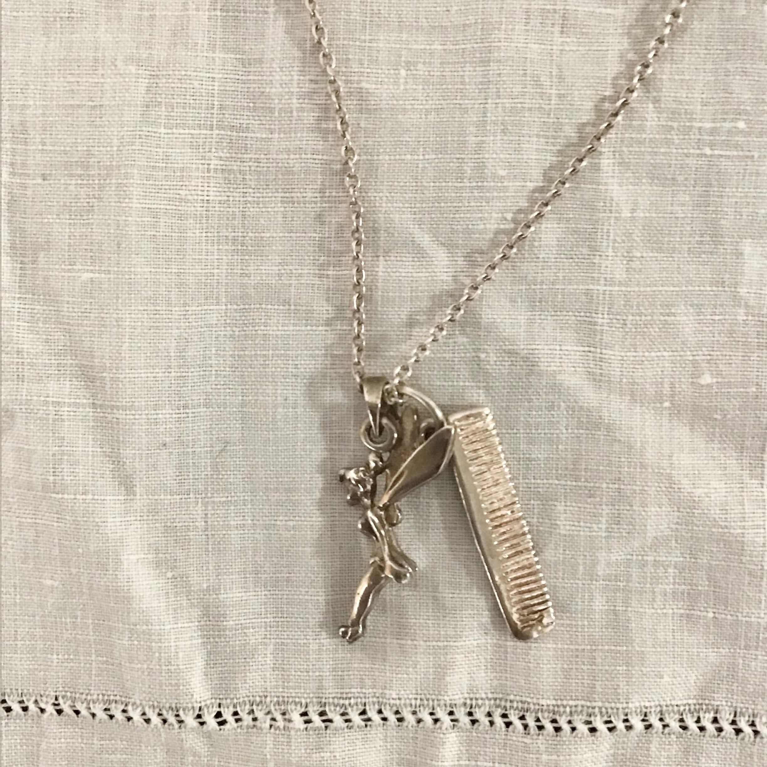 ヴィンテージネックレス、チェーンとチャーム共にシルバー925製です。小さなティンカーベルとヘアコームモチーフのチャームを合わせてみました♡短めなので長さ違いでの重ねつけも可愛いと思います◎ギフトにもおすすめです!