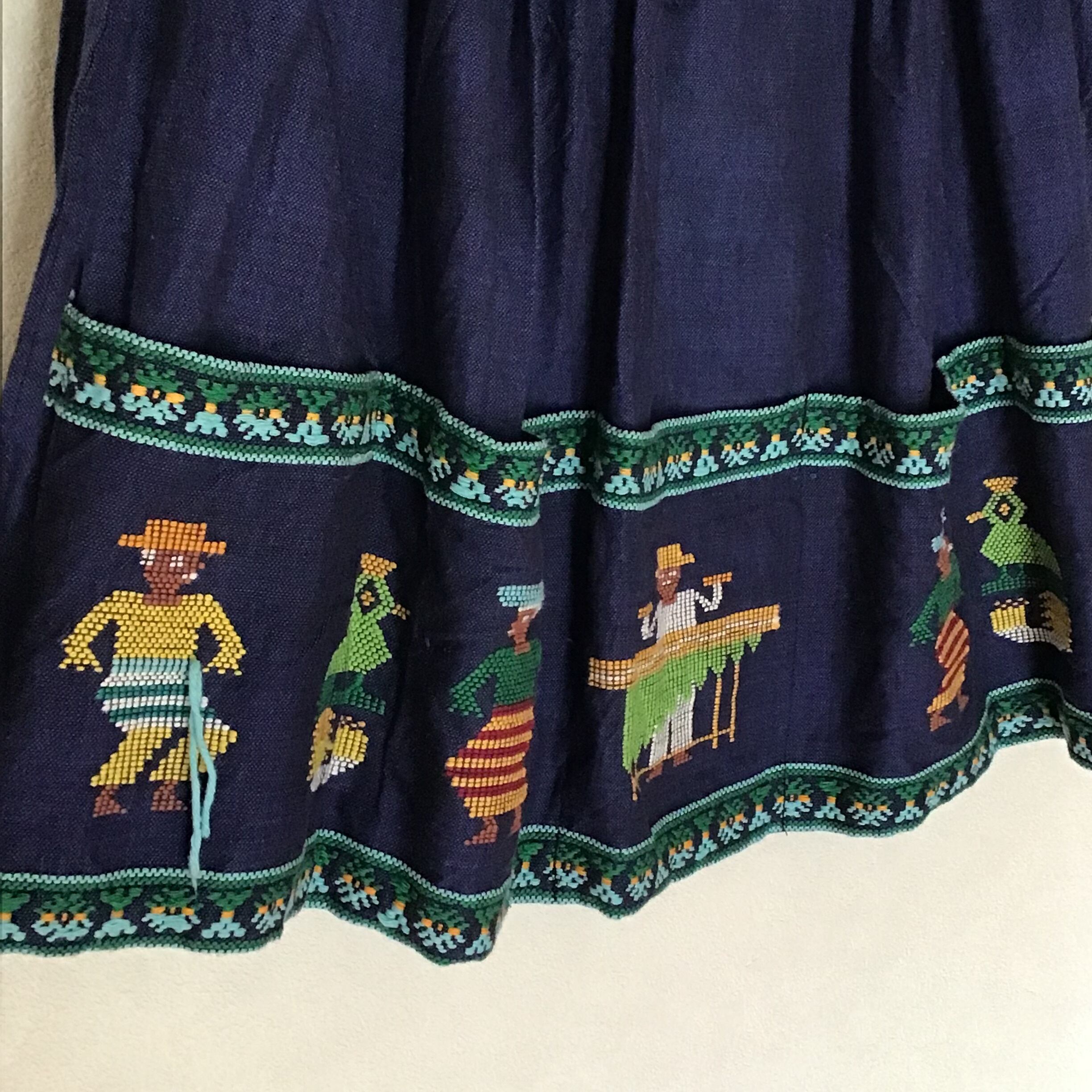 ガテマラの刺繍エプロン、ユニークなモチーフの刺繍部分が区切られ全てポケットになっています。ボリュームのあるスカートやデニムに重ねたり、ベアトップの様に使ったり、ヴィンテージのエプロンは使い方もいろいろ、種類もたくさんでコレクションするのも楽しいアイテムです♡夏はTシャツに合わせたいです◎