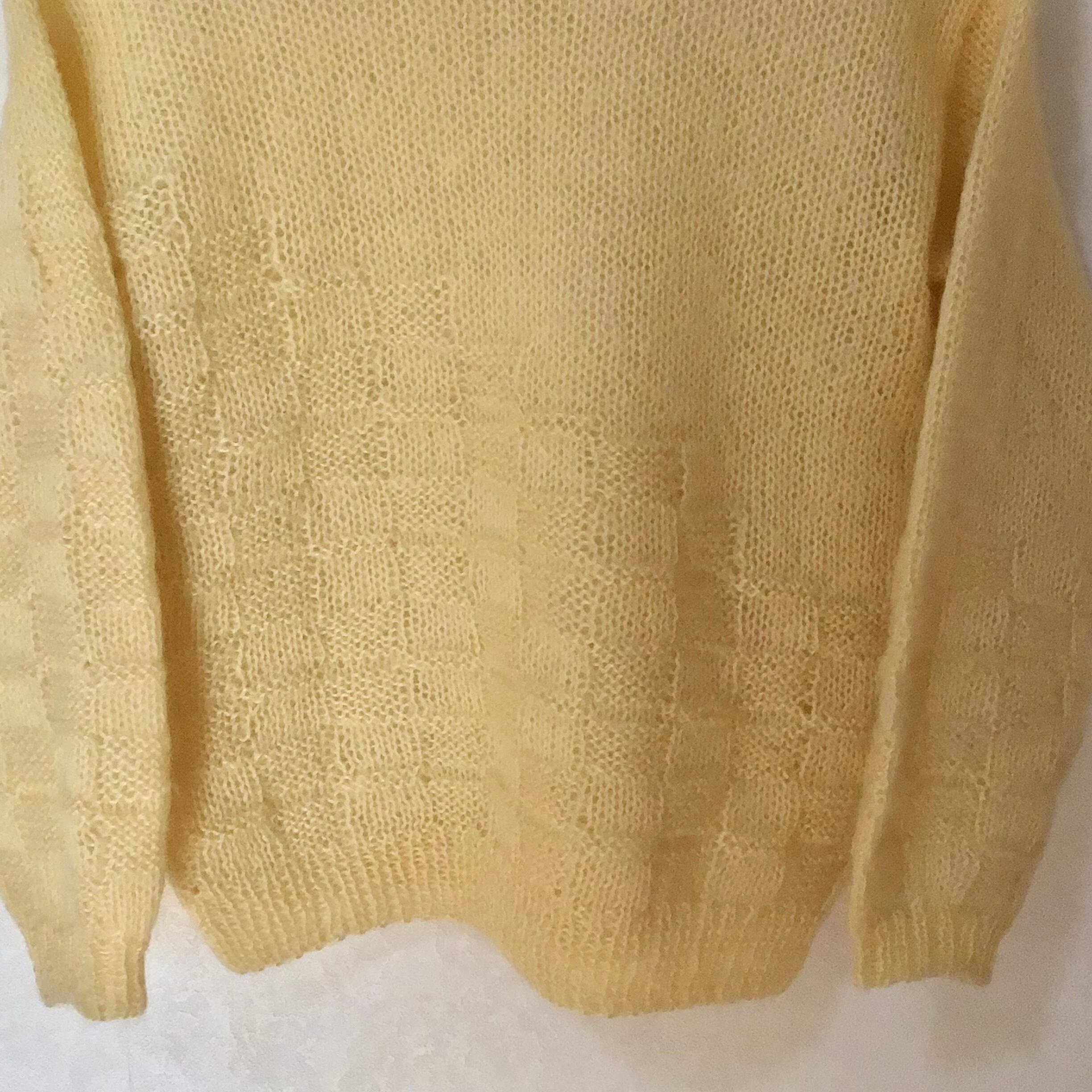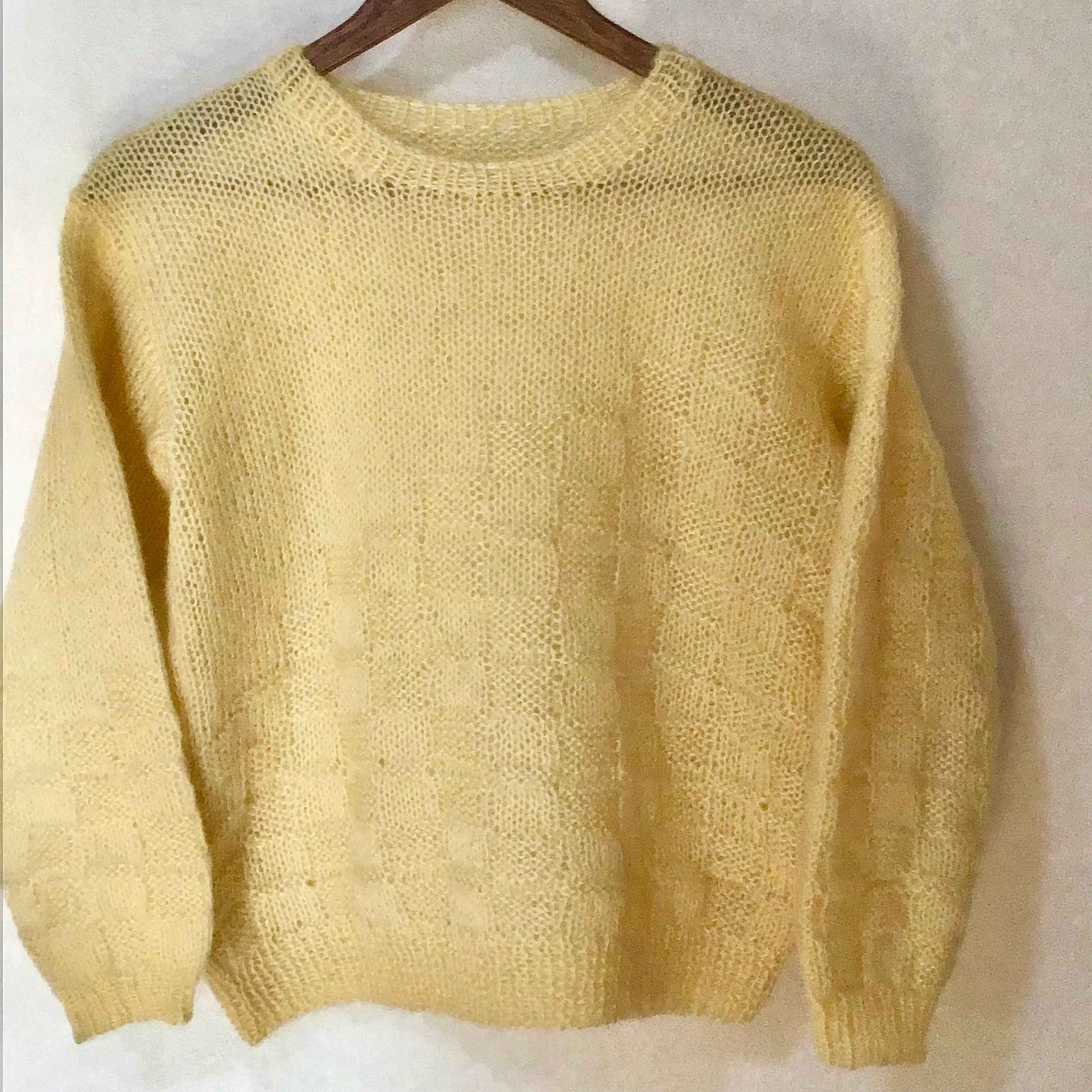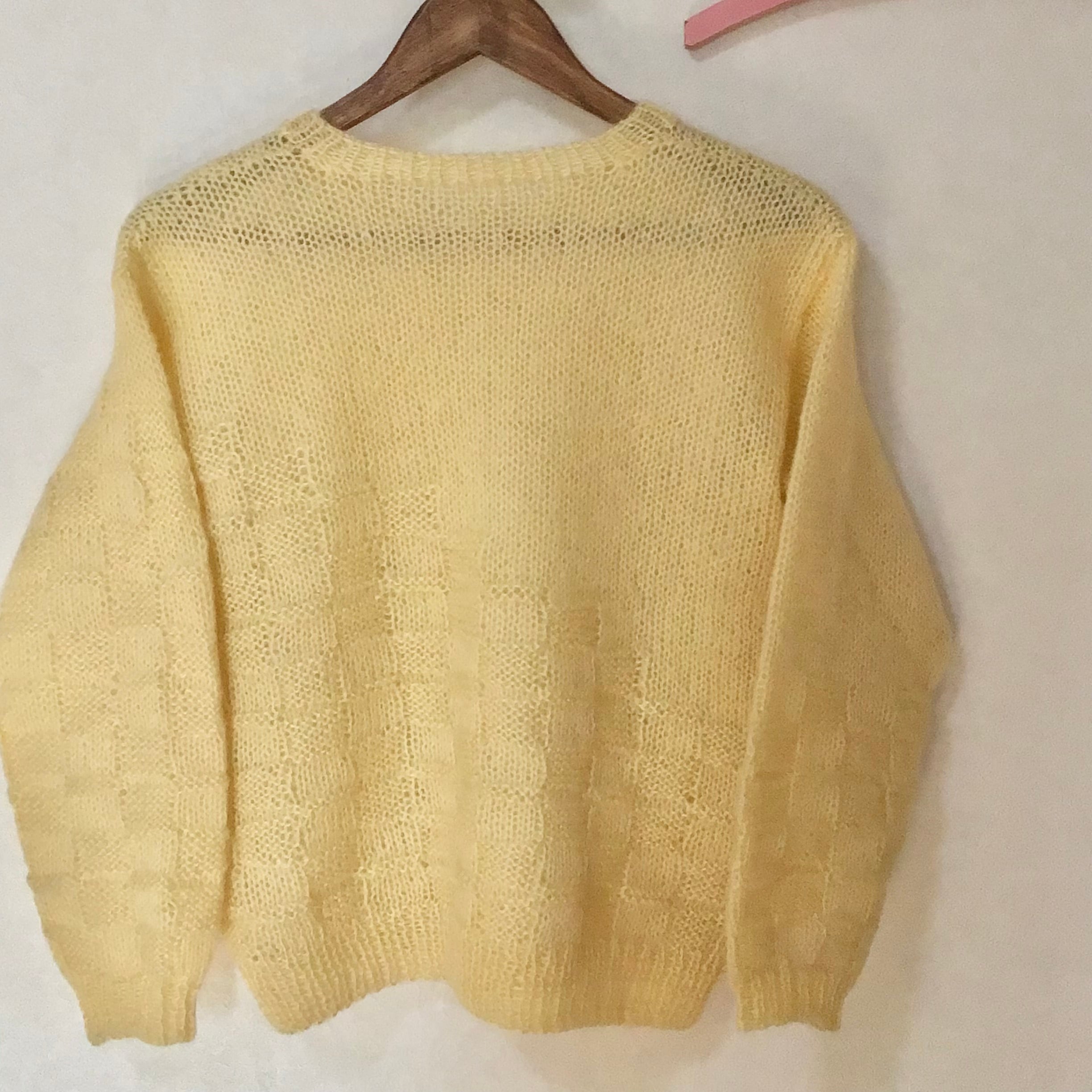 ハンドメイドのモヘアニット。ひよこの様なクリーミーイエローが可愛いらしく、さりげなく入った格子の編み模様も良い雰囲気です♡とっても軽いニットで着心地も良く、春先まで着ていただけそうです!