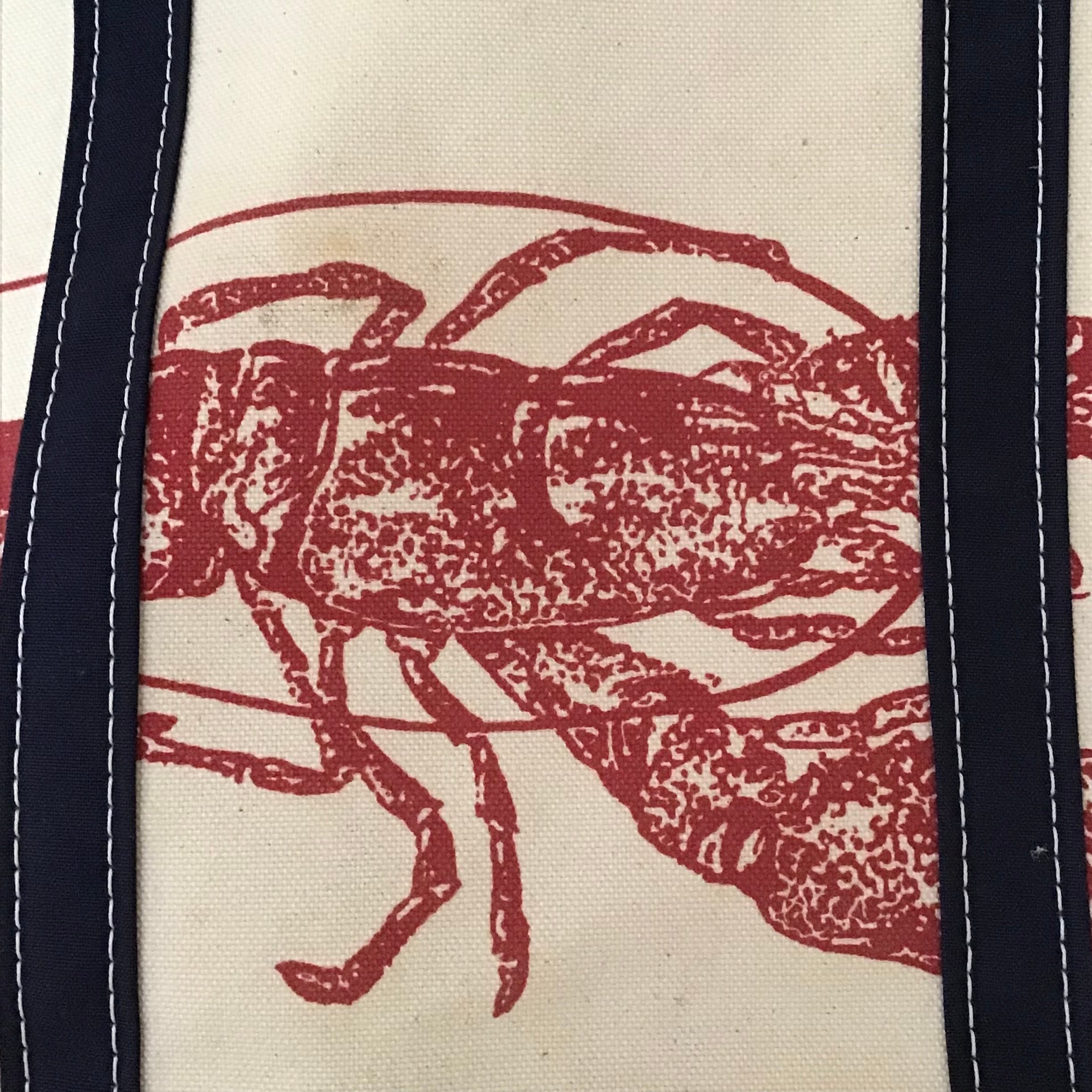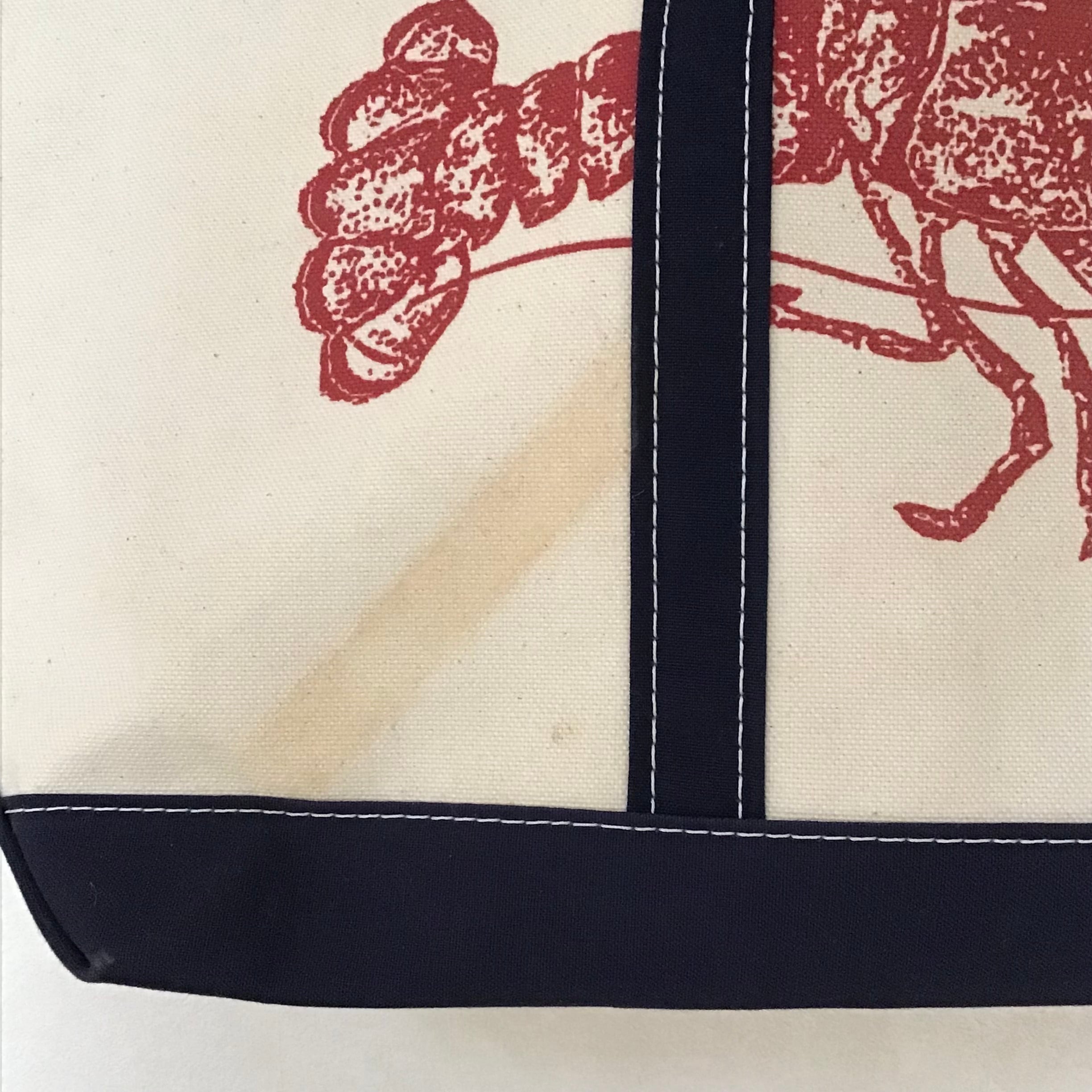 2000年代のLL Beanボート&トート、ラージサイズ、インパクトのあるロブスター柄がとても良い雰囲気です♡ほぼ使われては無いようですが、経年の汚れがあります。お好みでオリジナル感のあるカスタムでお楽しみください!こちらは半分に折って発送させて頂きます。恐れ入りますがご了承ください。