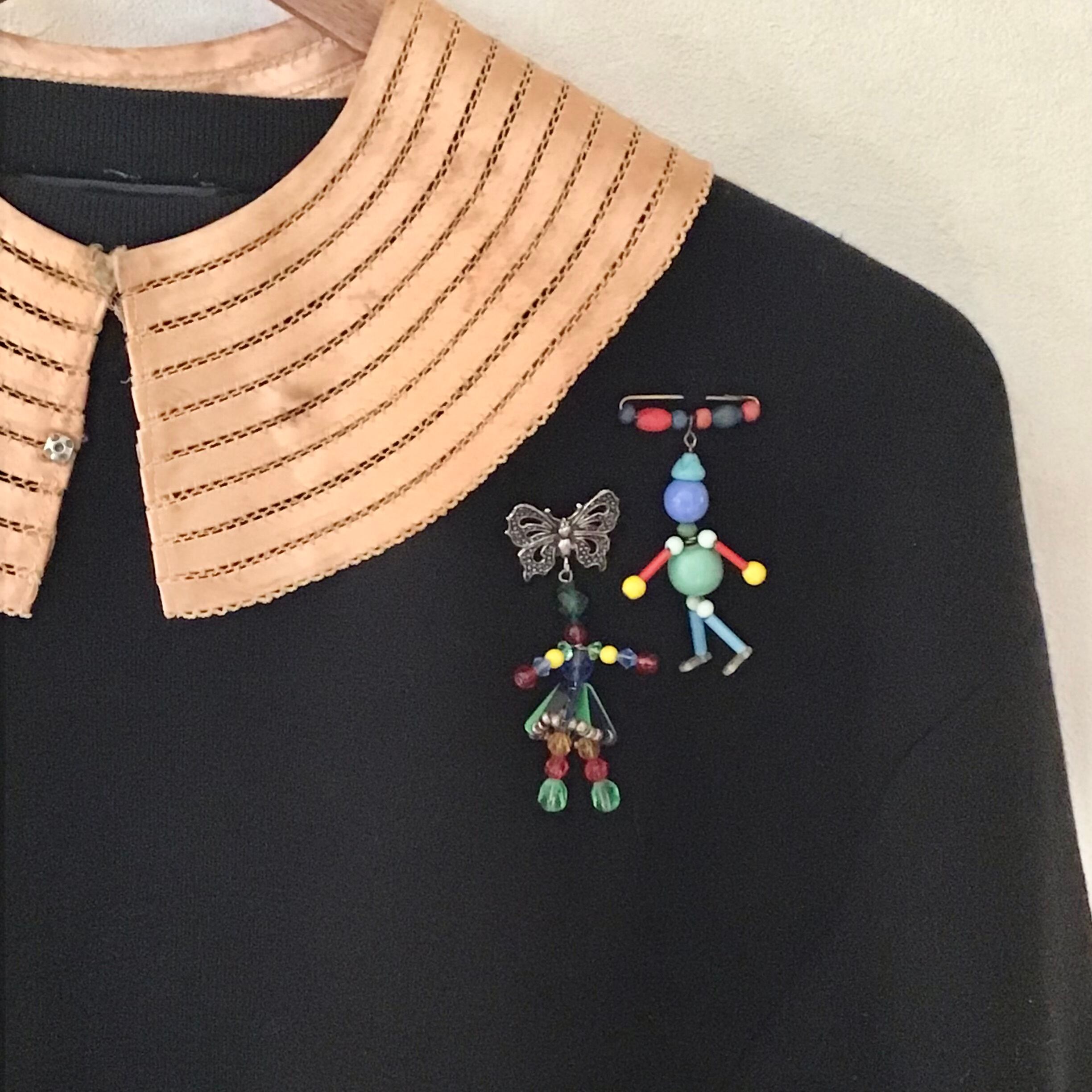 1950年代のプラスチックビーズブローチ、立体感のあるスカートがユニークなデザインです♡程よいサイズ感でぷらぷらと揺れるものポイント!クリアなビーズが白ニットに合わせるととっても可愛いです◎