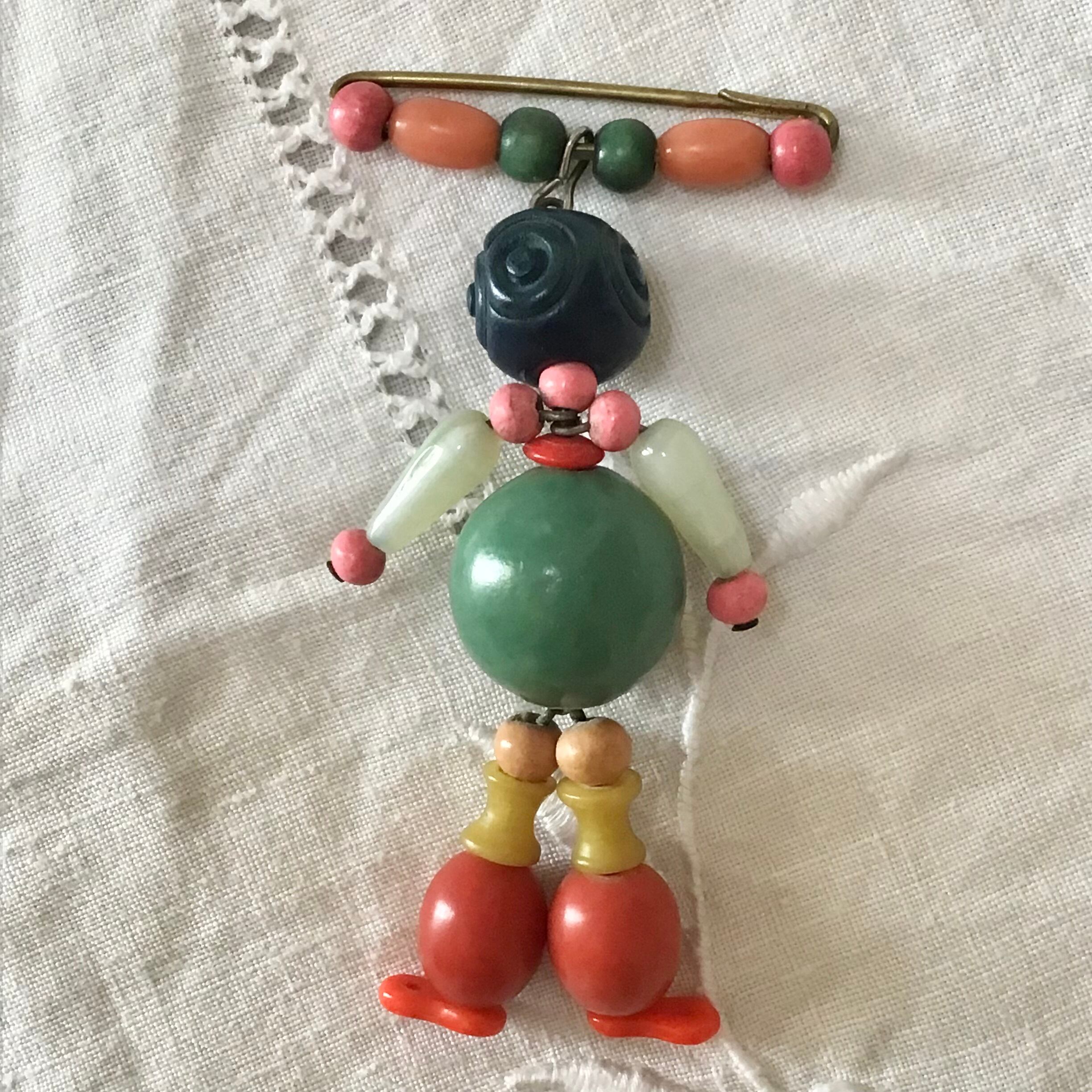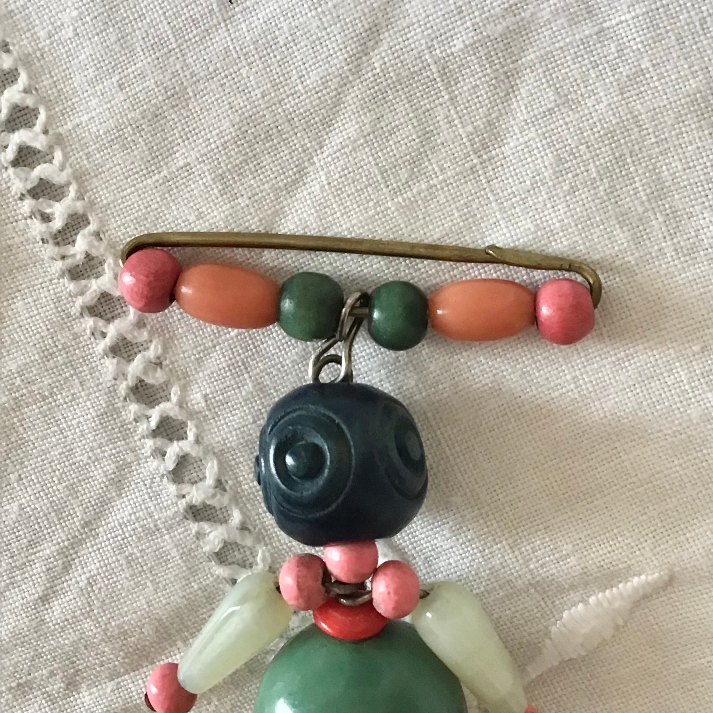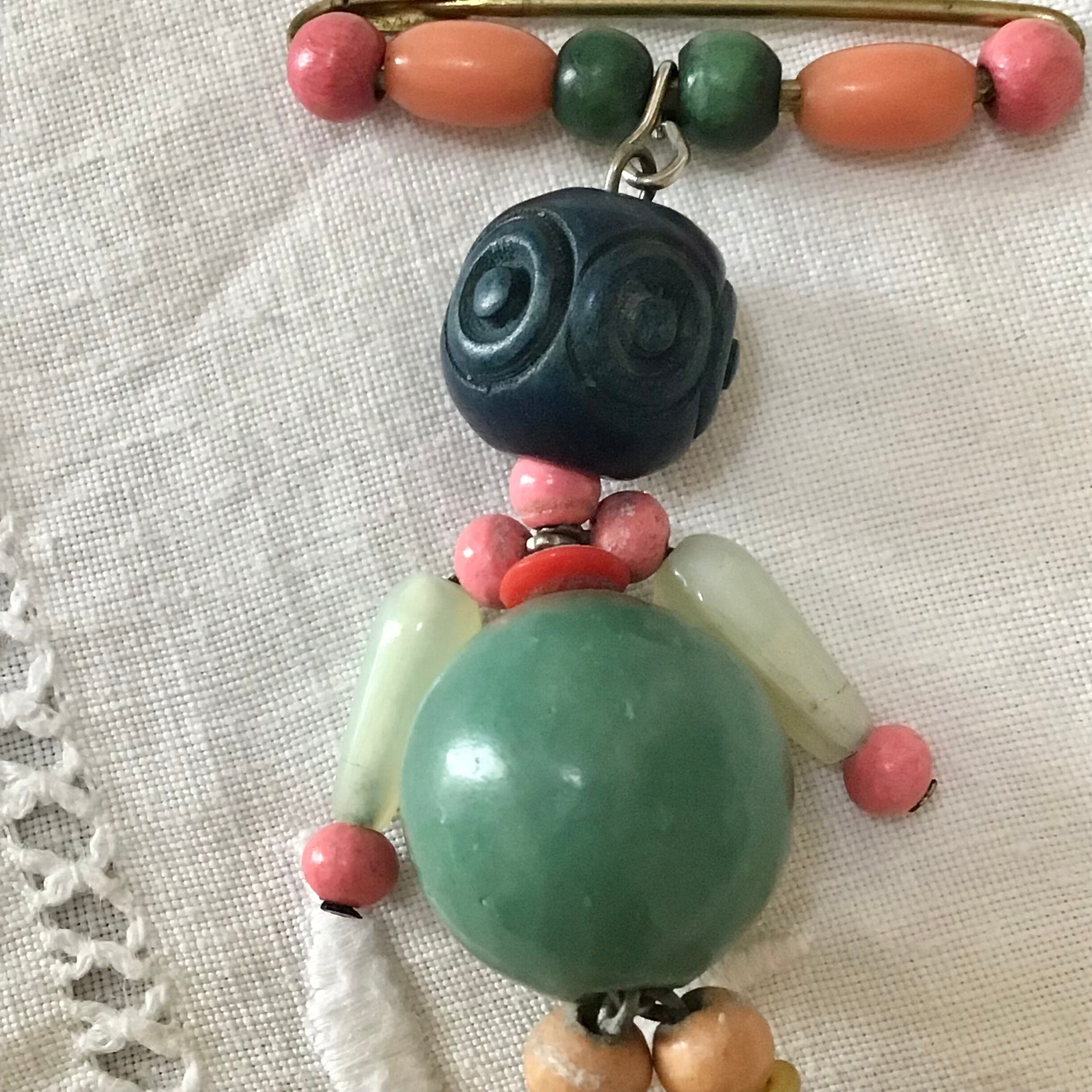 1950年代のブローチ、ウッドビーズやプラスチックを使ったカラフルな人型が可愛いです♡グリーンとピンク系のカラーリングも良く、ぷっくりとした丸いビーズがポイントになっています◎重ねつけもしやすいサイズ感で、お手持ちのブローチとのコーディネートも楽しんで頂けます!