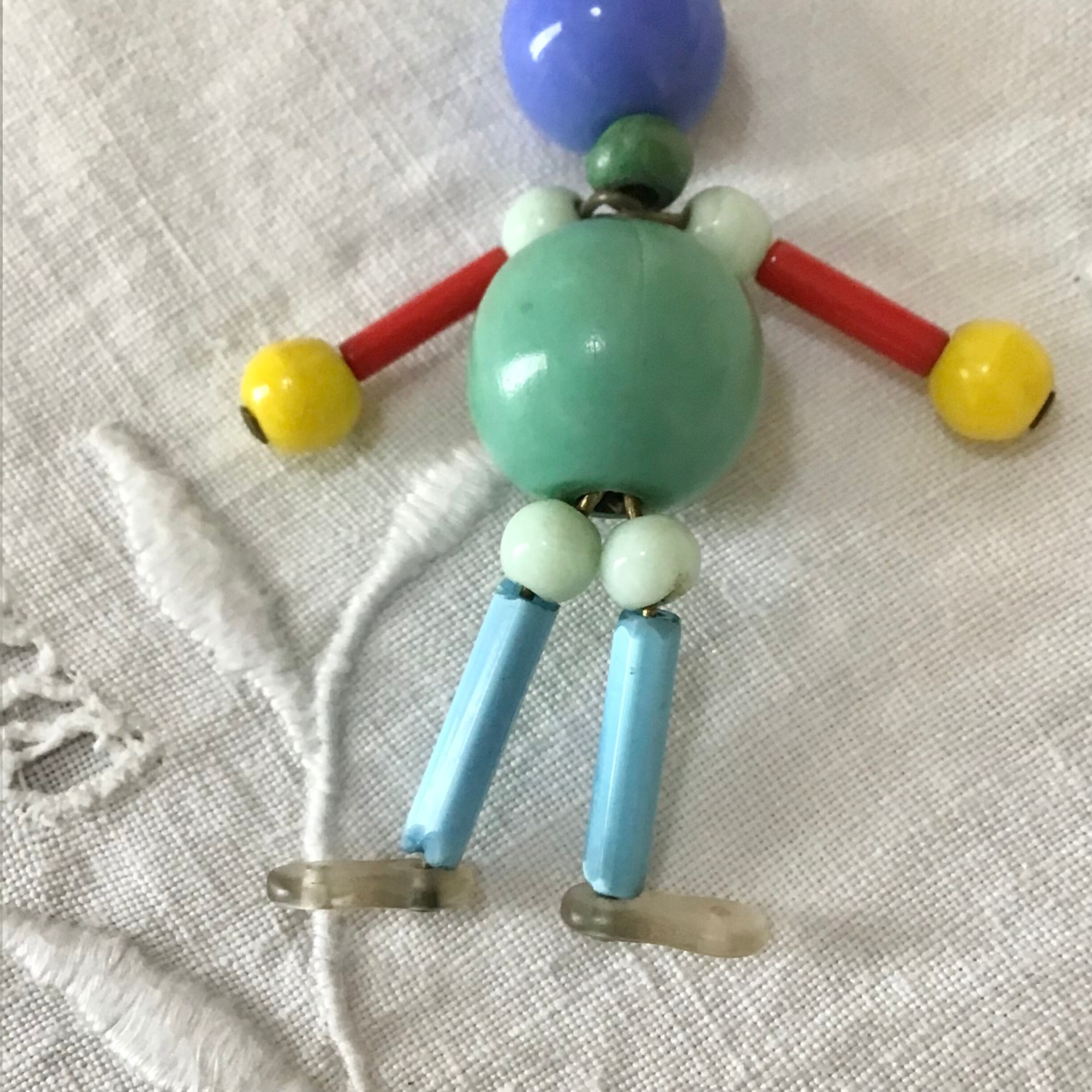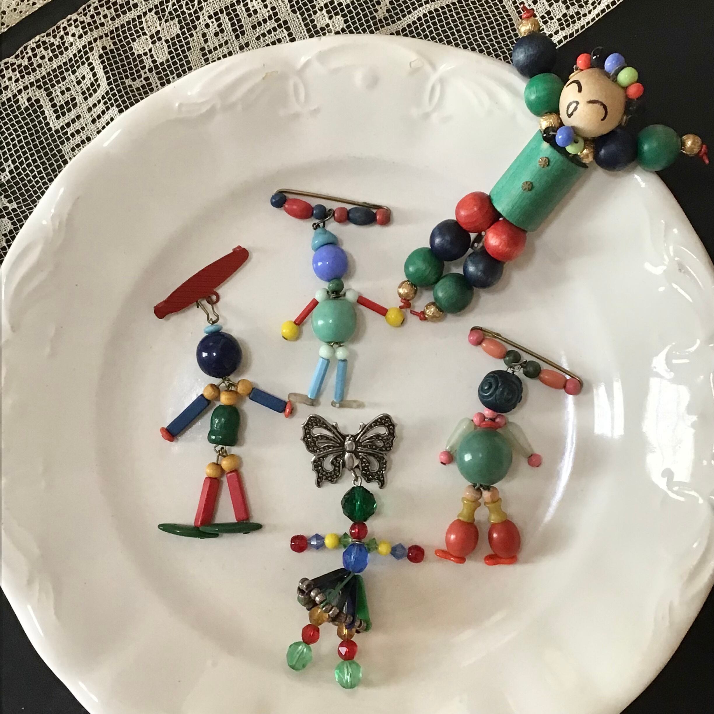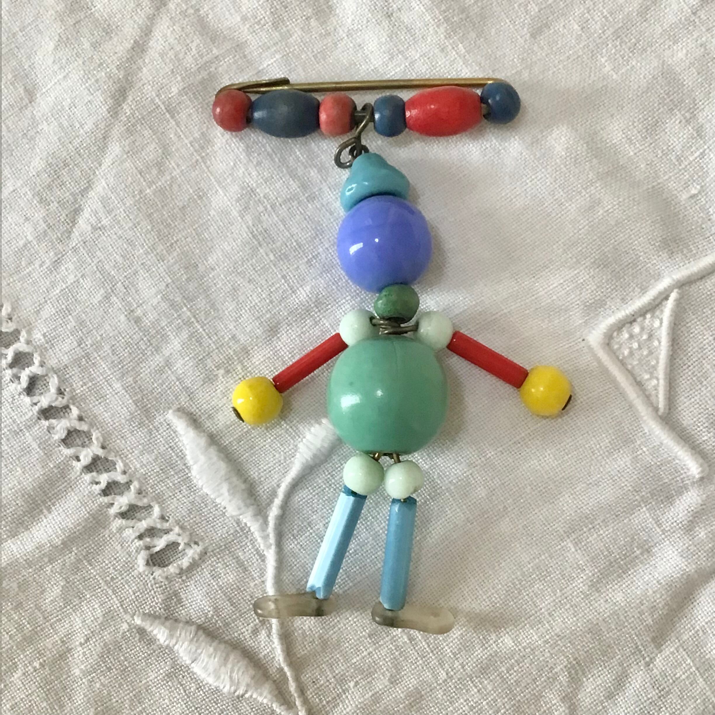 1950年代のブローチ、ウッドビーズやプラスチックを使ったカラフルな人型が可愛いです♡ペールトーンのブルーに赤や黄色がポイントになった良いカラーリングです◎重ねつけもしやすいサイズ感で、お手持ちのブローチとのコーディネートも楽しんで頂けます!