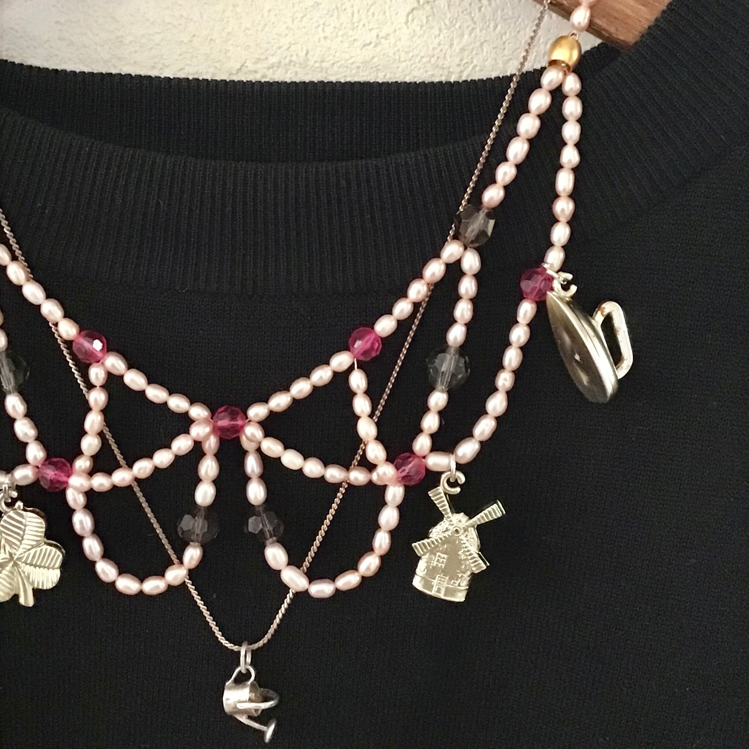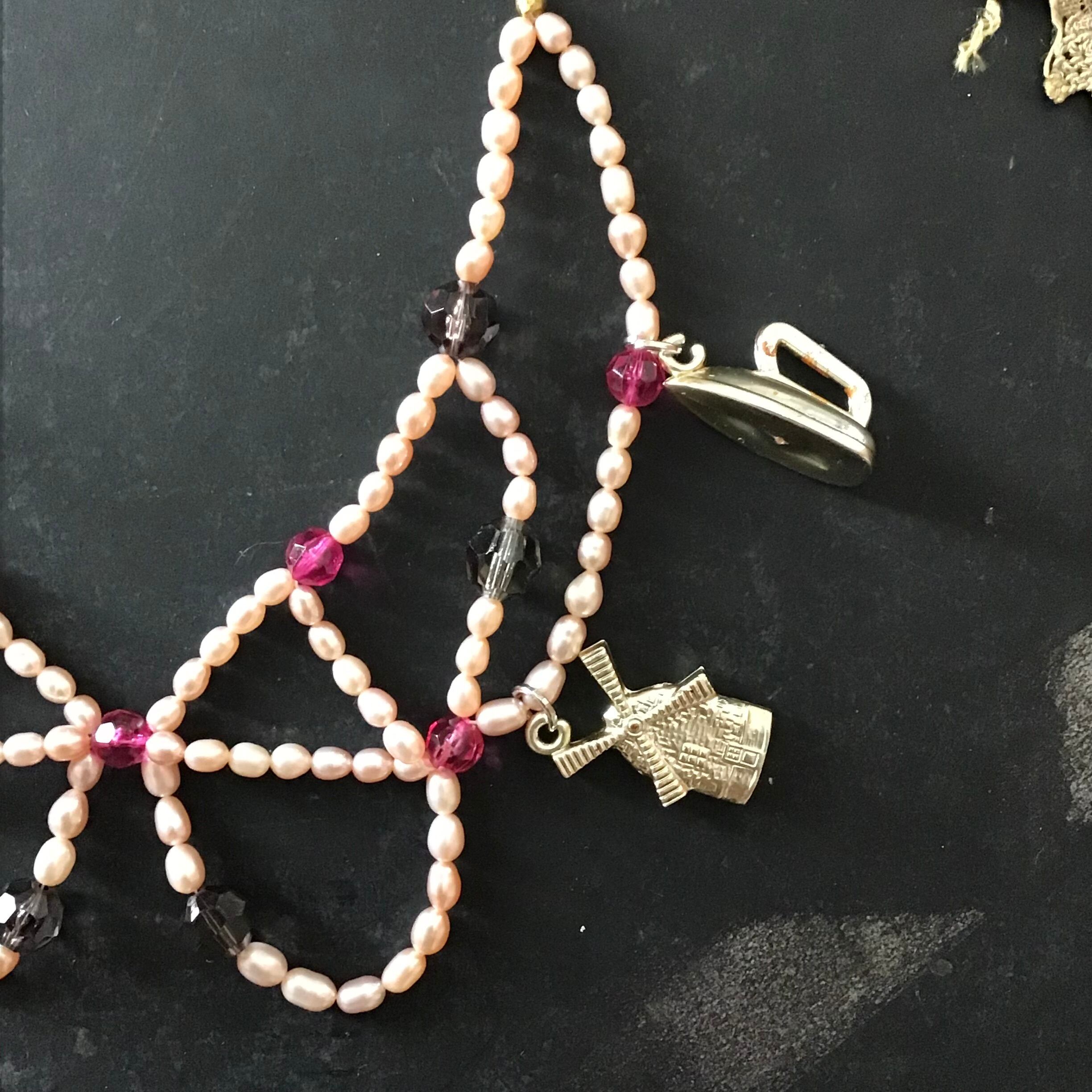 1960年代のプラスチックチャームがついたパールネックレス。ほんのりピンクがかった小粒のパールとクリアピンクのプラスチックビーズの組み合わせが可愛い、付け襟の様な雰囲気もあるデザイン♡ユニークなチャームがヴィンテージらしい良い雰囲気です◎Tシャツからニットまで幅広くコーディネートして頂けそうです!