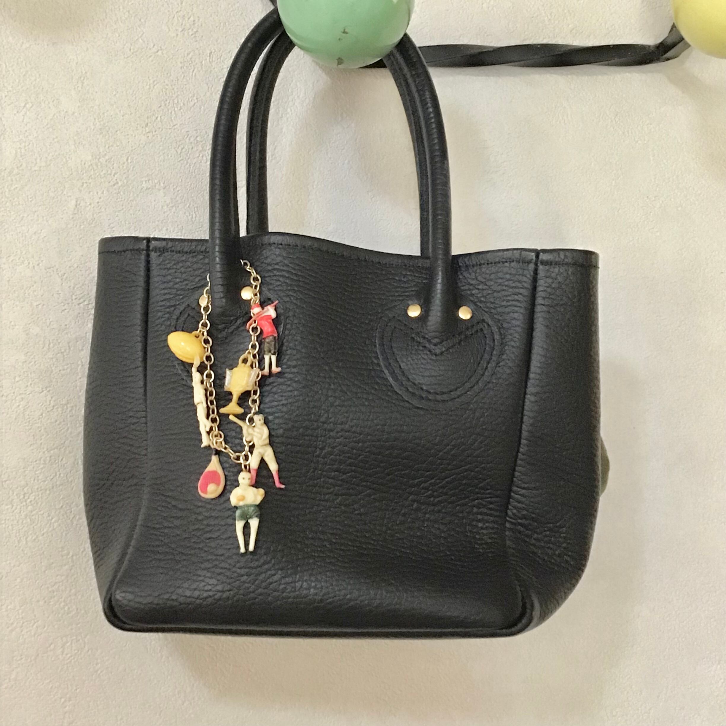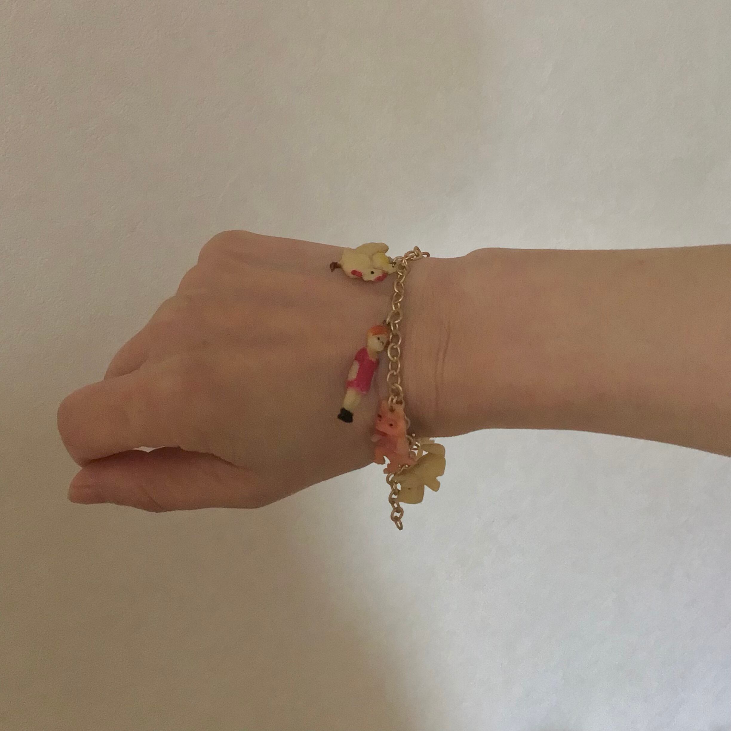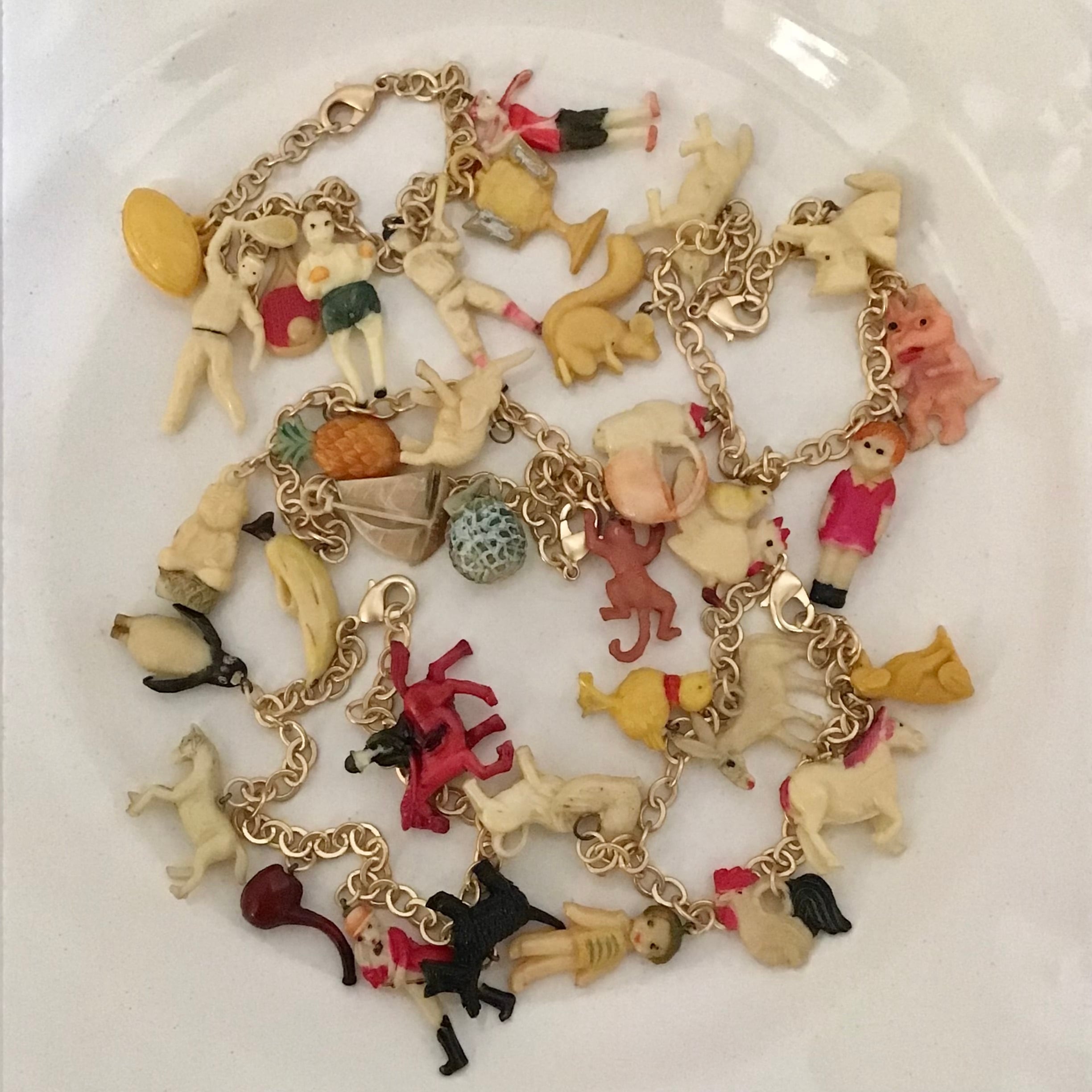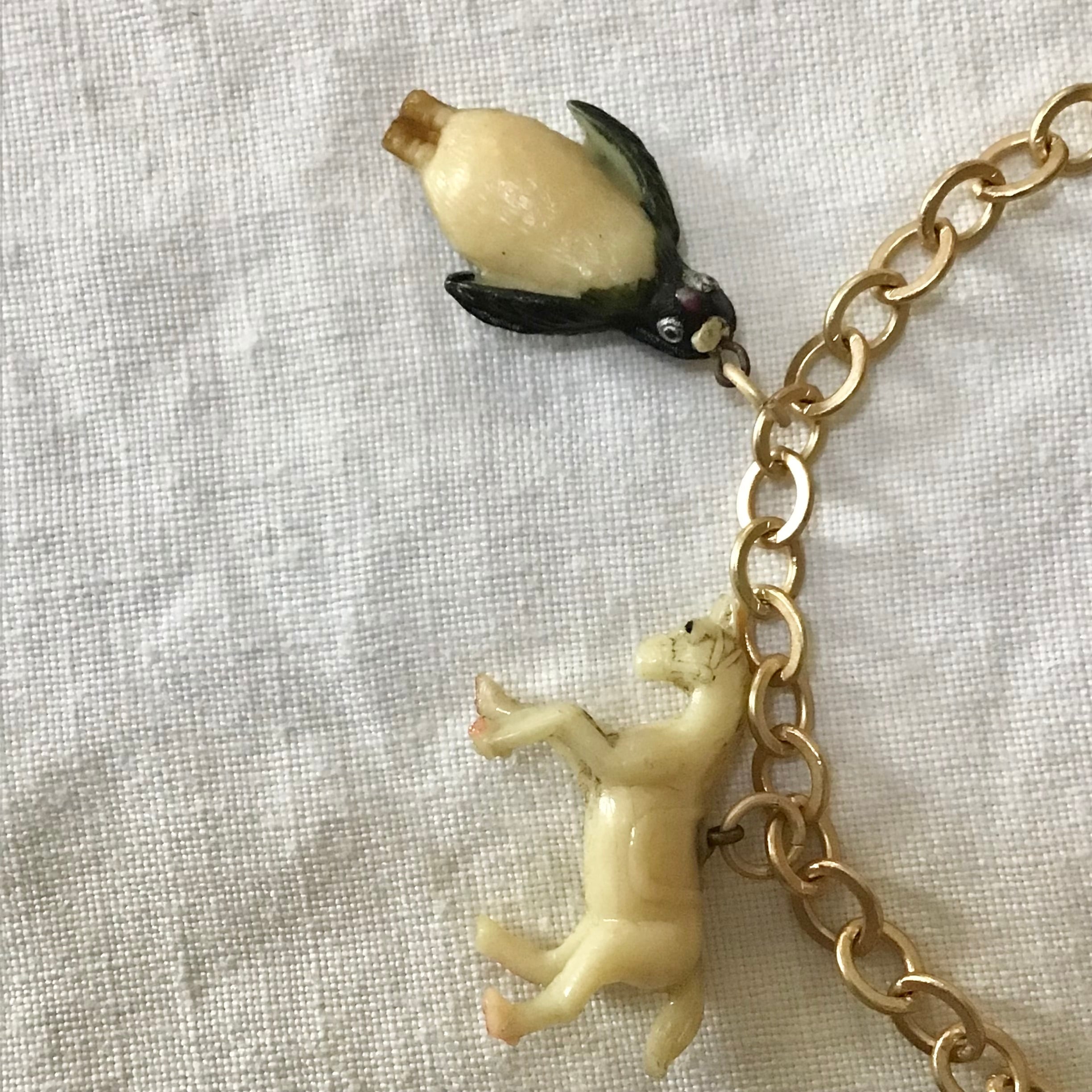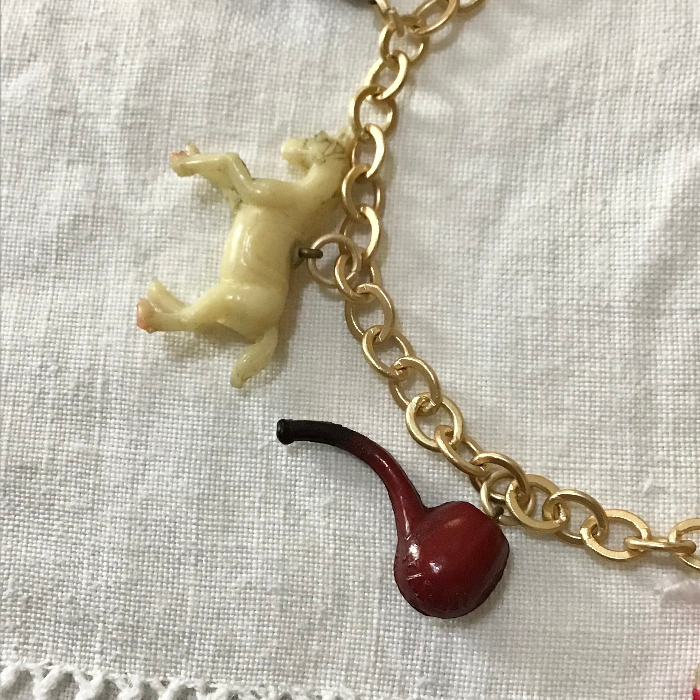 1940〜50年代、クラッカージャックのセルロイド製おまけチャームを付けたブレスレットです。チェーンはメッキ、お好みの長さで留めて頂けます。それぞれにユニークなチャームが7点付いたとても素敵なお品です♡ブレスレットとしてはもちろん、バッグにつけたり、ネックレスにアレンジしたり、楽しんでお使いください!