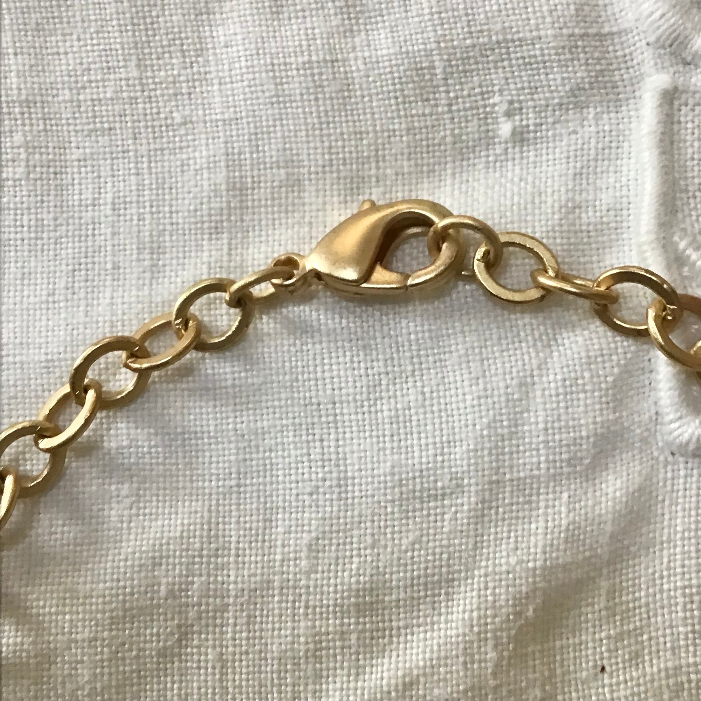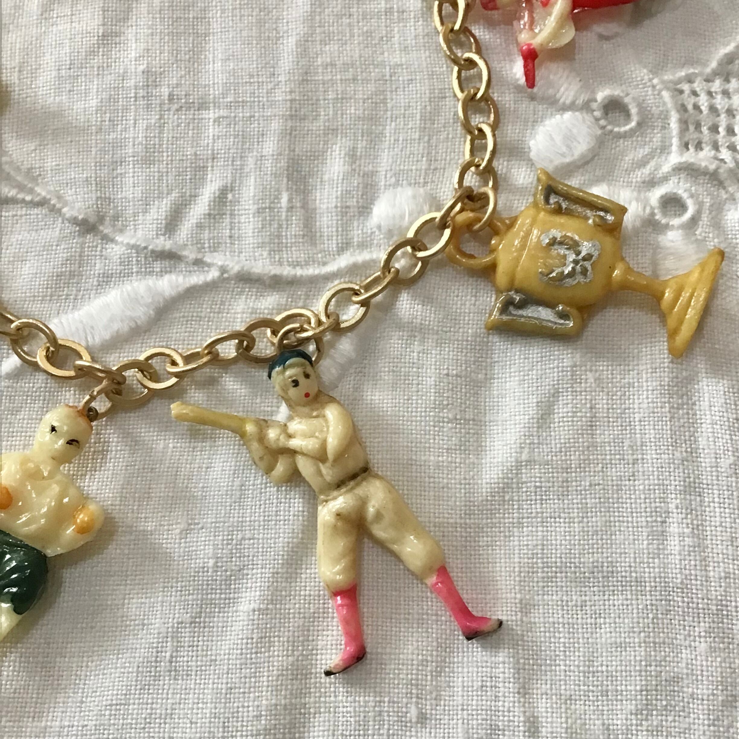 1940〜50年代、クラッカージャックのセルロイド製おまけチャームを付けたブレスレットです。チェーンはメッキ、お好みの長さで留めて頂けます。それぞれにユニークなチャームが7点付いたとても素敵なお品です♡ブレスレットとしてはもちろん、バッグにつけたり、ネックレスにアレンジしたり、楽しんでお使いください!
