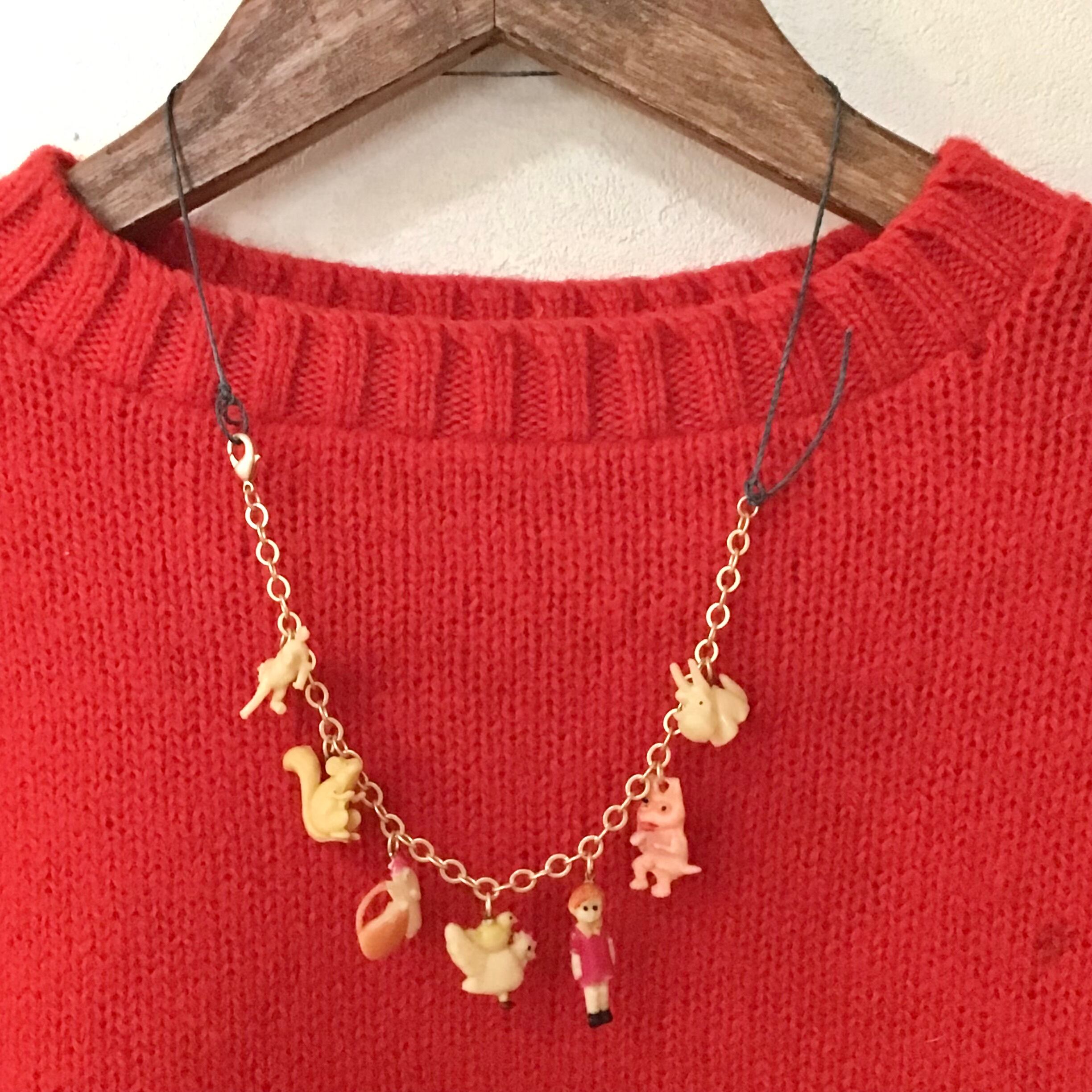 1940〜50年代、クラッカージャックのセルロイド製おまけチャームを付けたブレスレットです。チェーンはメッキ、お好みの長さで留めて頂けます。それぞれにユニークなチャームが7点付いたとても素敵なお品です♡ブレスレットとしてはもちろん、バッグにつけたり、ネックレスにアレンジしたり、楽しんでお使いください!
