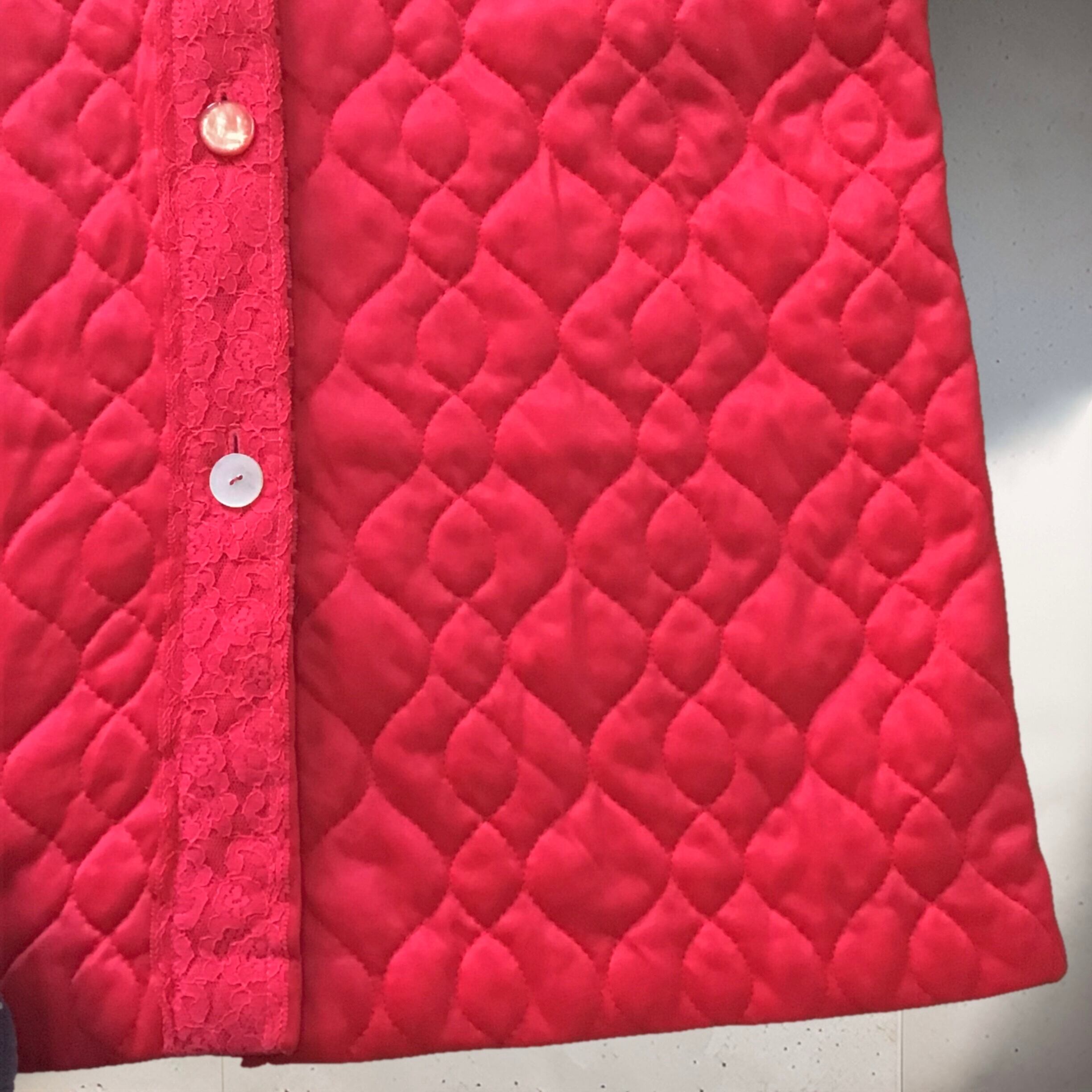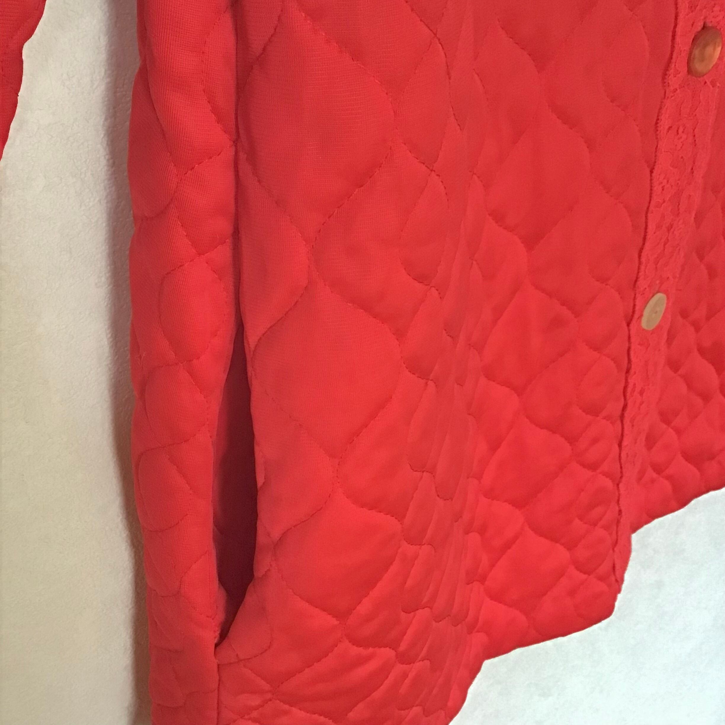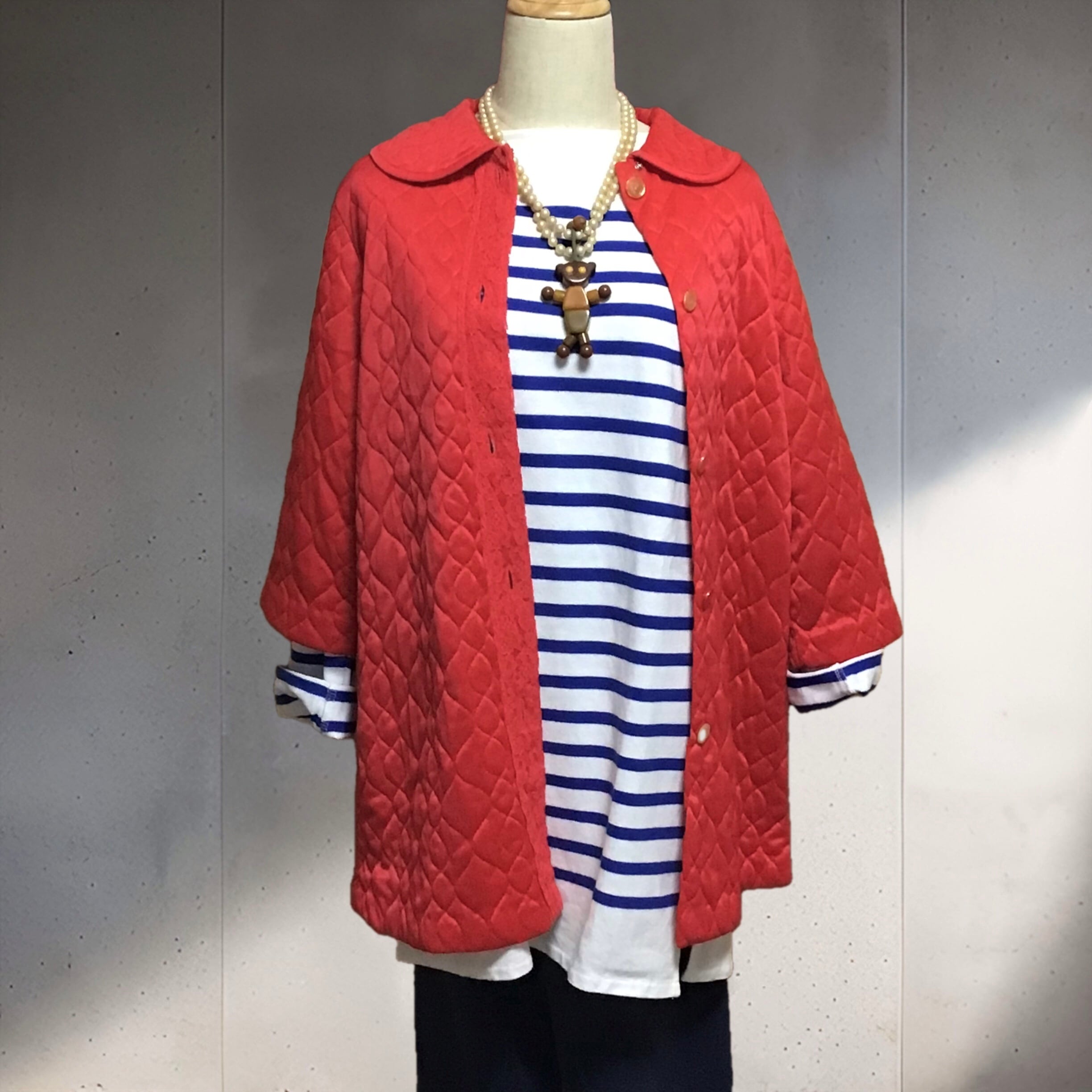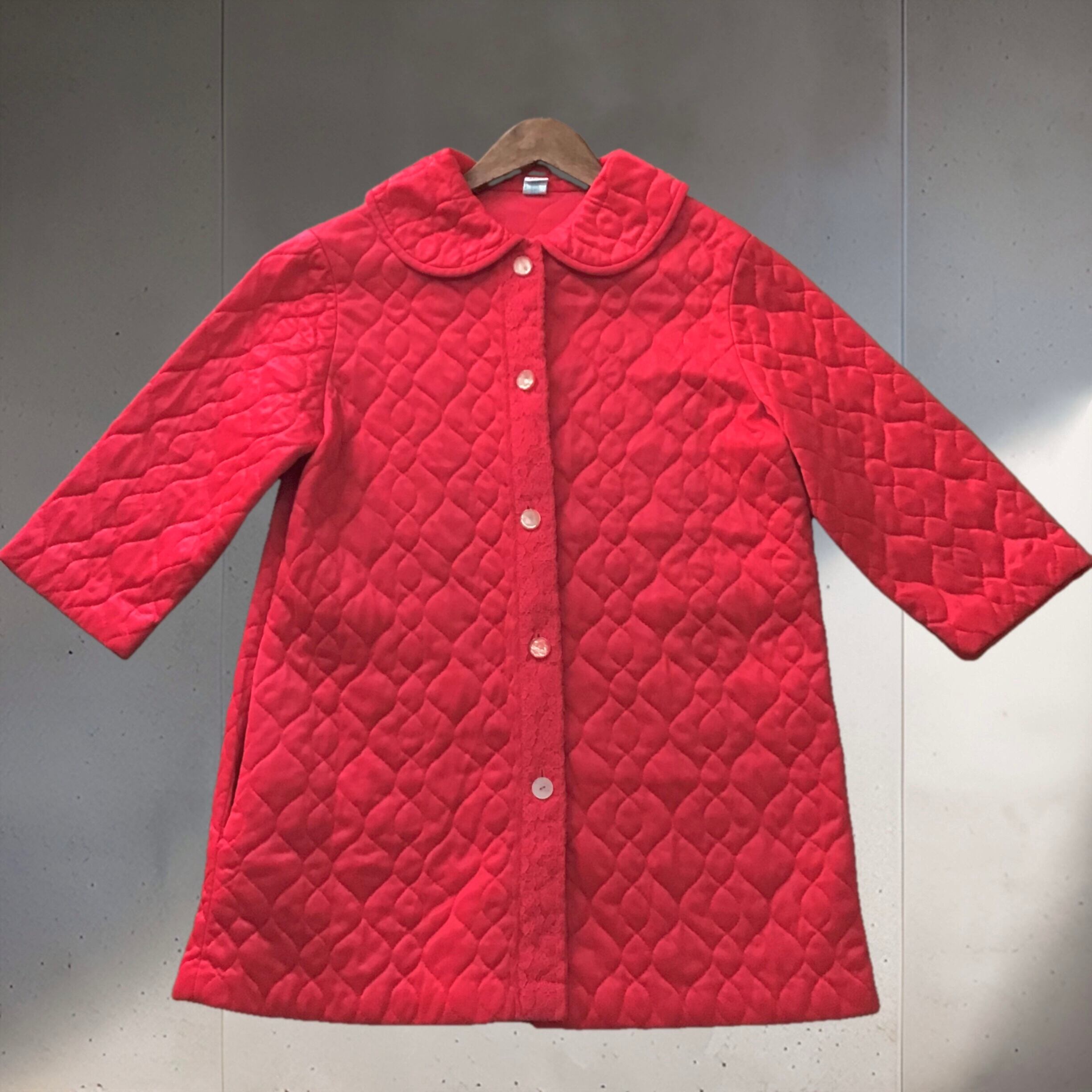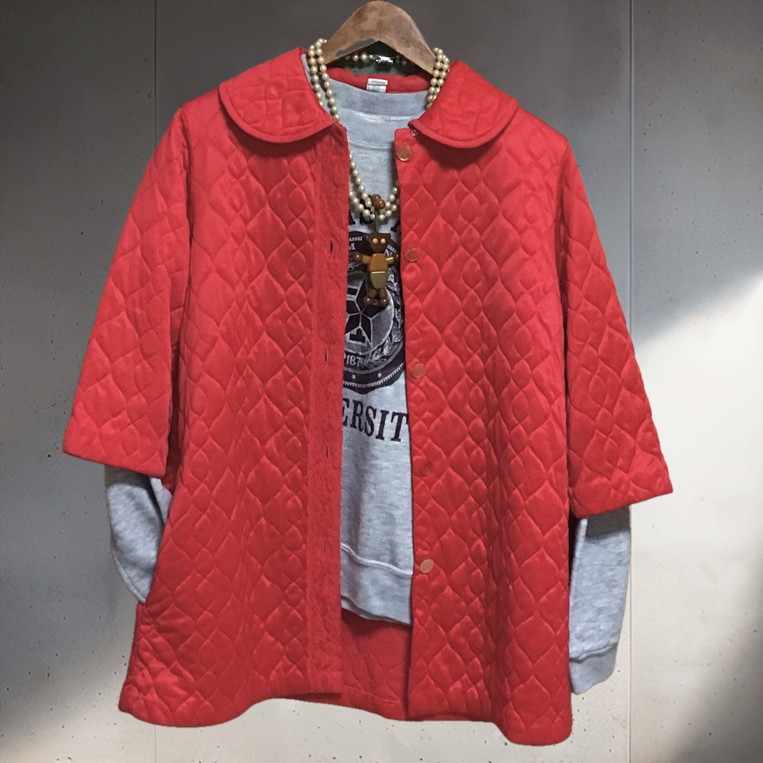 1970年代、JC Pennyのベッドジャケット。発色の良い赤のキルティングに丸襟と少し短めの袖のバランスも良く、前立てのレースも可愛いです♡軽めの素材なので上からざっくりとしたニットを羽織ったり、インにもアウトにも様々なコーディネートで3シーズン楽しんで頂けます◎右サイドにポケットあり。