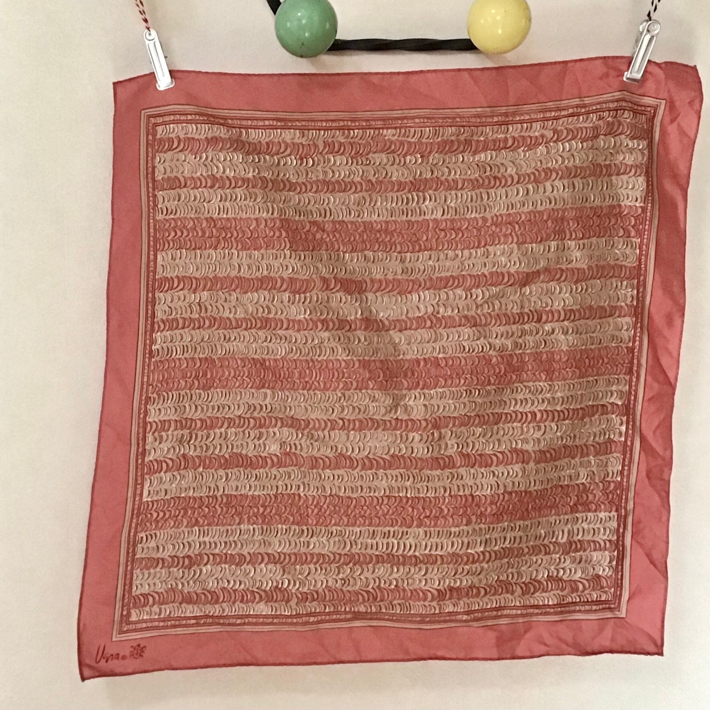 ベラのピンクベージュスカーフ、こちらはポリエステルです。手描きでデザインされた様な柄やピンクベージュが肌馴染みもよく、使い勝手が良さそうです♡頭や首、バッグなどお好みの場所に巻いてお楽しみください◎