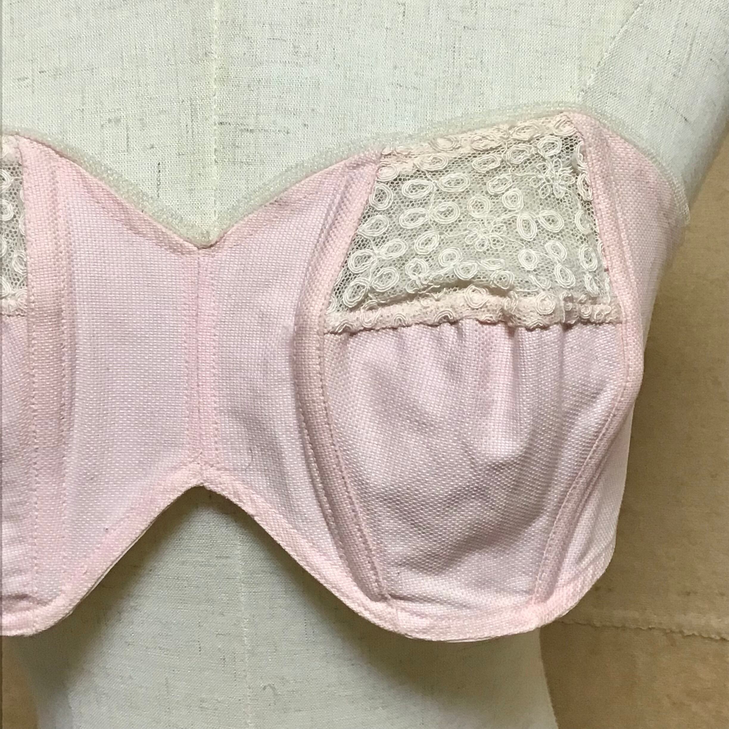 1940年代のコットンブラレット、肩紐がないビスチェタイプです◎アンダーバストは3段階のホックとゴムで、ニットやスウェットなど厚みのある物も合わせて頂けます♡優しいピンクとレースのコンビが可愛いらしいおすすめのお品です!