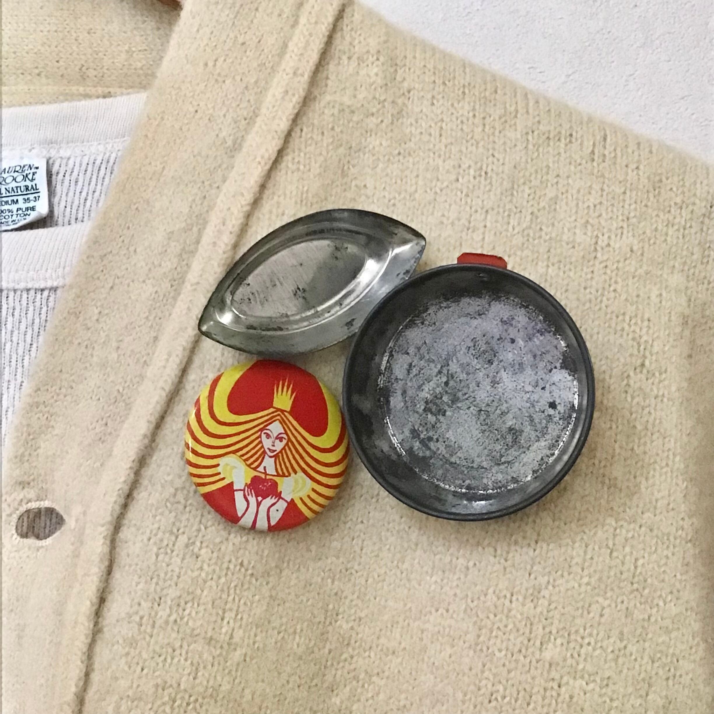 古いドールハウス用パーツ、ブリキのタライやボウルをブローチにしてみました。つけると立体感があり面白いです!小さい物好きの店主はとってお気に入り♡バッグやコートにも良さそうです◎