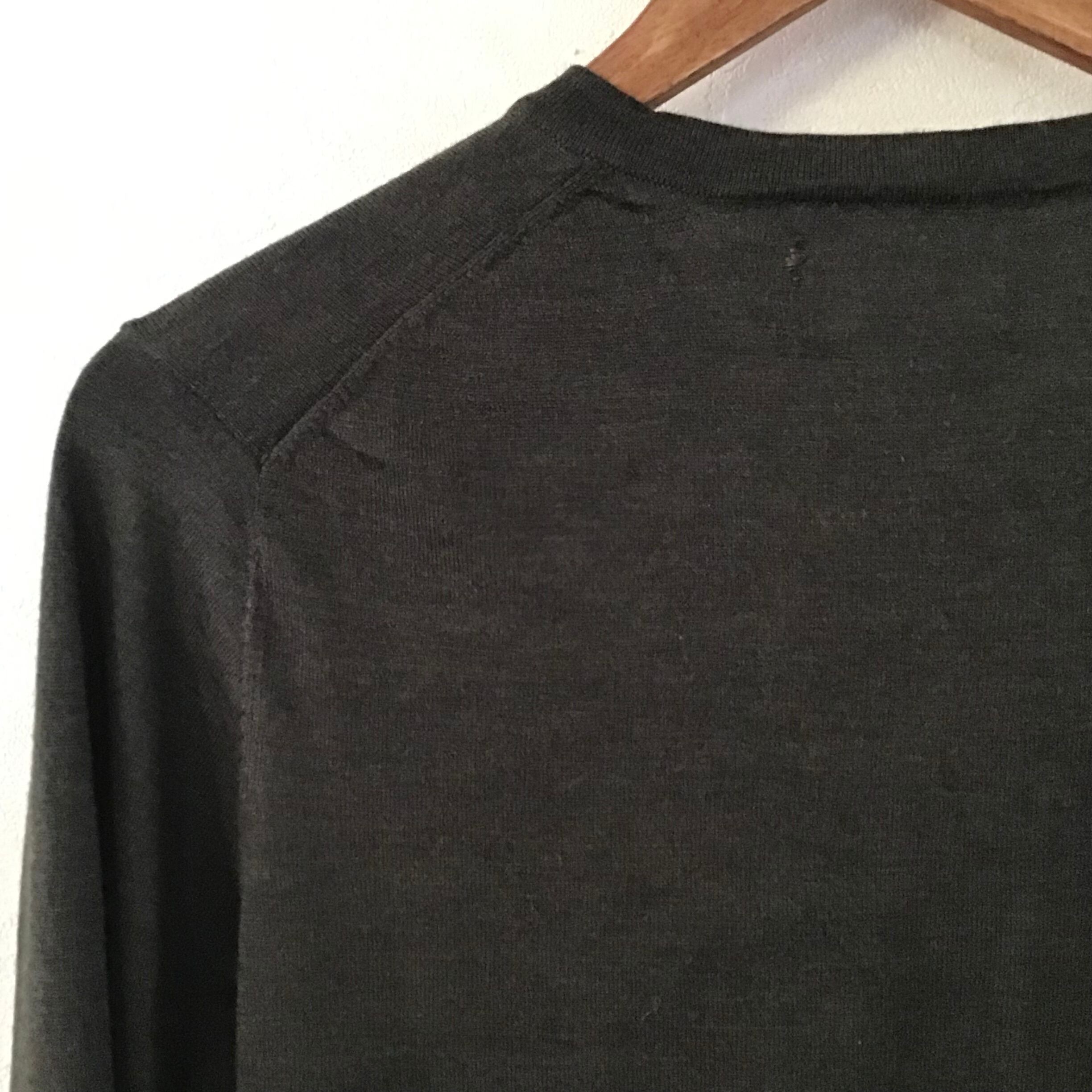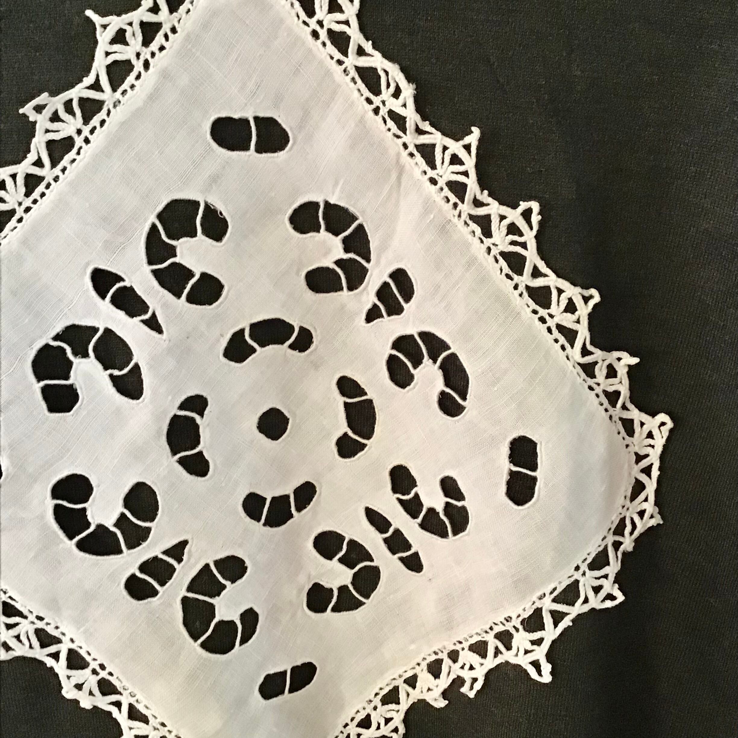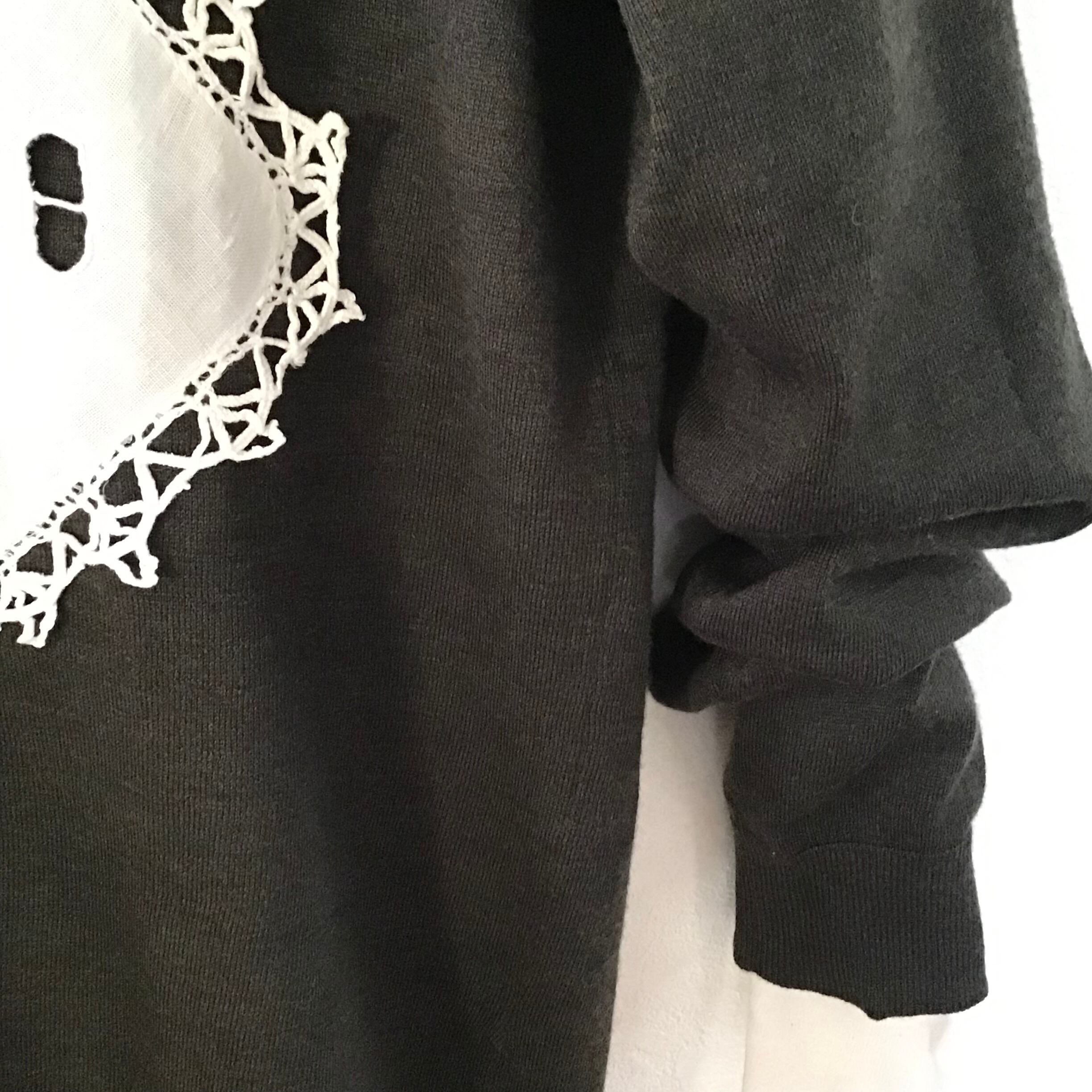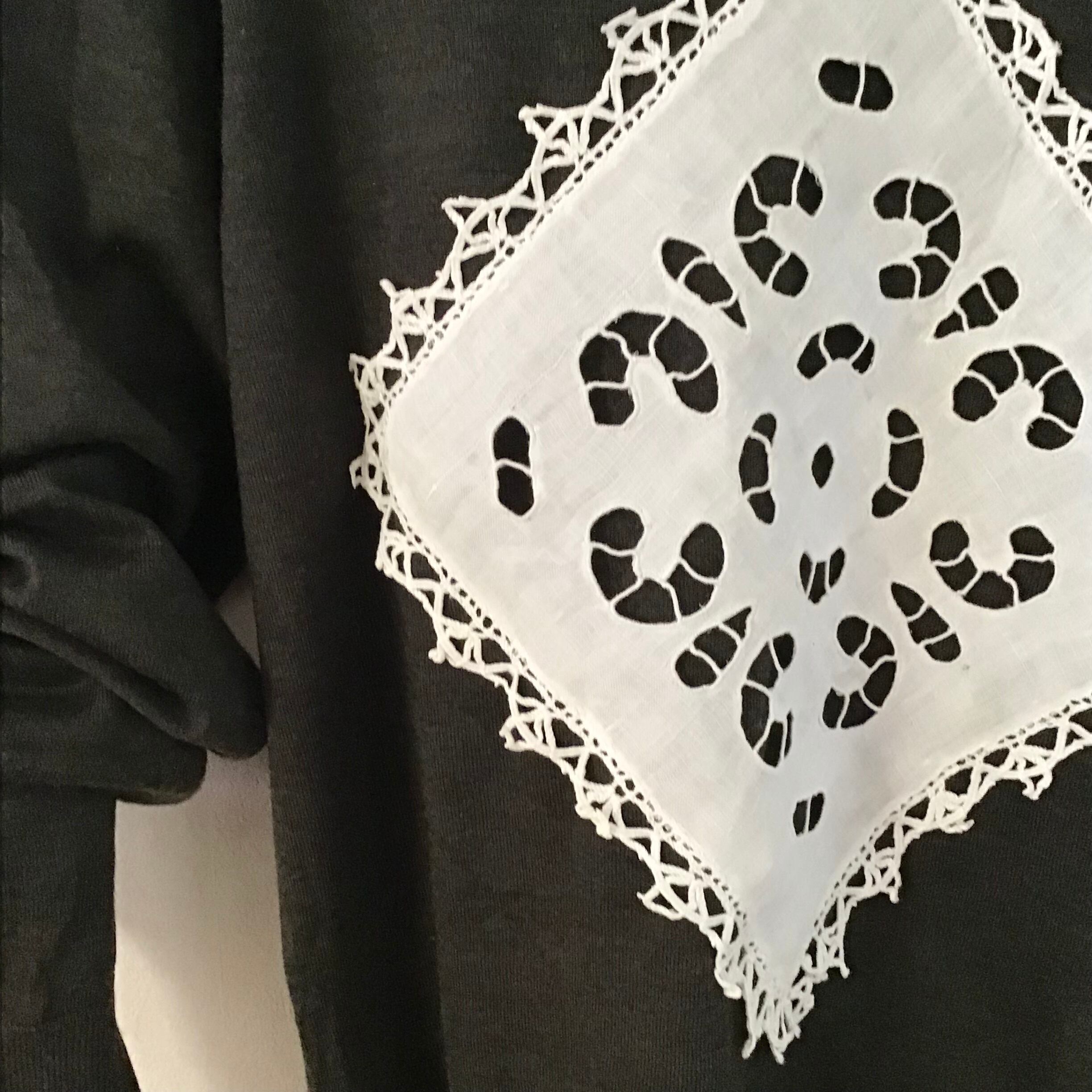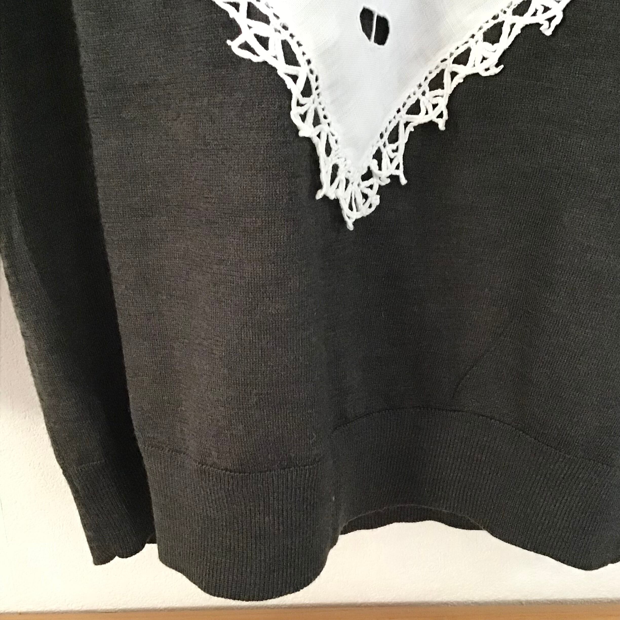 Vネックのウールハイゲージニットにアンティークのコットンクロスをお付けしました。少しグリーンがかった様なチャコールグレーにユニークなウネウネのカットワーク刺繍が可愛いです♡春先まで着られる薄手のニットはスッキリとしたシルエットで使い勝手も良さそうです◎