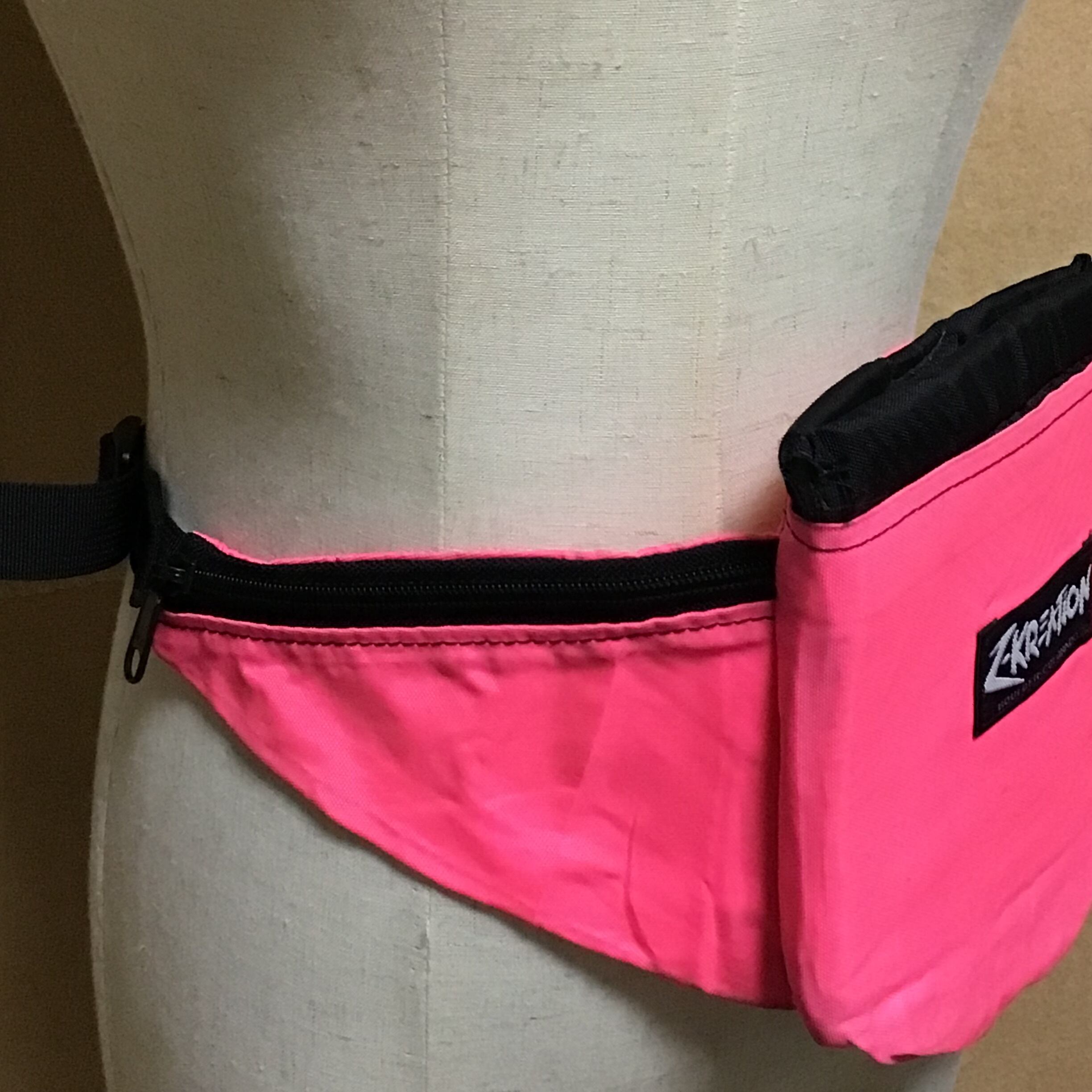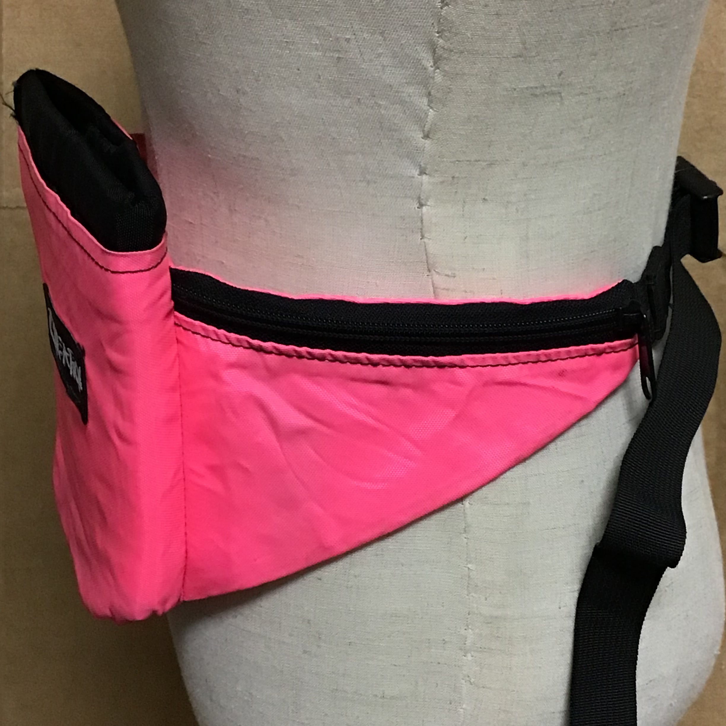 1990年代のウエストバッグ。蛍光ピンクが90年代な雰囲気で、コーディネートが楽しくなるお品です♡真ん中がドリンクホルダーポケット、両サイドにファスナー付きポケットが付いています。ドリンクホルダーポケットはぺちゃんこにするとスマホ入れにちょうど良いです!フェスやライヴで重宝しそうでおすすめです◎