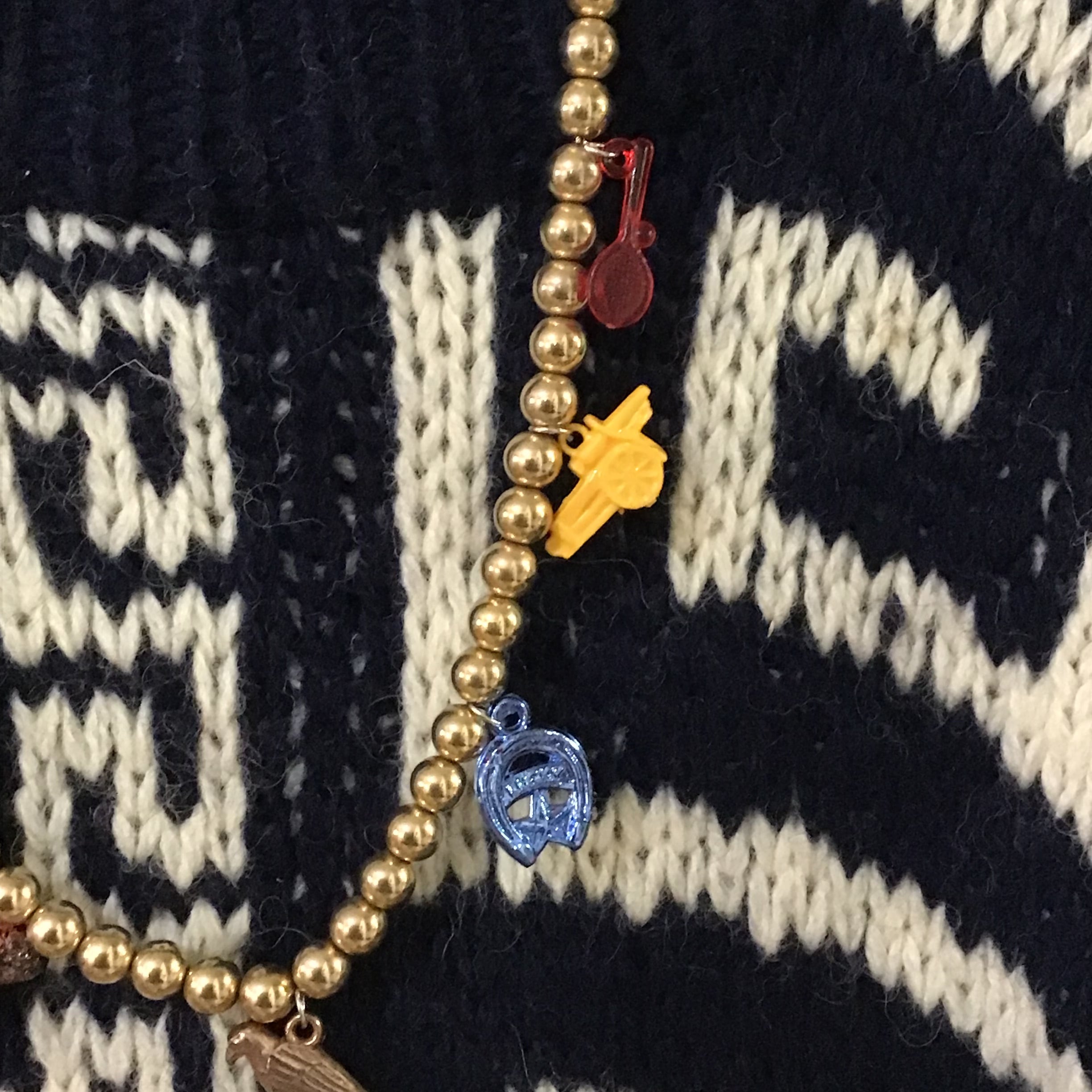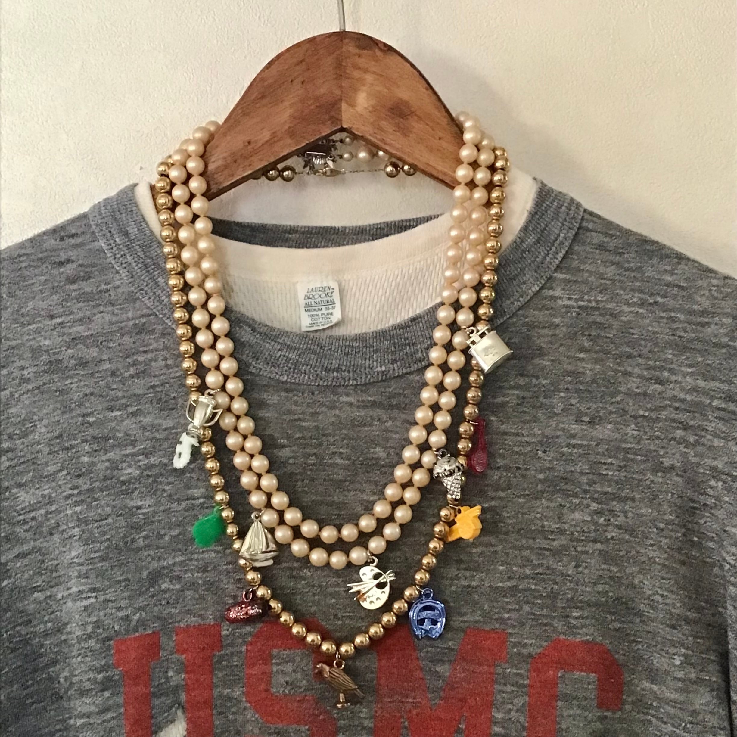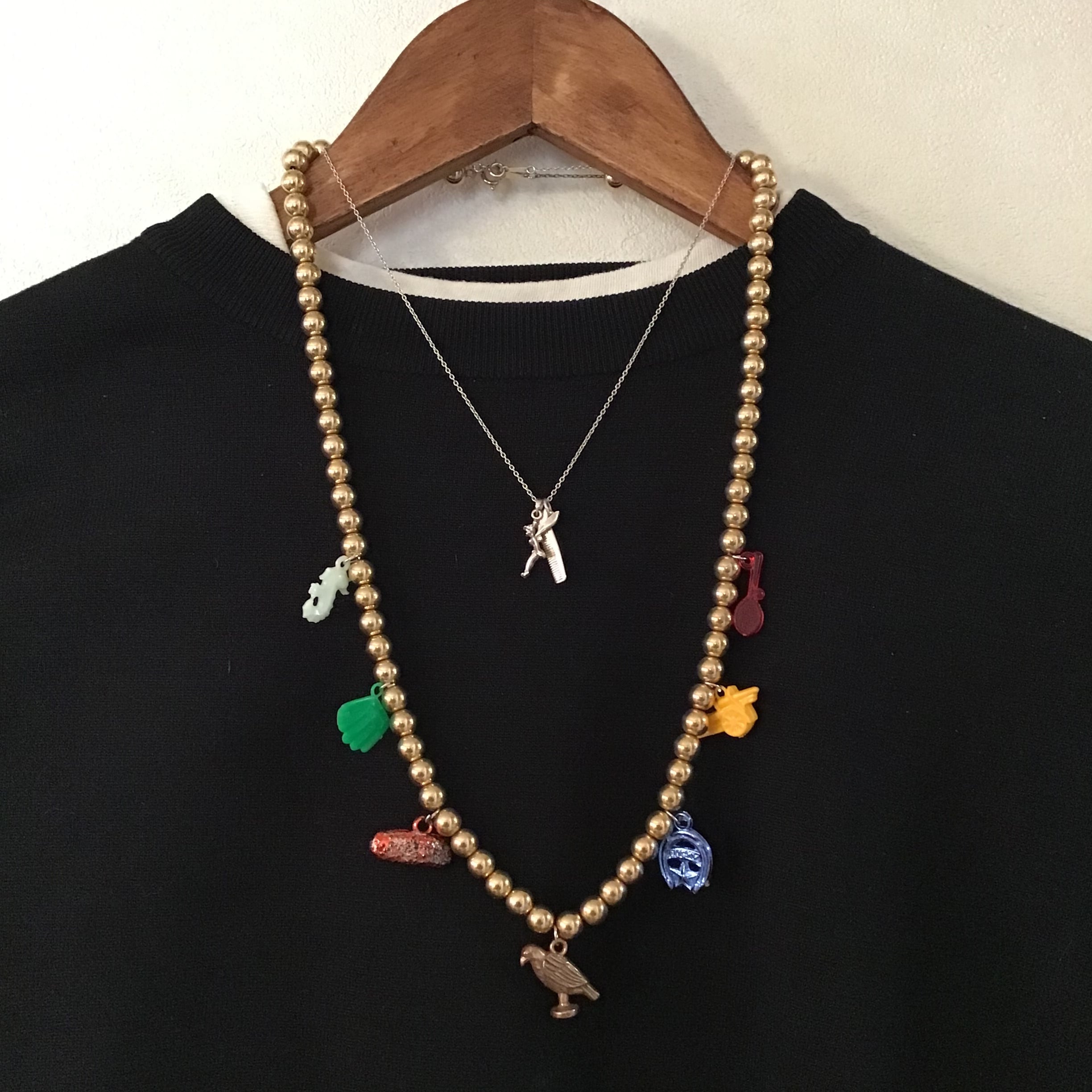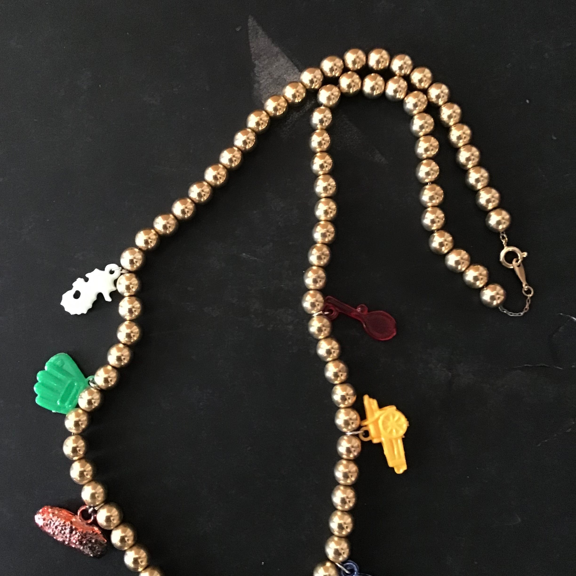 1960年代のプラスチックチャームがついたゴールドビーズのネックレス、軽やかなつけ心地にカラフルなチャーム達が楽しいお品です♡短めのネックレスと合わせたり、シルバーやパールとも相性が良さそうです◎