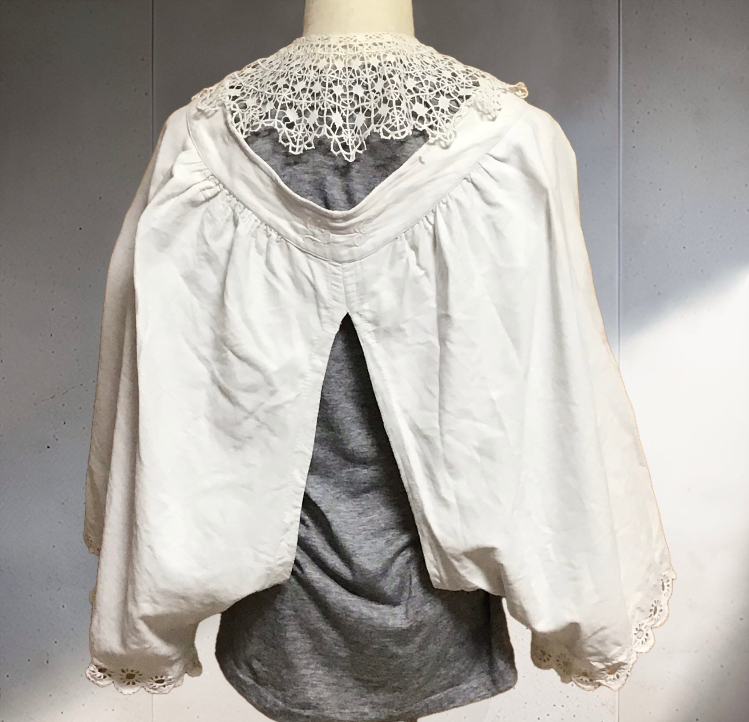1930年代のコットンドロワーズ。コットンネルの様な生地にウエストのイニシャル刺繍や素朴なレース可愛いです♡パンツとしてはもちろん、腕を通してボレロの様に着ると袖のボリュームやふんわりとした丸みのあるシルエットができ、とっても素敵なお品です◎こちらは内股、ウエストにスレがあり、傷みがありますのでお値打ちでご紹介です。