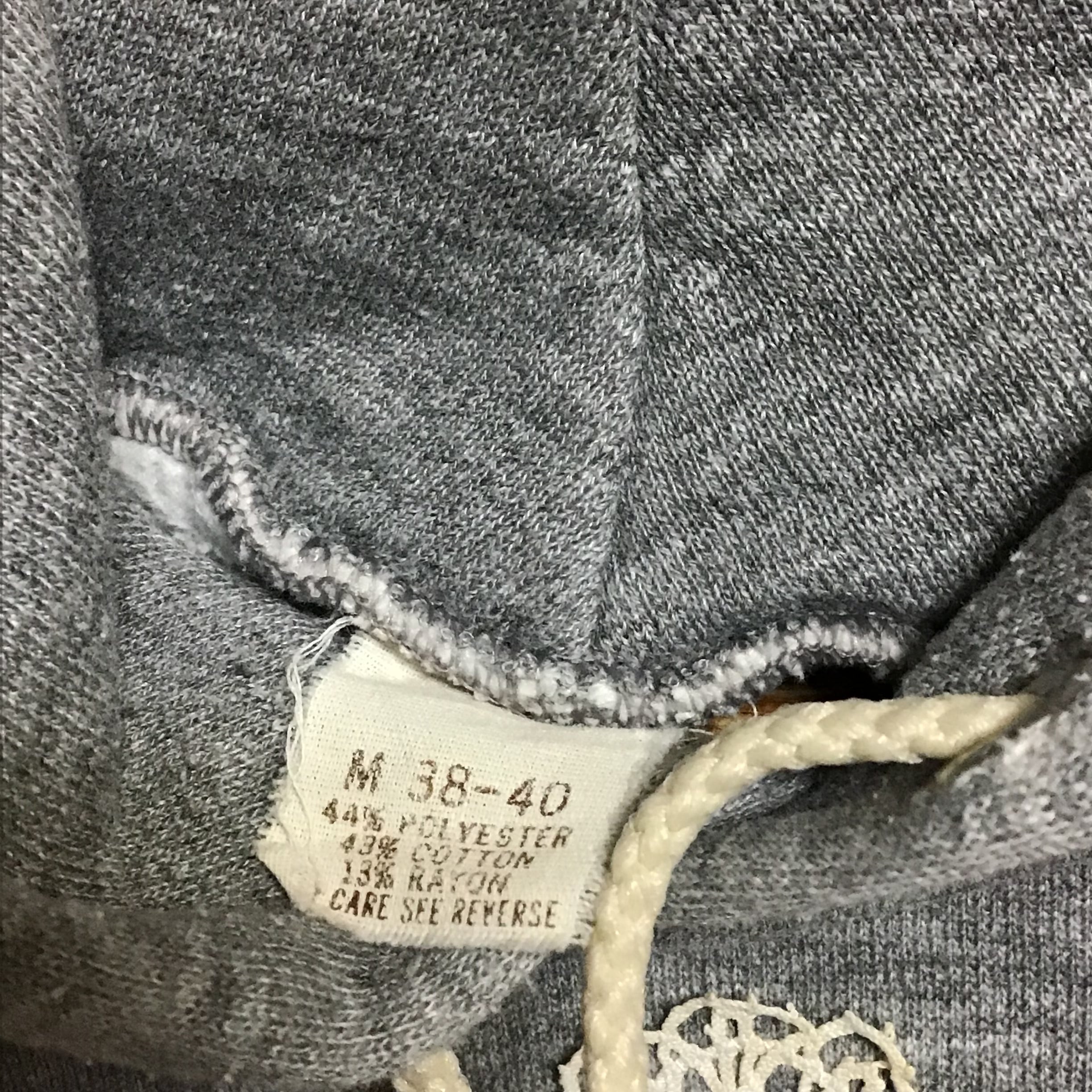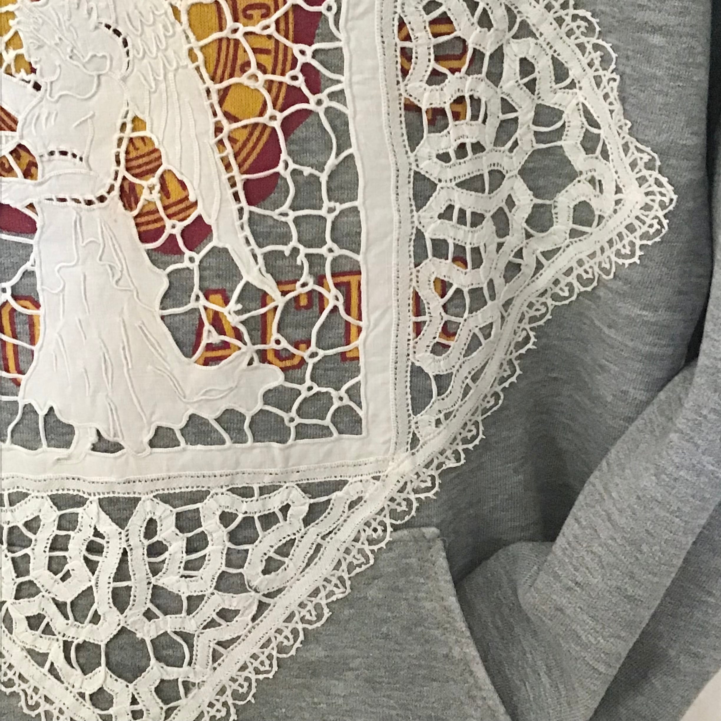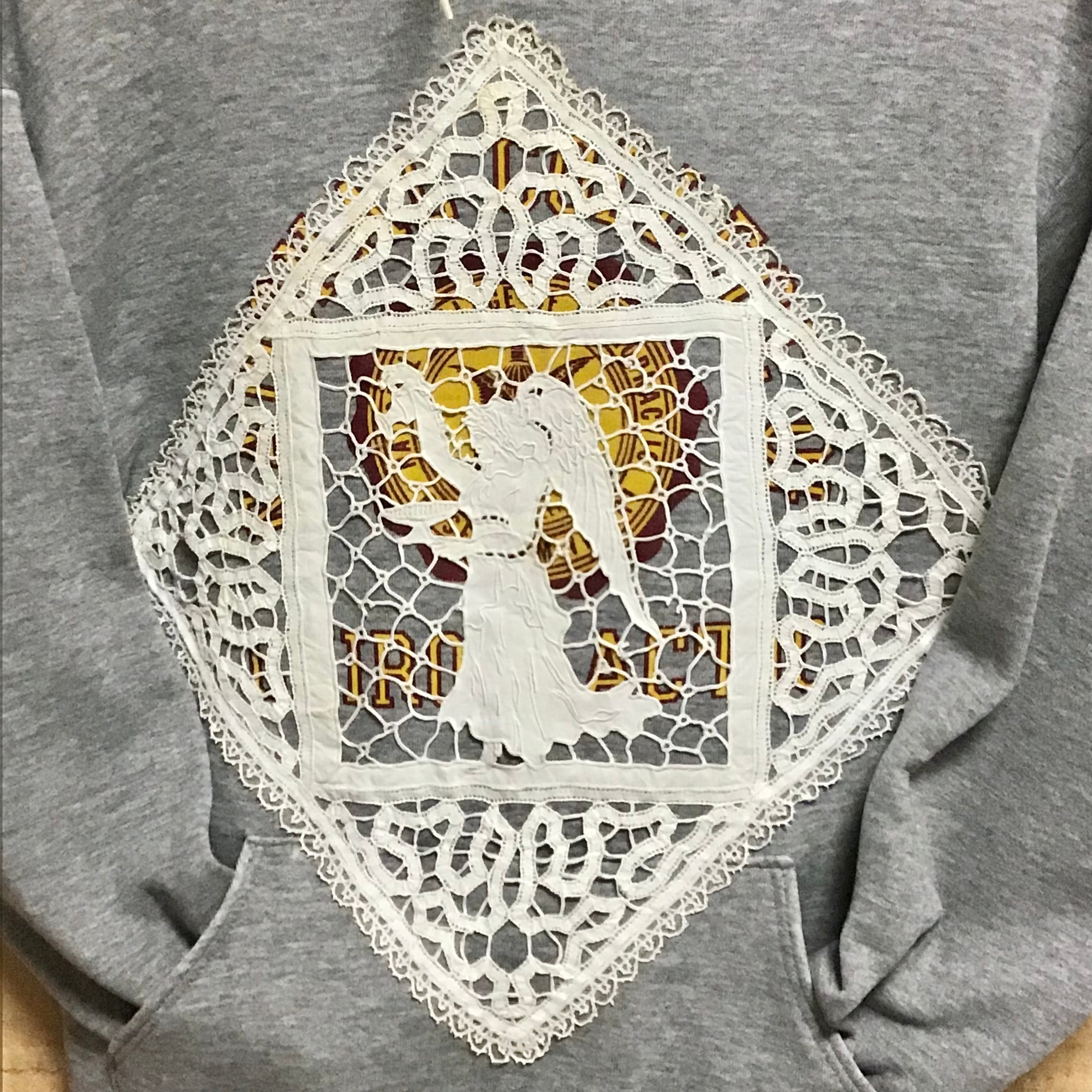 1980年代、杢グレーのスウェットパーカーに天使モチーフのアンティークレースをあしらいました。カレッジプリントの雰囲気、サイズ感もとても良いスウェットです。