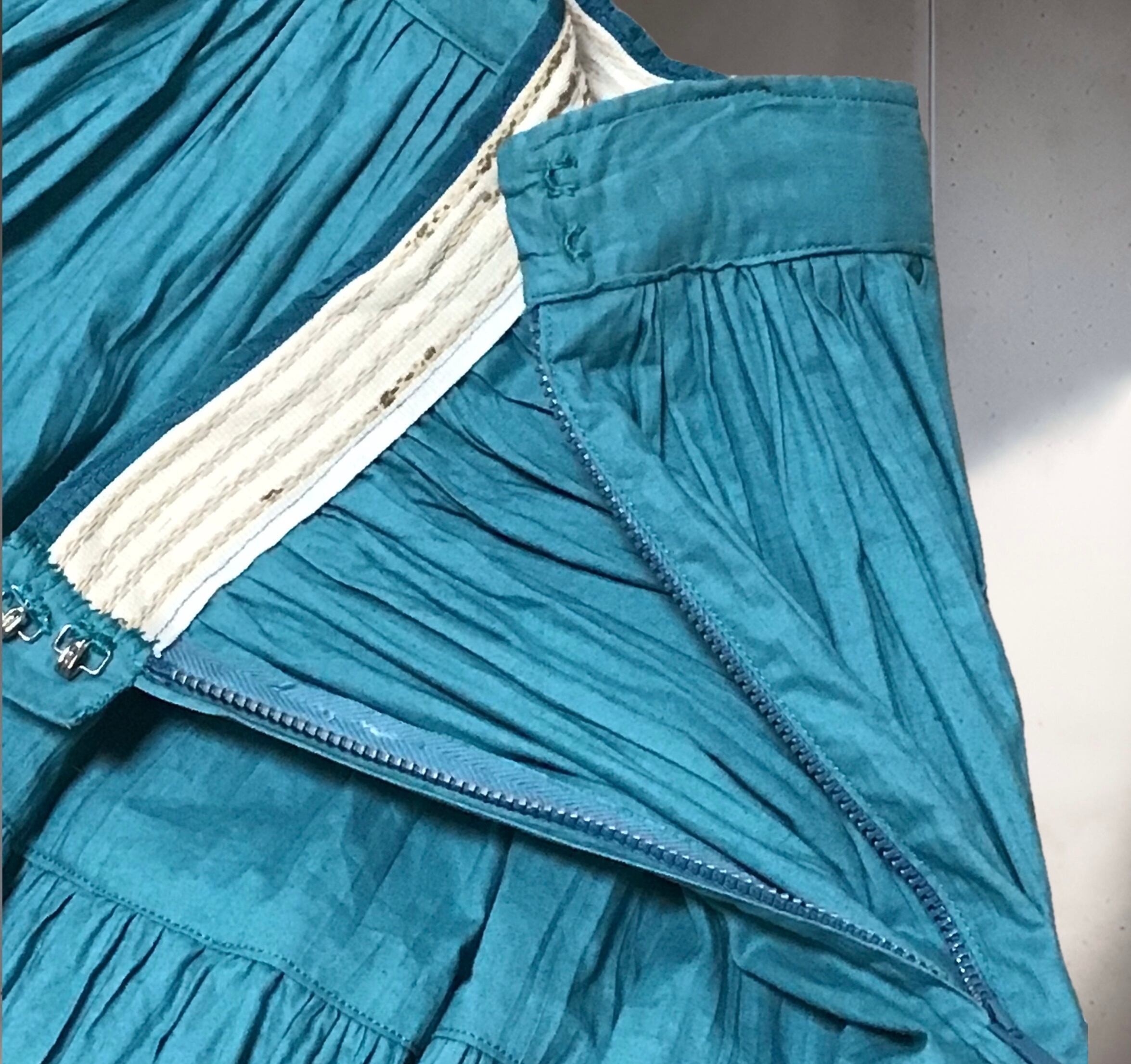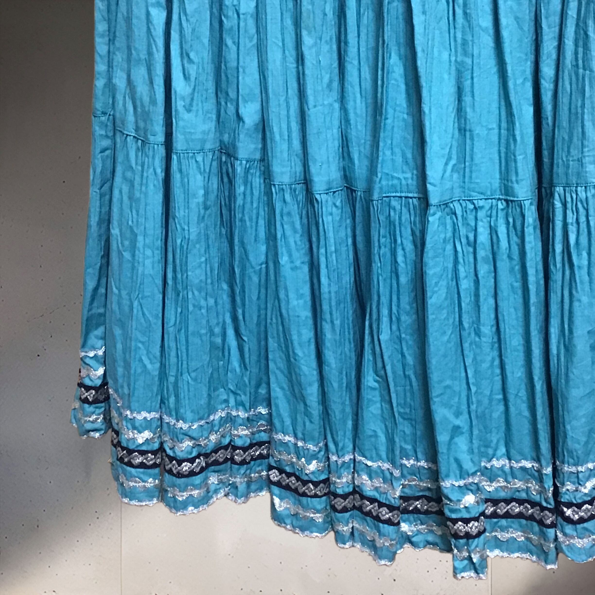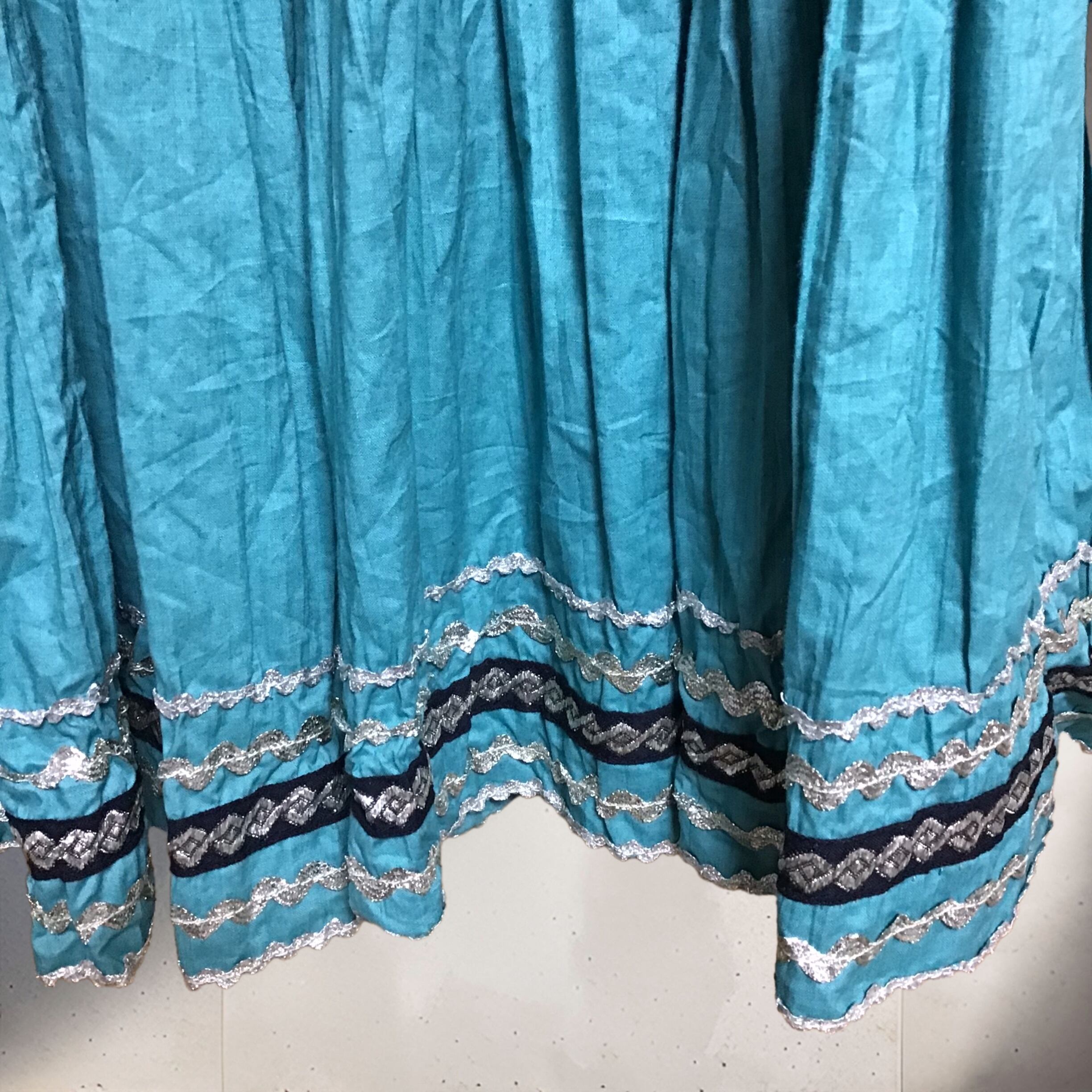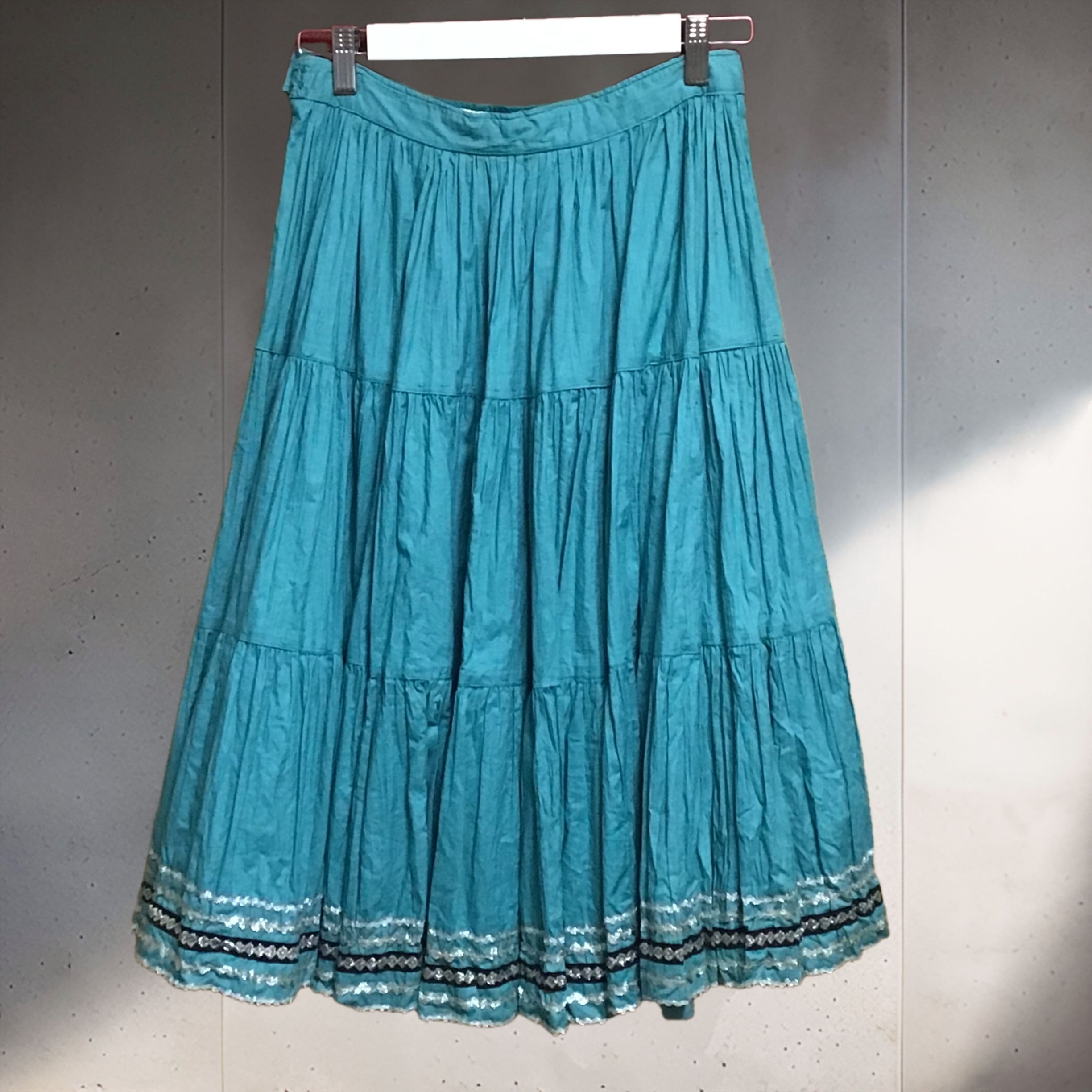 1950年代、少し張り感のあるコットン地のティアードスカート。くすんだターコイズブルーにシルバーと黒のテープがよく合い、ボリュームのあるデザインを引き締めてくれます◎薄すぎないコットン地でオールシーズン履いて頂けます!