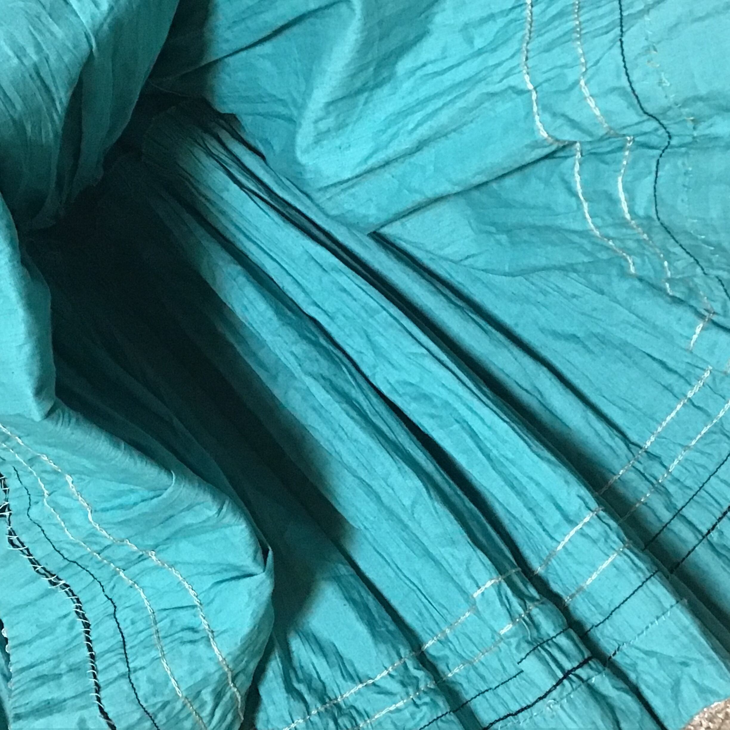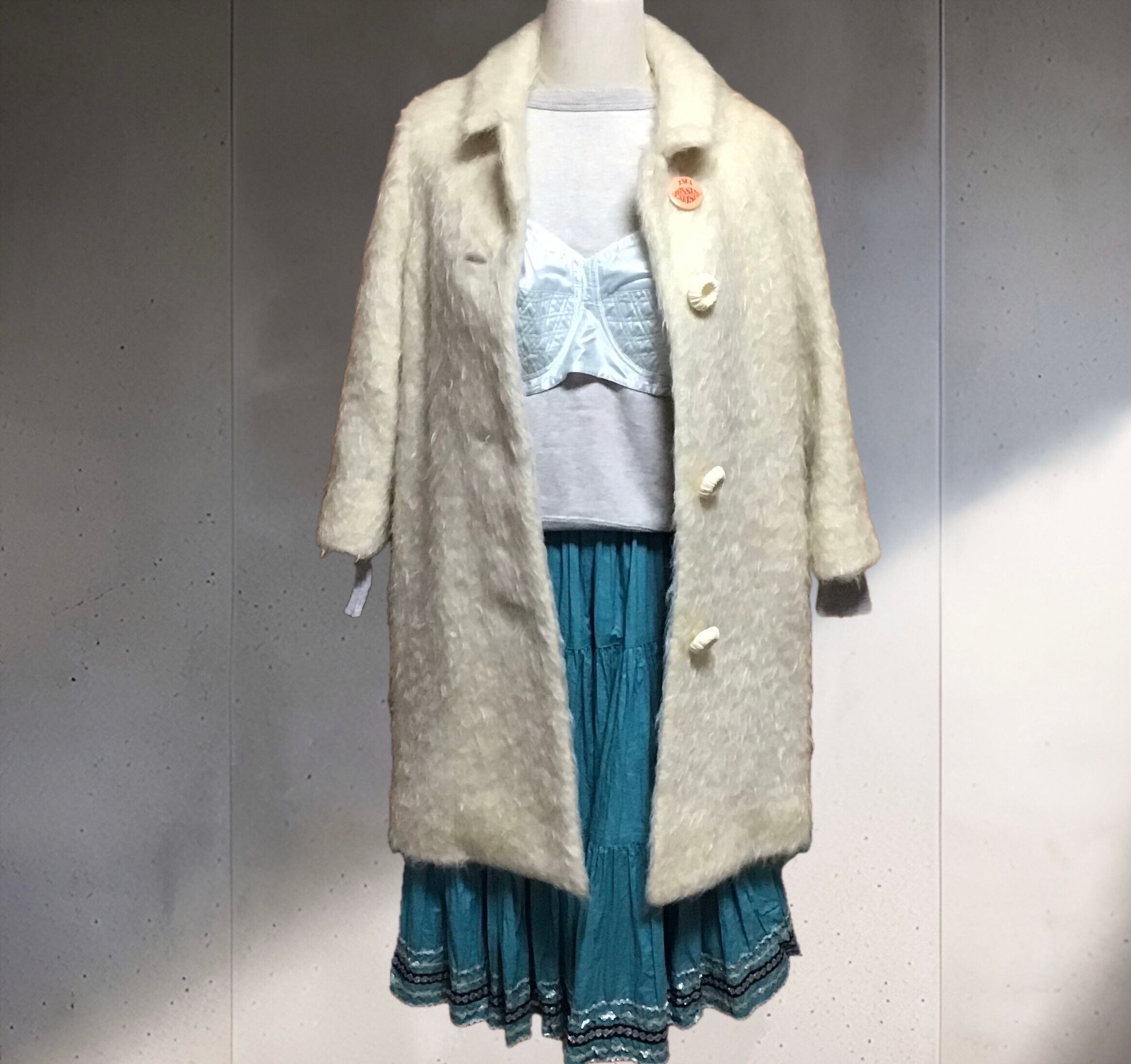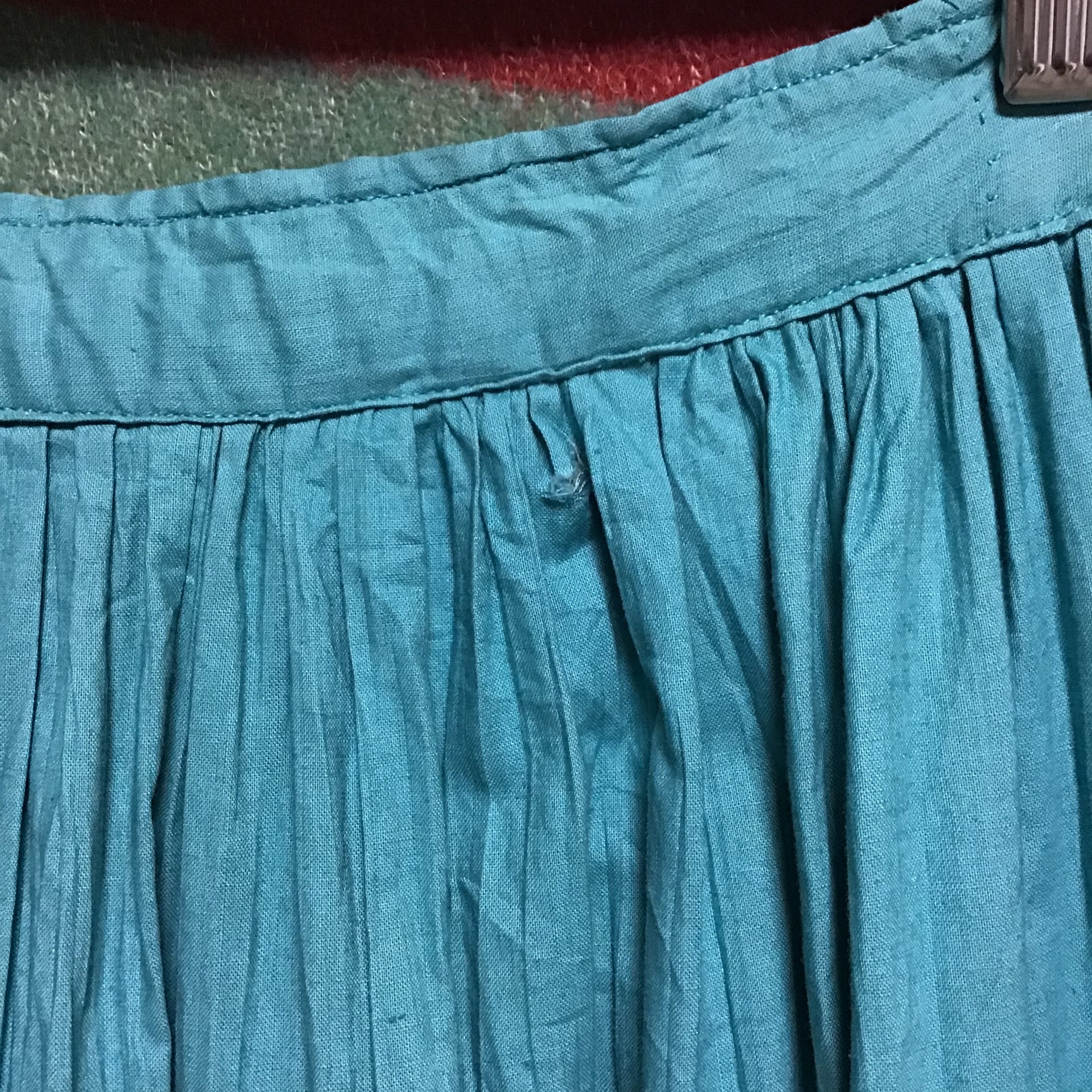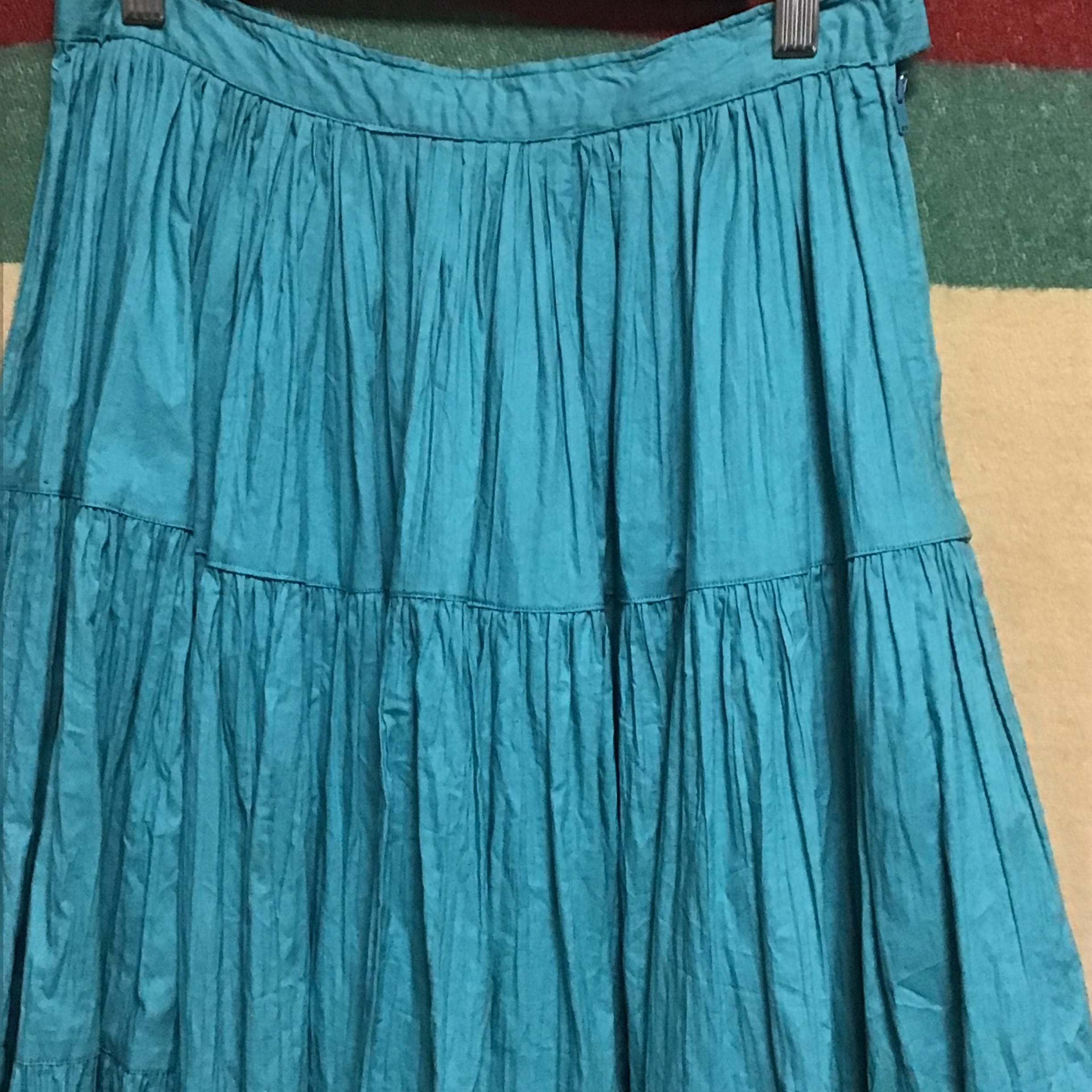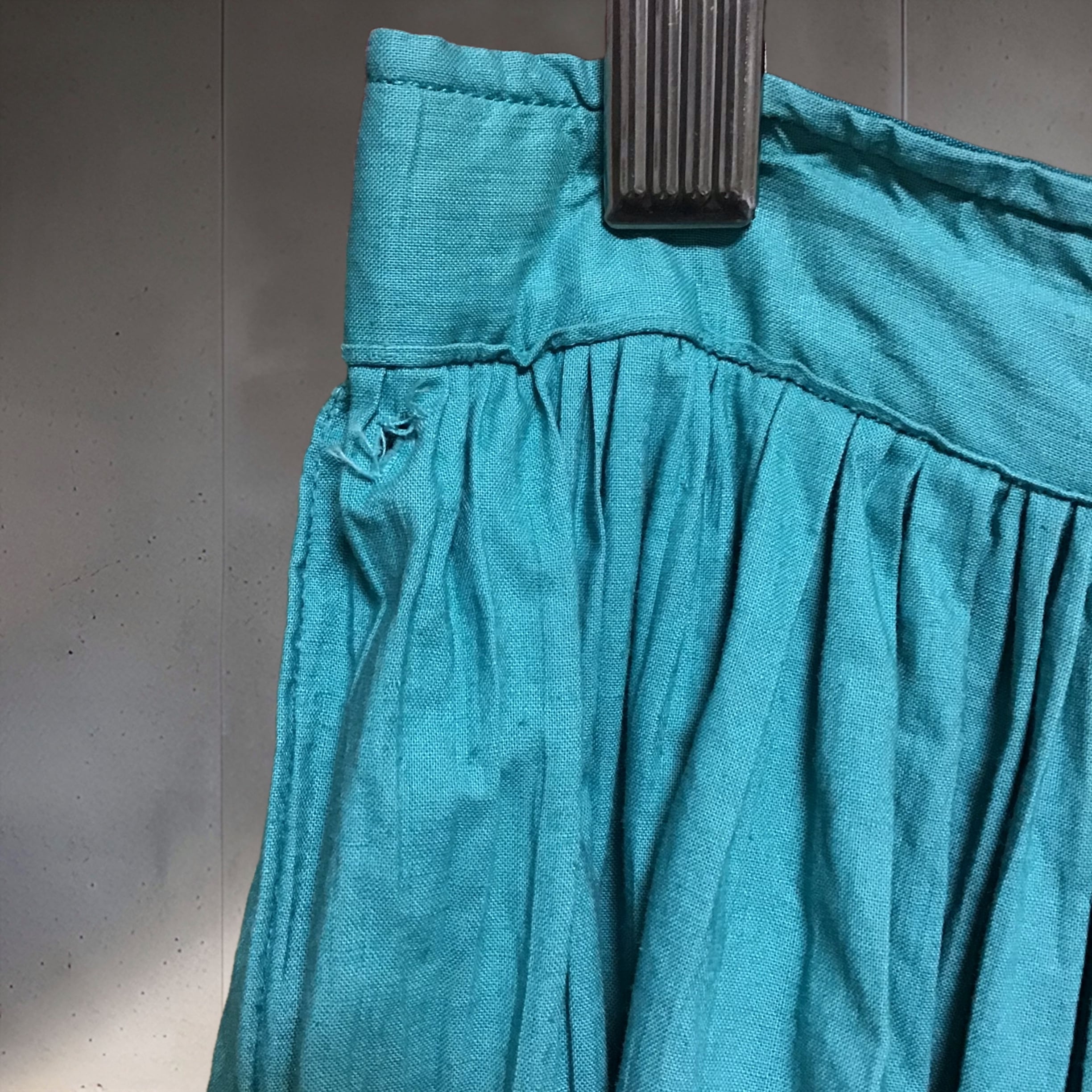 1950年代、少し張り感のあるコットン地のティアードスカート。くすんだターコイズブルーにシルバーと黒のテープがよく合い、ボリュームのあるデザインを引き締めてくれます◎薄すぎないコットン地でオールシーズン履いて頂けます!