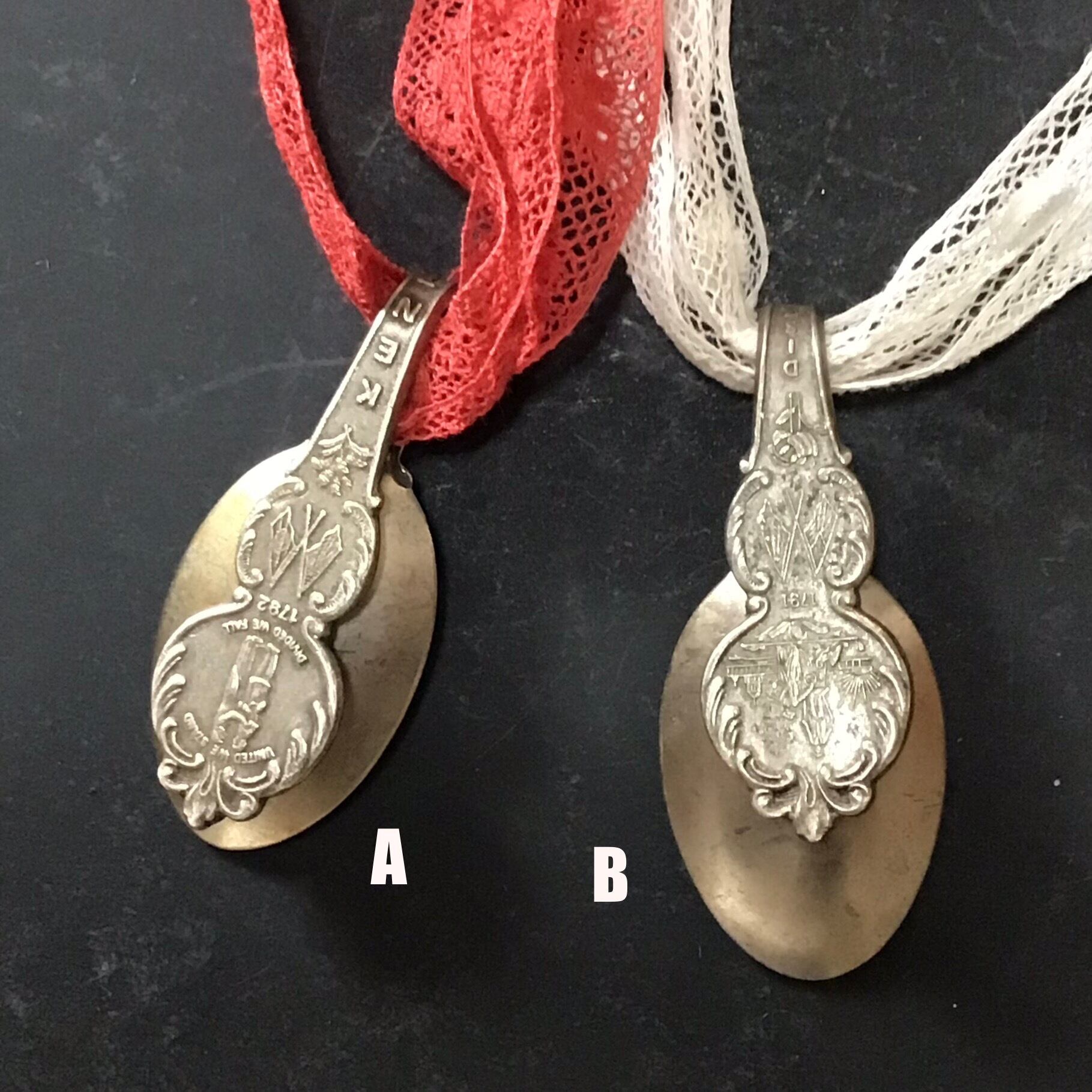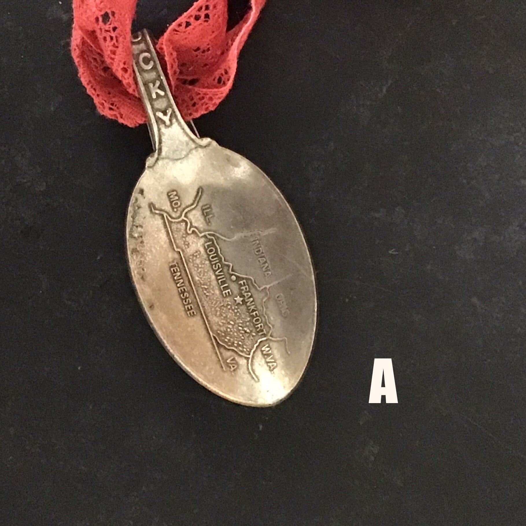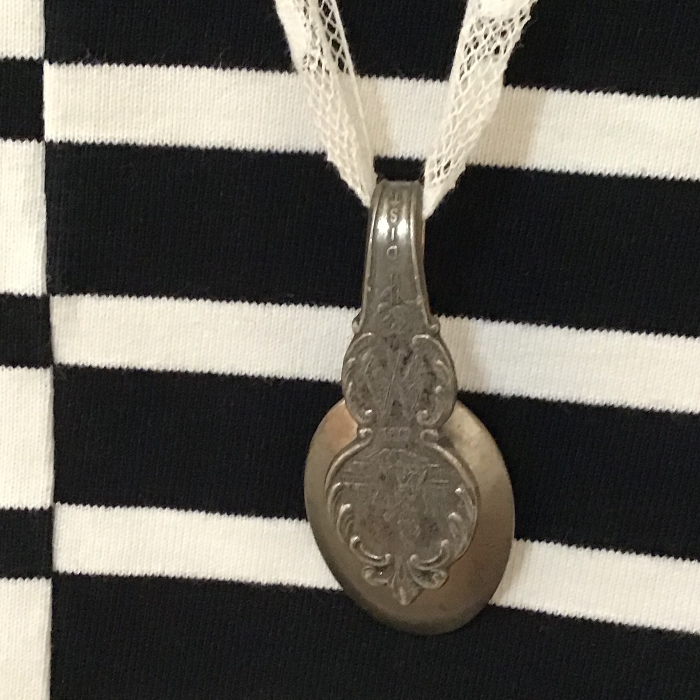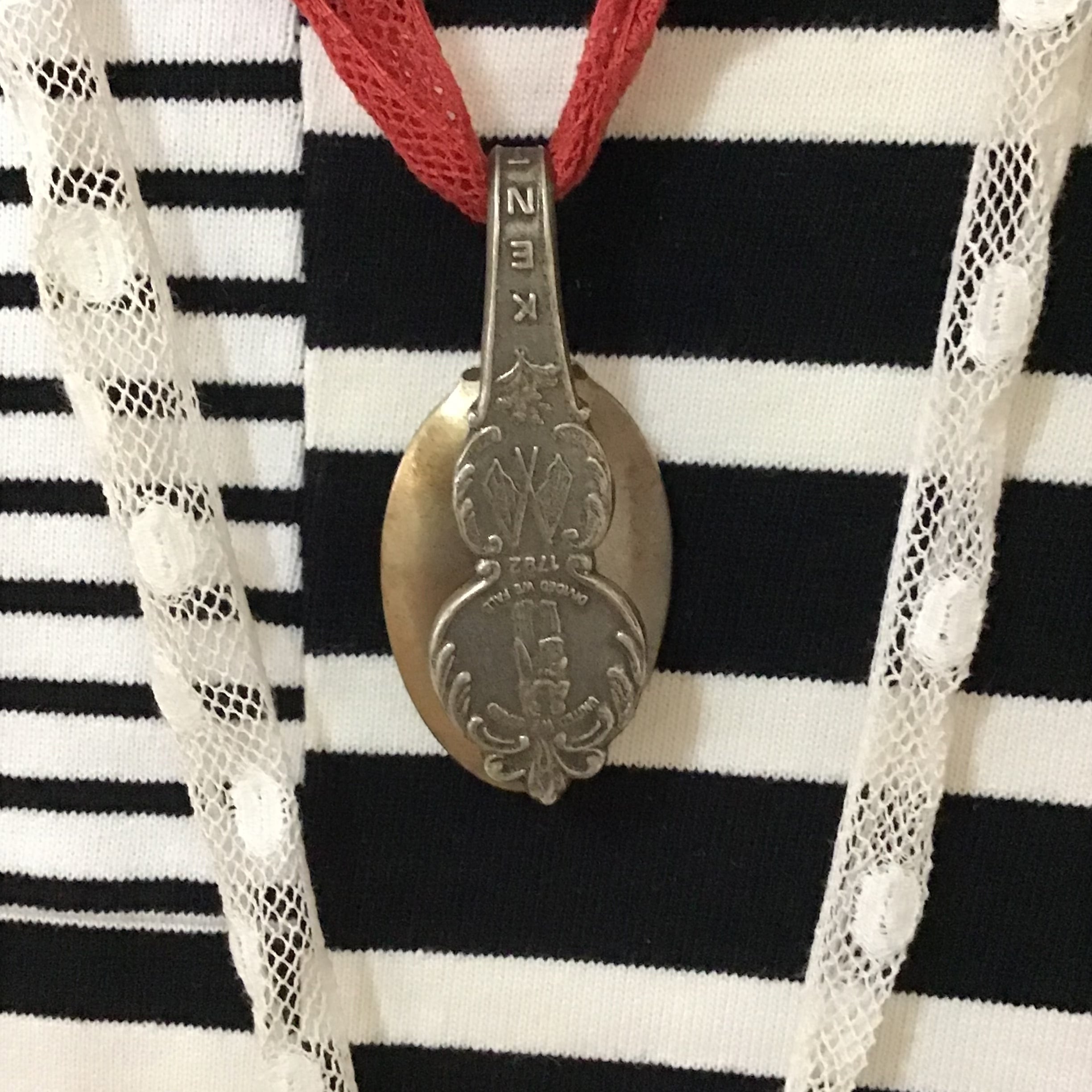 スーベニアスプーンのペンダント、リボンやチェーンに引っ掛けてお使い頂けます。程よく存在感もあり、ヴィンテージらしいコーディネートができおすすめです♡それぞれに白色とテラコッタ色、2色のアンティークリボンをお付けしますのでお好みでお使いください◎お手持ちのチャームを重ねても!
