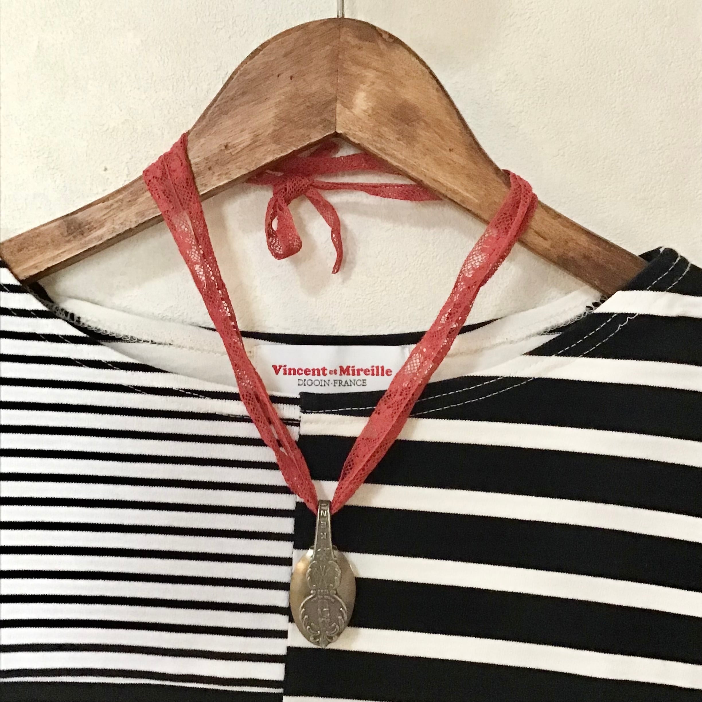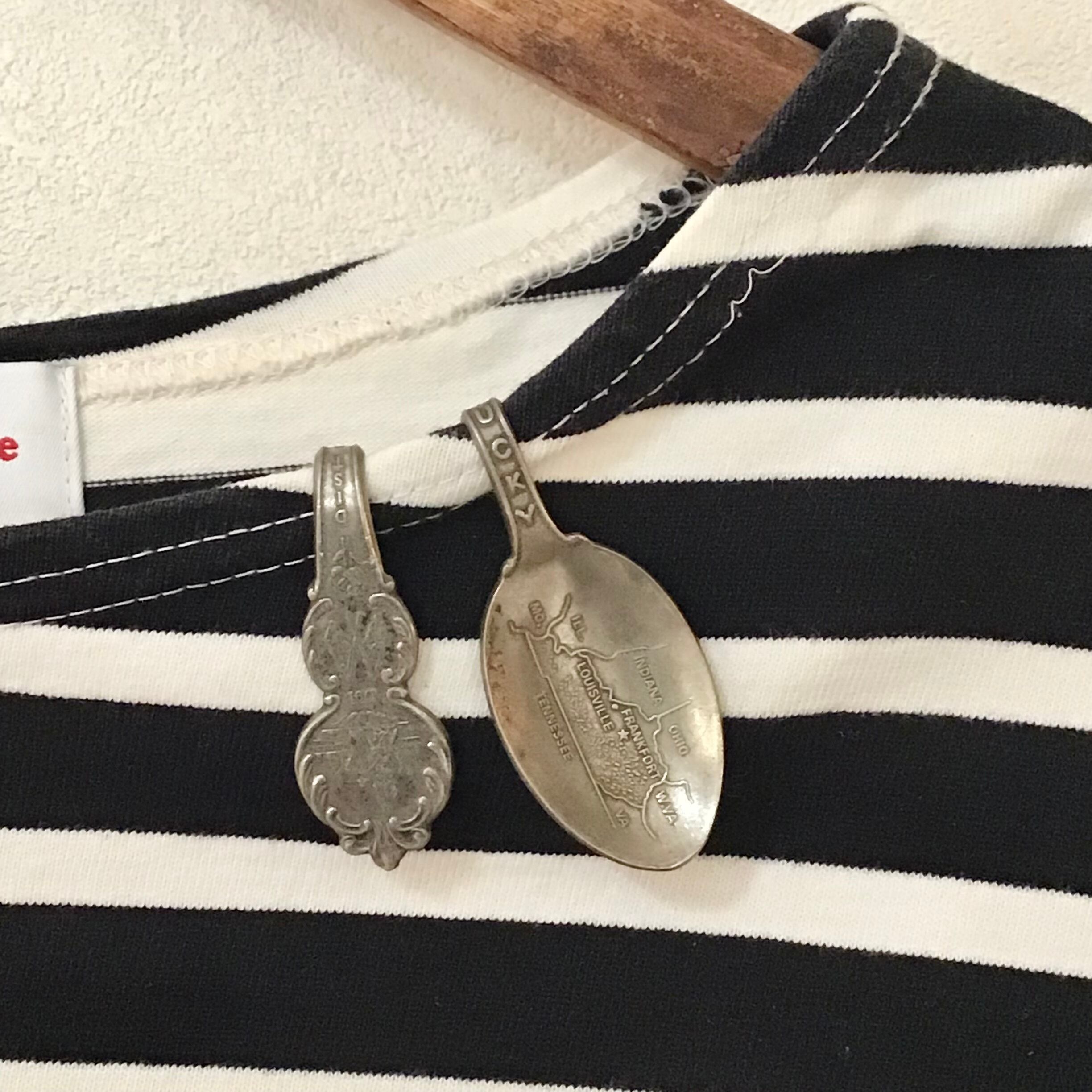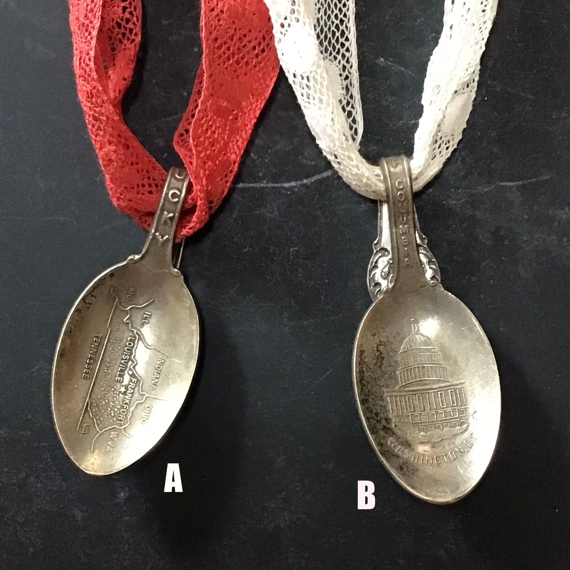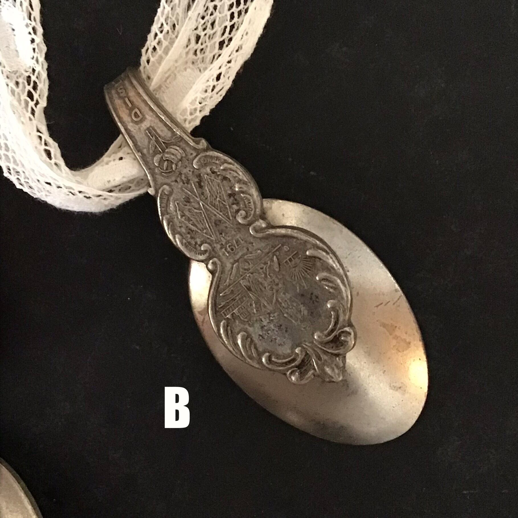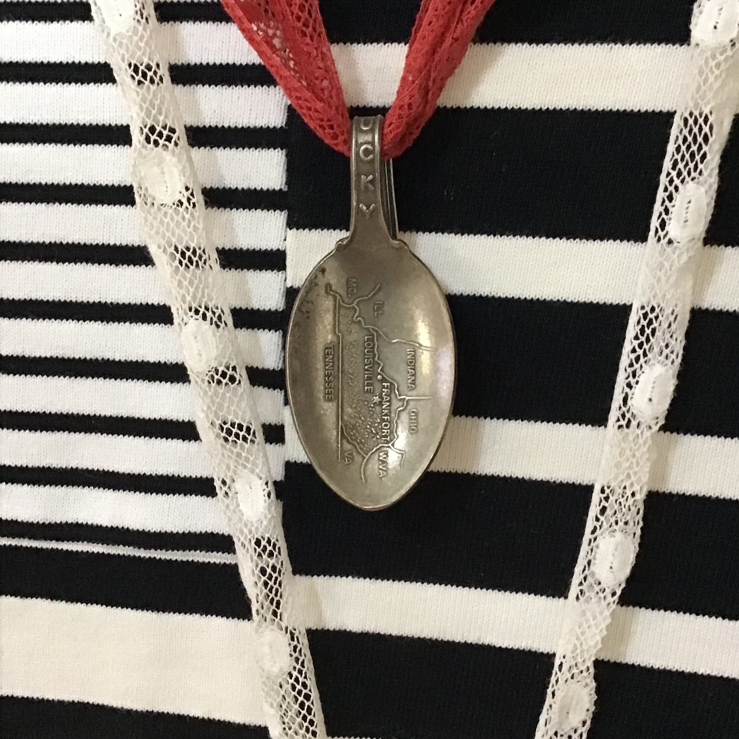スーベニアスプーンのペンダント、リボンやチェーンに引っ掛けてお使い頂けます。程よく存在感もあり、ヴィンテージらしいコーディネートができおすすめです♡それぞれに白色とテラコッタ色、2色のアンティークリボンをお付けしますのでお好みでお使いください◎お手持ちのチャームを重ねても!